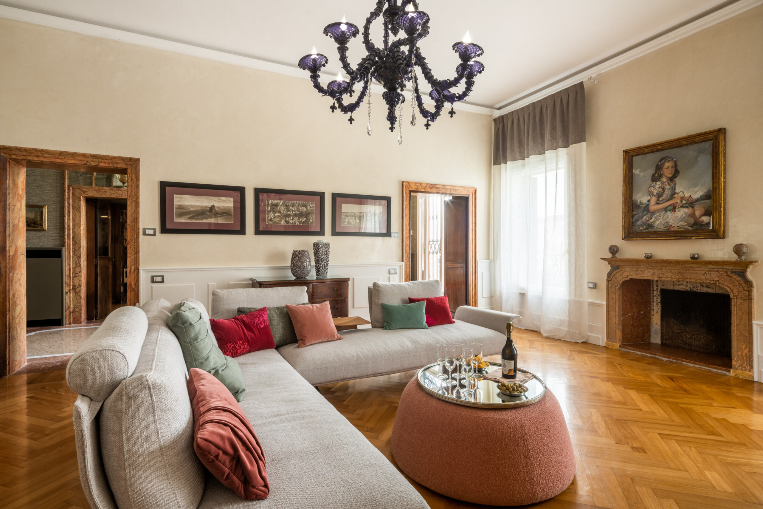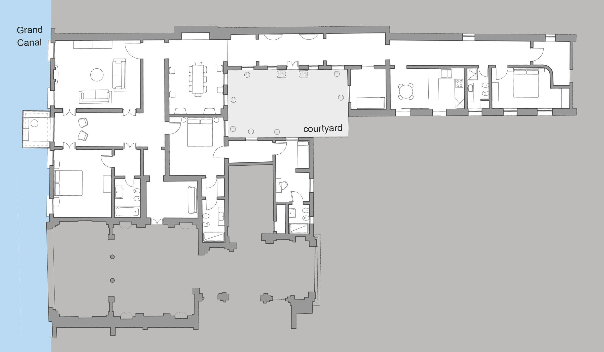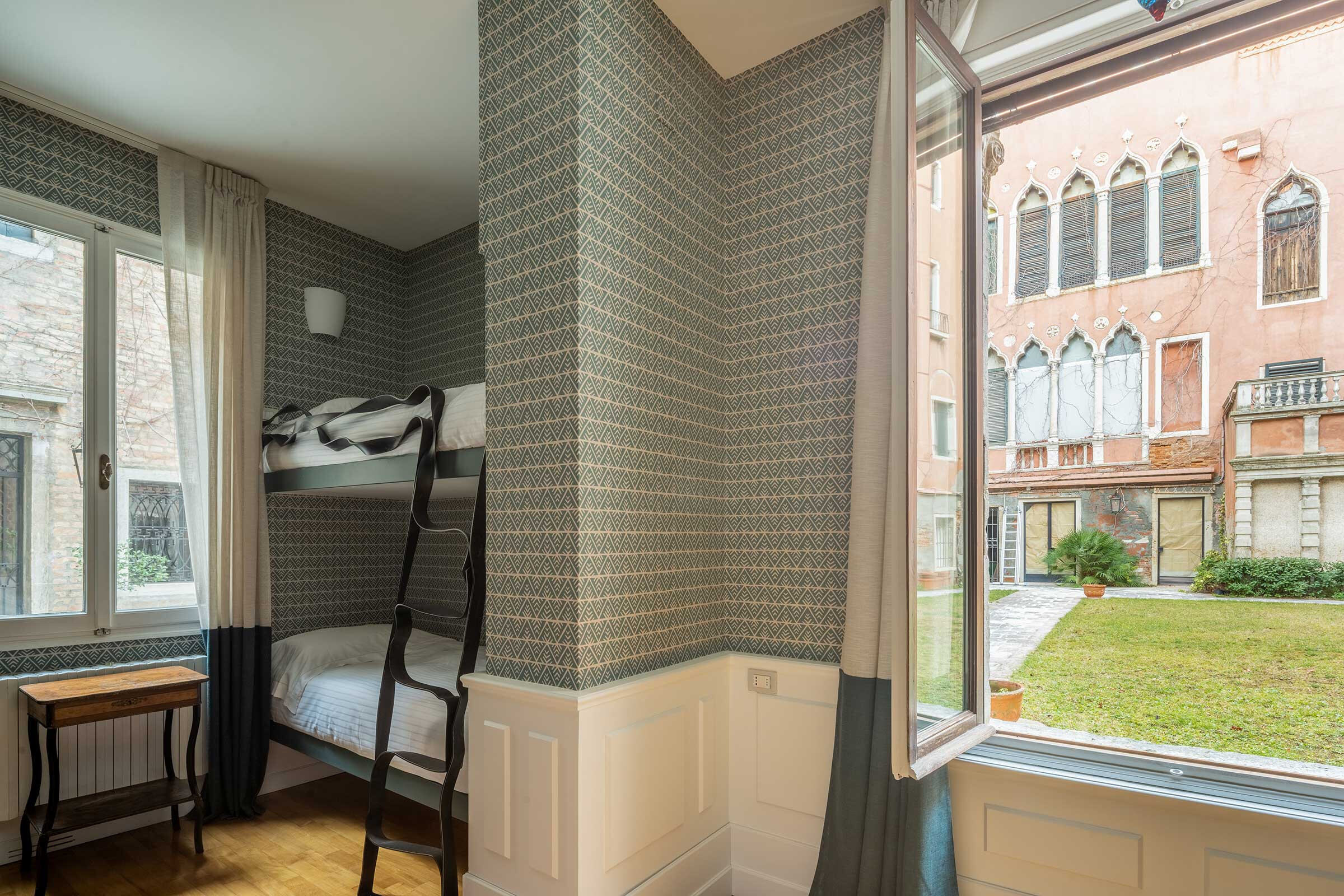 This "museum-like" apartment went through a attentive conservative restoration in 2021, using the best materials and artisans in town, that enahnced its beauty. It is composed of a beautiful entrance hall that opens on the terrace and on the Grand Canal, a spacious living room also with view on the Canal Grande, a luminous dining room, a fully-equipped kitchen with glass table and an internal courtyard with table and chairs. There is a spacious master bedroom that faces the Grand Canal with en-suite bathroom, a second double bedroom with en-suite bathroom that is connected through a corridor to the third smaller bedroom equipped with bunk beds and en-suite bathroom, a fourth bedroom with king size bed served by a fourth bathroom toward the back of the house, a fifth bedroom with single bed. The kitchen is spacious and well equipped with large fridge, dishwasher, 4-burner induction stoves, oven, kettle, Italian and American coffee maker and every possible electrical appliance.