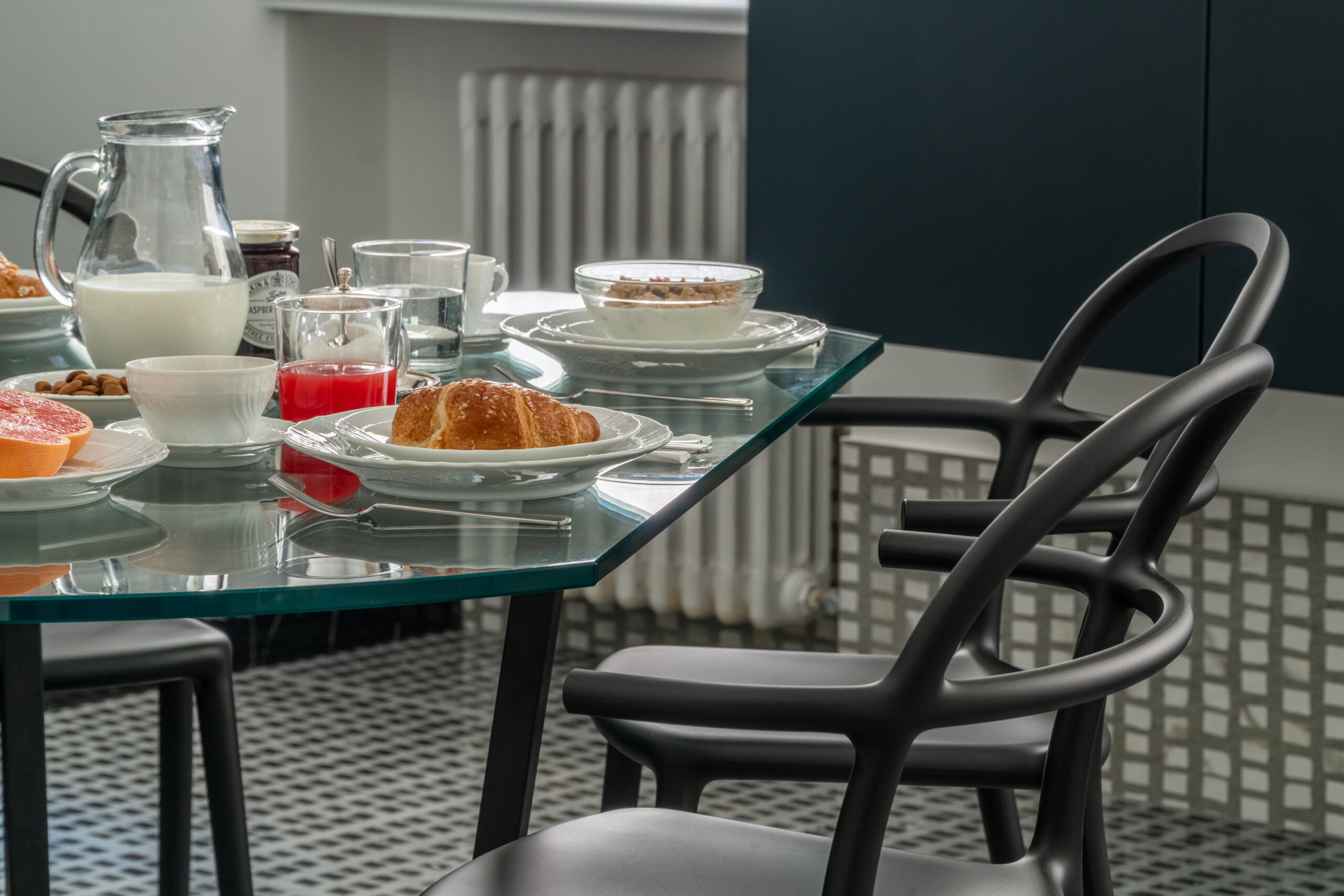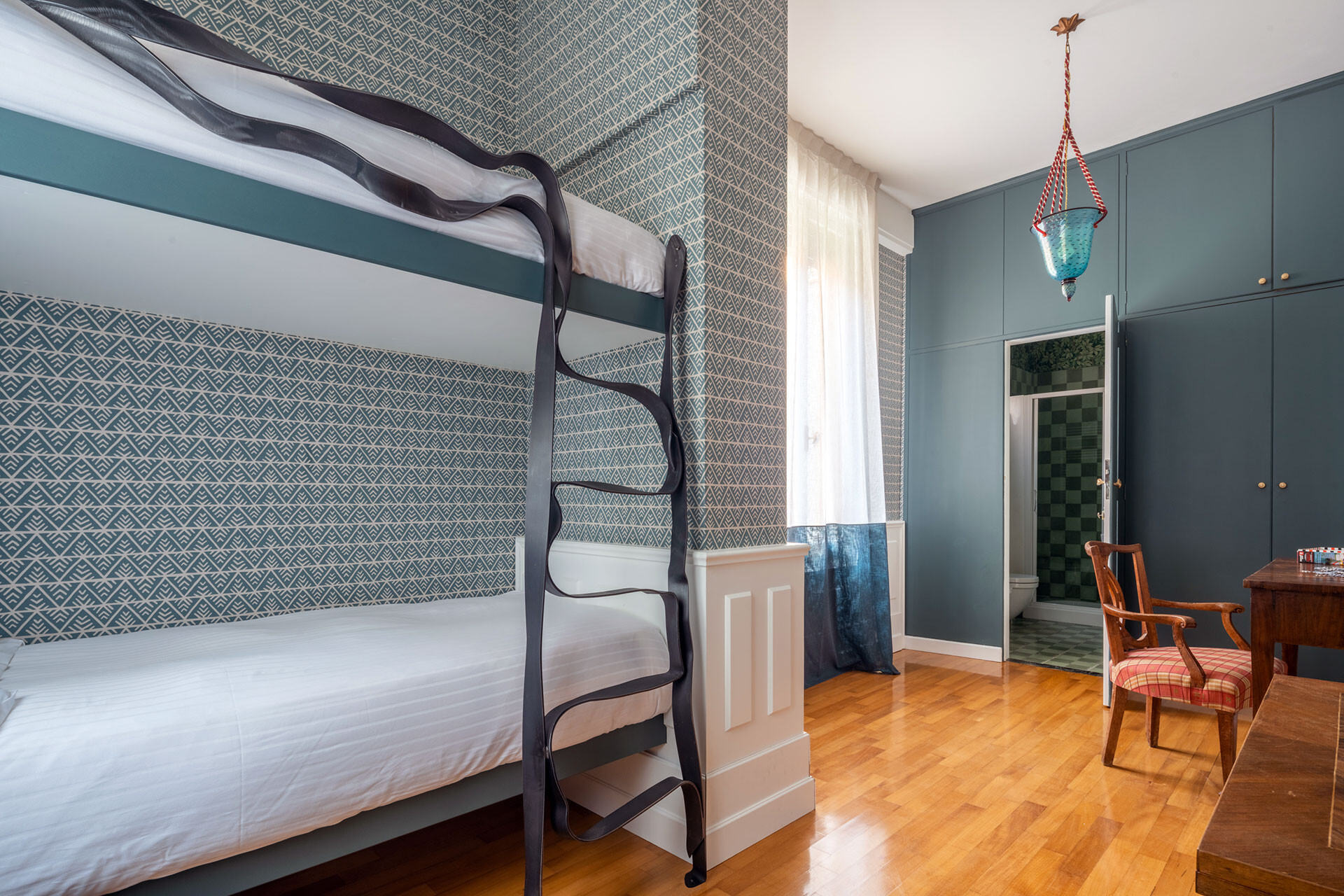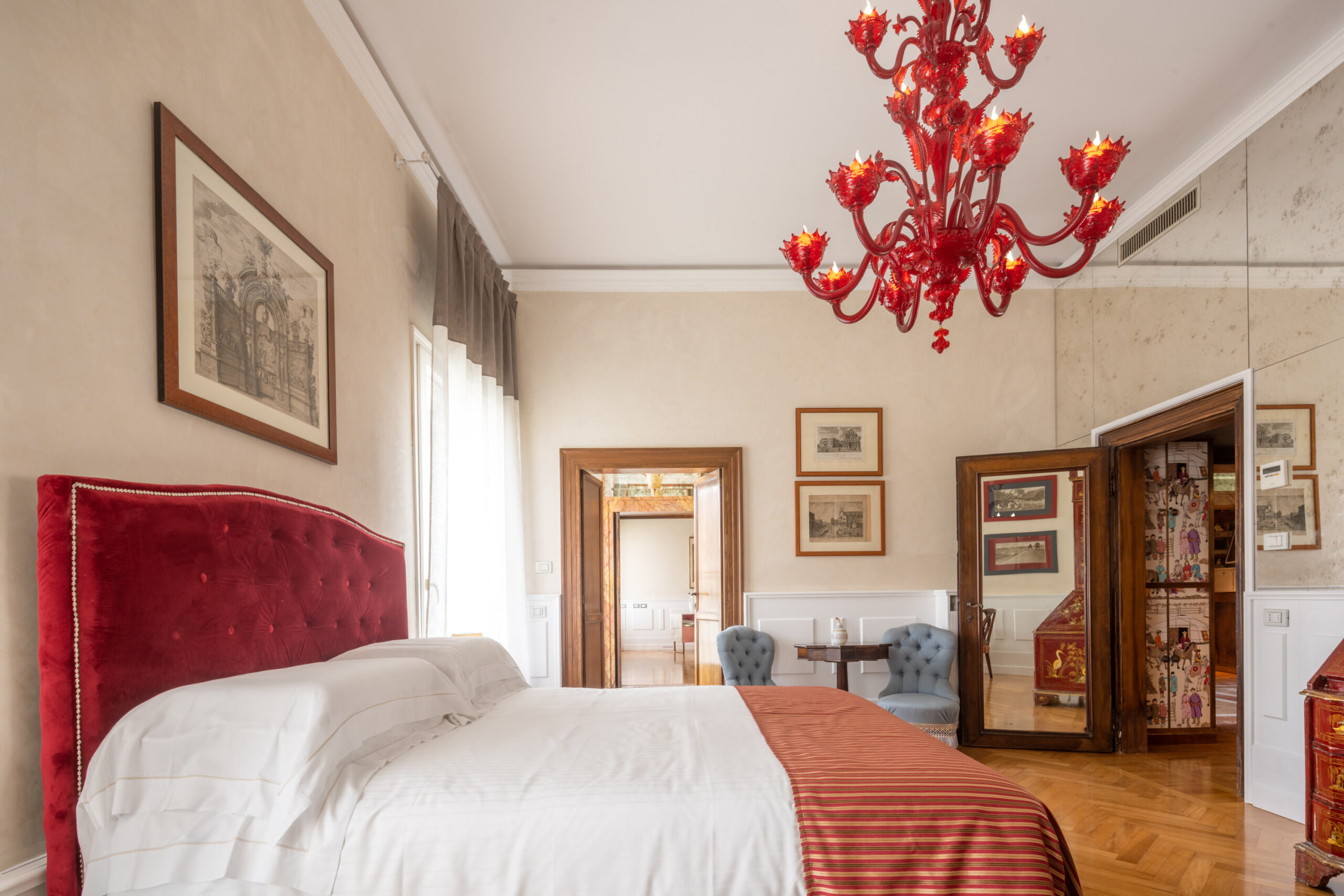 This "museum-like" apartment went through a attentive conservative restoration in 2021, using the best materials and artisans in town, that enahnced its beauty. It is composed of a beautiful entrance hall that opens on the terrace and on the Grand Canal, a spacious living room also with view on the Canal Grande, a luminous dining room, a fully-equipped kitchen with glass table and an internal courtyard with table and chairs. There is a spacious master bedroom that faces the Grand Canal with en-suite bathroom, a second double bedroom with en-suite bathroom that is connected through a corridor to the third smaller bedroom equipped with bunk beds and en-suite bathroom, a fourth bedroom with king size bed served by a fourth bathroom toward the back of the house, a fifth bedroom with single bed. The kitchen is spacious and well equipped with large fridge, dishwasher, 4-burner induction stoves, oven, kettle, Italian and American coffee maker and every possible electrical appliance.