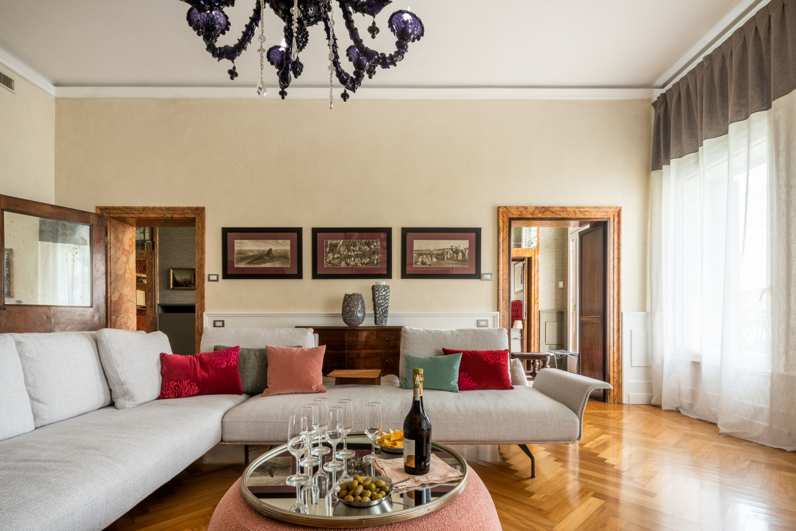 This exclusive apartment is laid-out on almost 400 square meters, granting full privacy and comfort to 6 people but it can host up to 9 people in 5 bedrooms and 4 bathrooms. The rental fee quoted on the apartment page is for maximum 6 people, whereas a 10% surcharge will be applied for each guest above the 6th. We can offer a 10% price reduction if no more than 2 guests stay at this property.