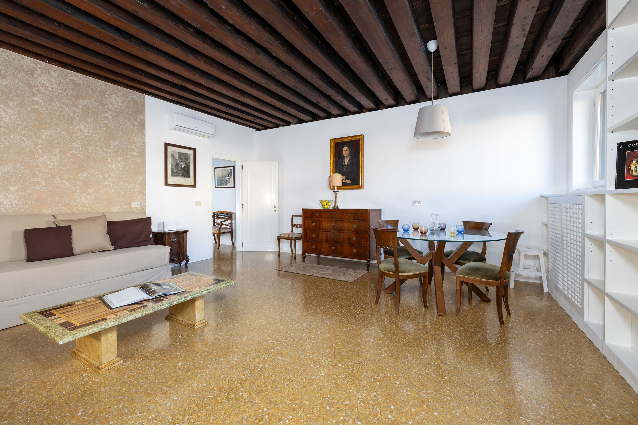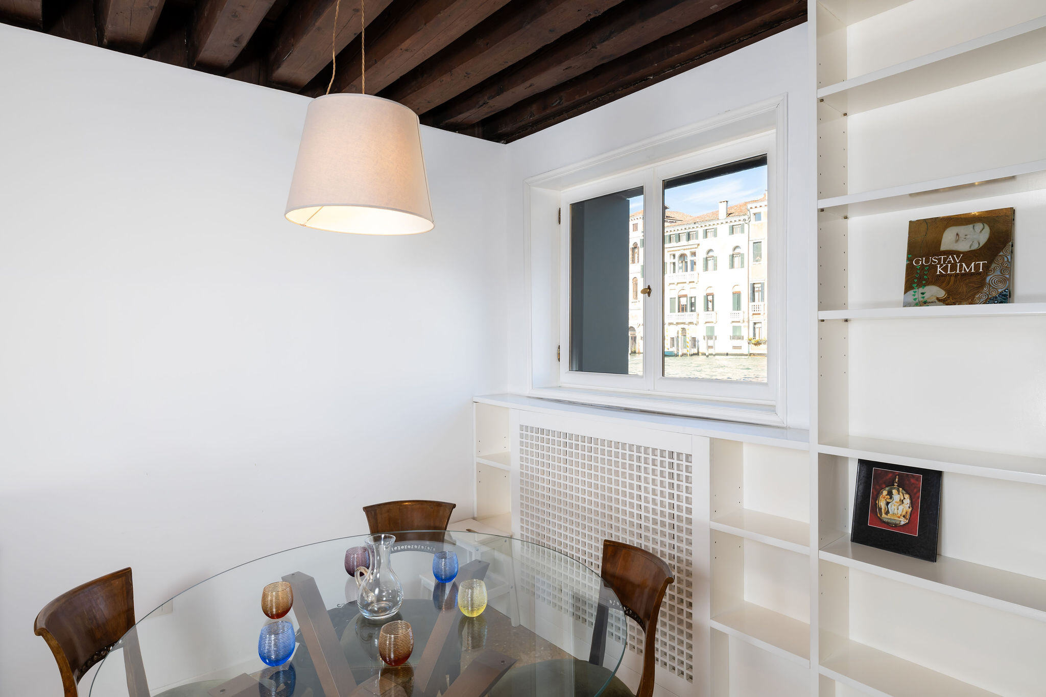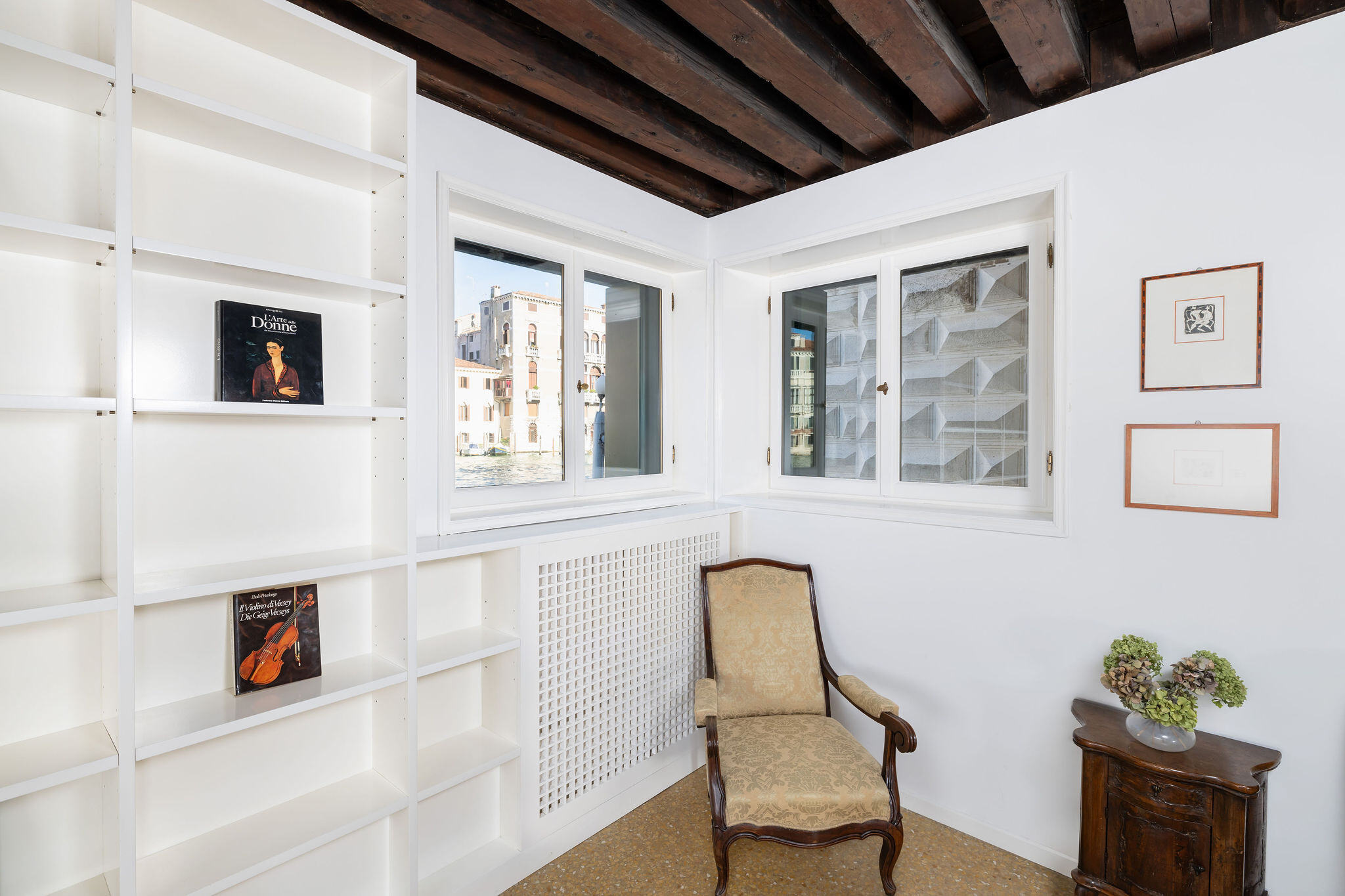 The view from the living room windows could not be more suggestive: across the waters of the Grand Canal you can admire the beauty of the palazzos on the Cannaregio side, while the monumental Cà Pesaro Museum of Modern Art stands out next to the smaller side canal.