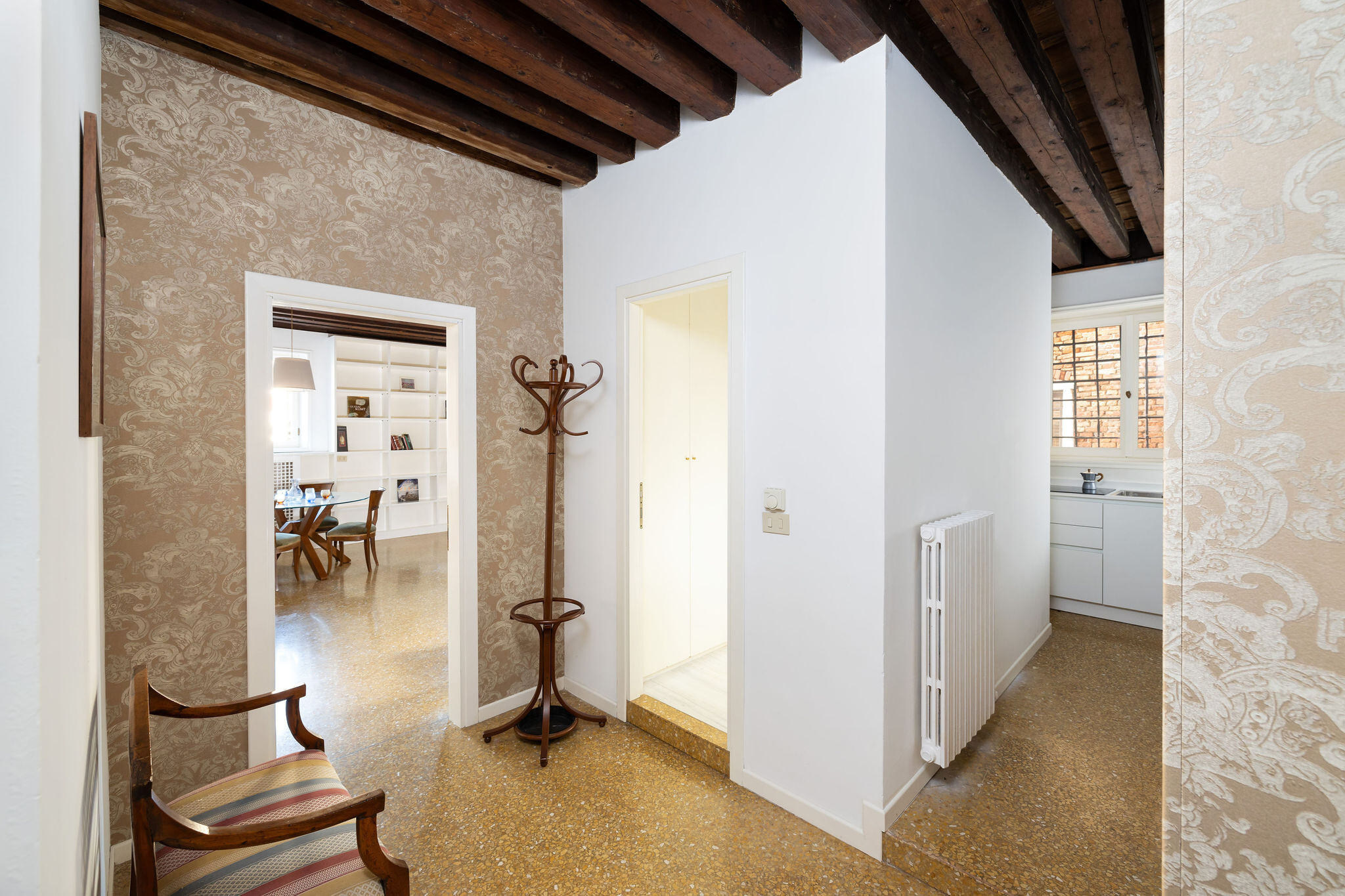 The atrium of the Palazzo that connects the Grand Canal to the apartment and the garden is one of the highlights of this property, with its decadent magnificence typical of Venetian patrician residences.