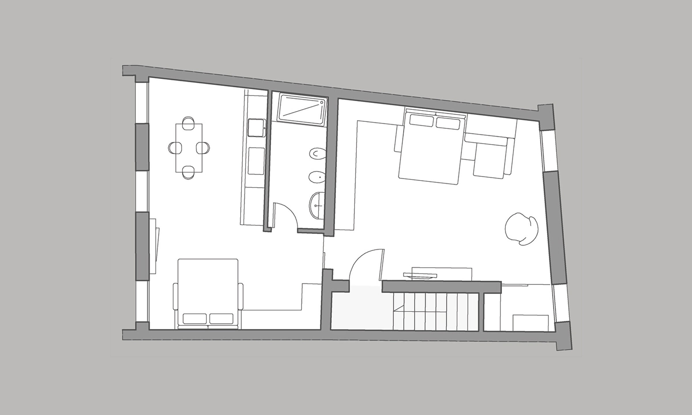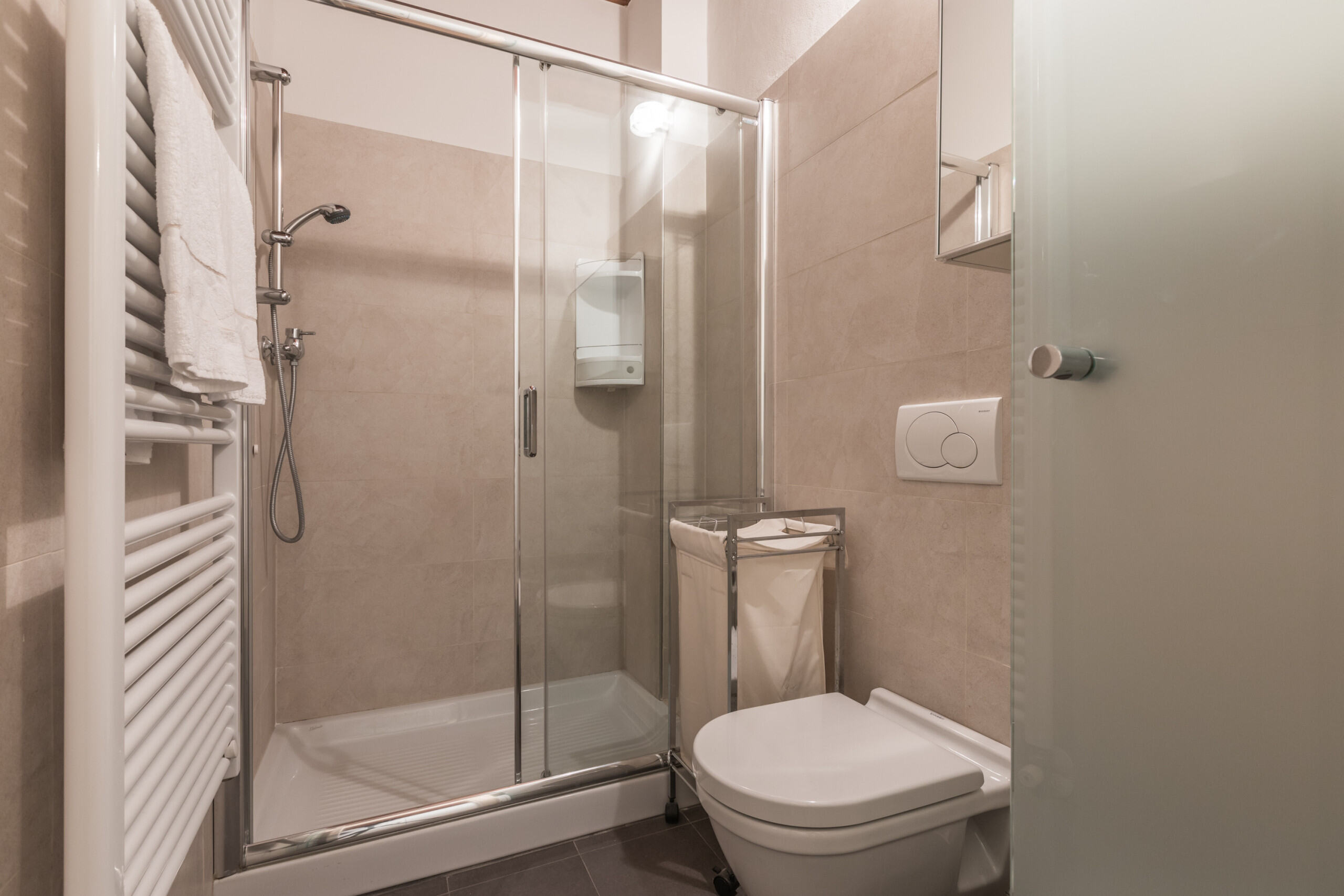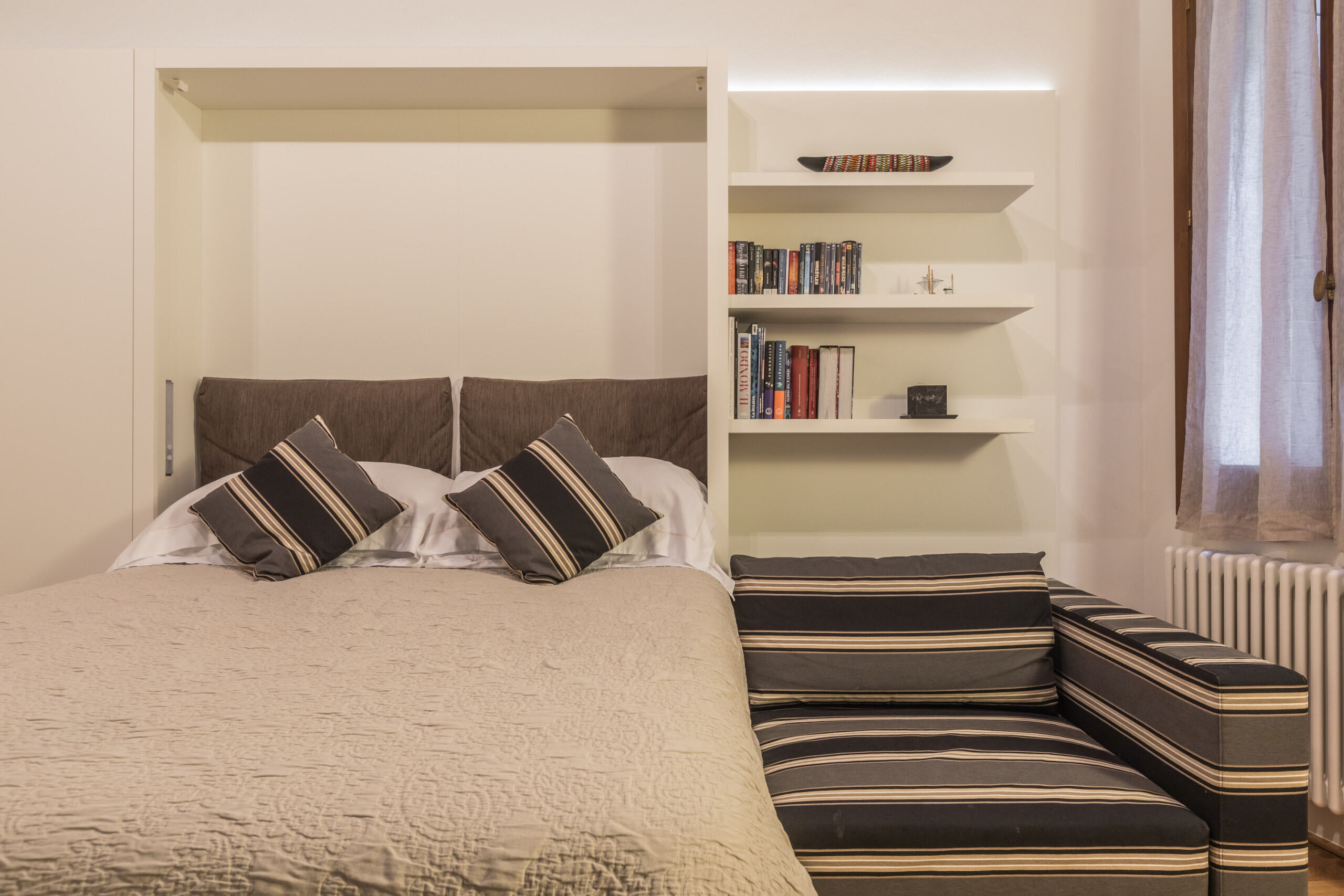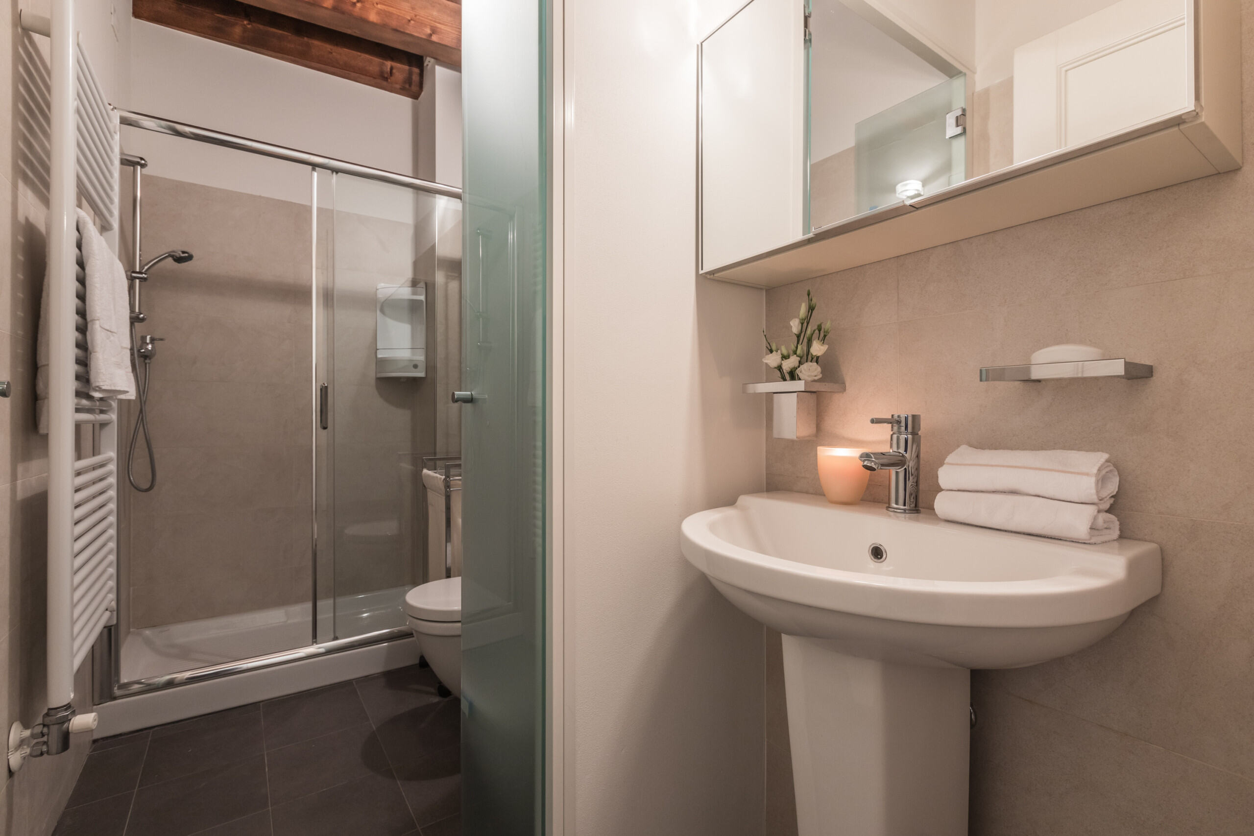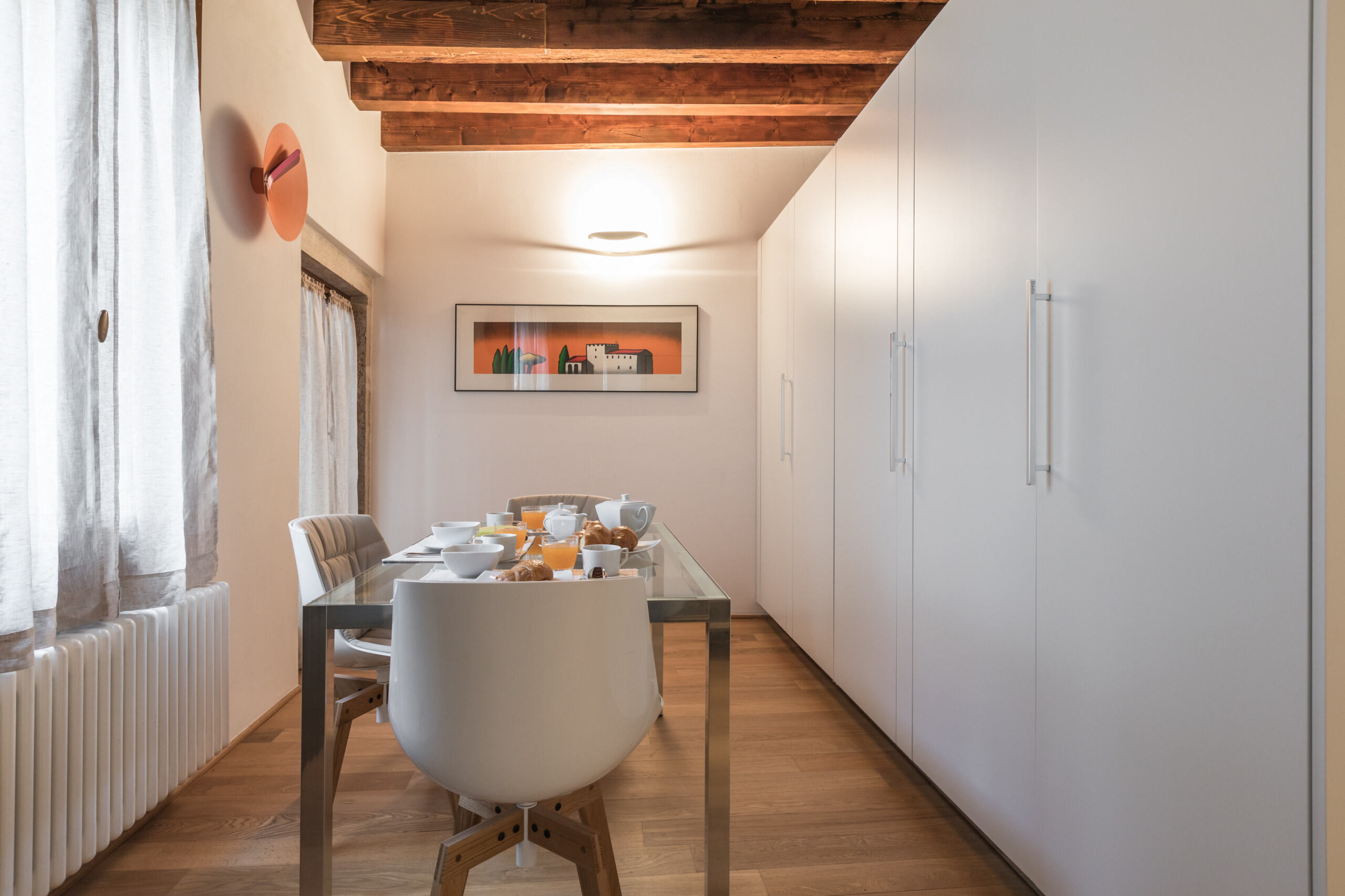 There is plenty of closet and storage space and a luxury bathroom with large shower cabin. In the living room there is also a small balcony that reminds us the Romeo and Juliet balcony in Verona for its charming medieval context. The view from the apartment is not particularly open but definitely picturesque.