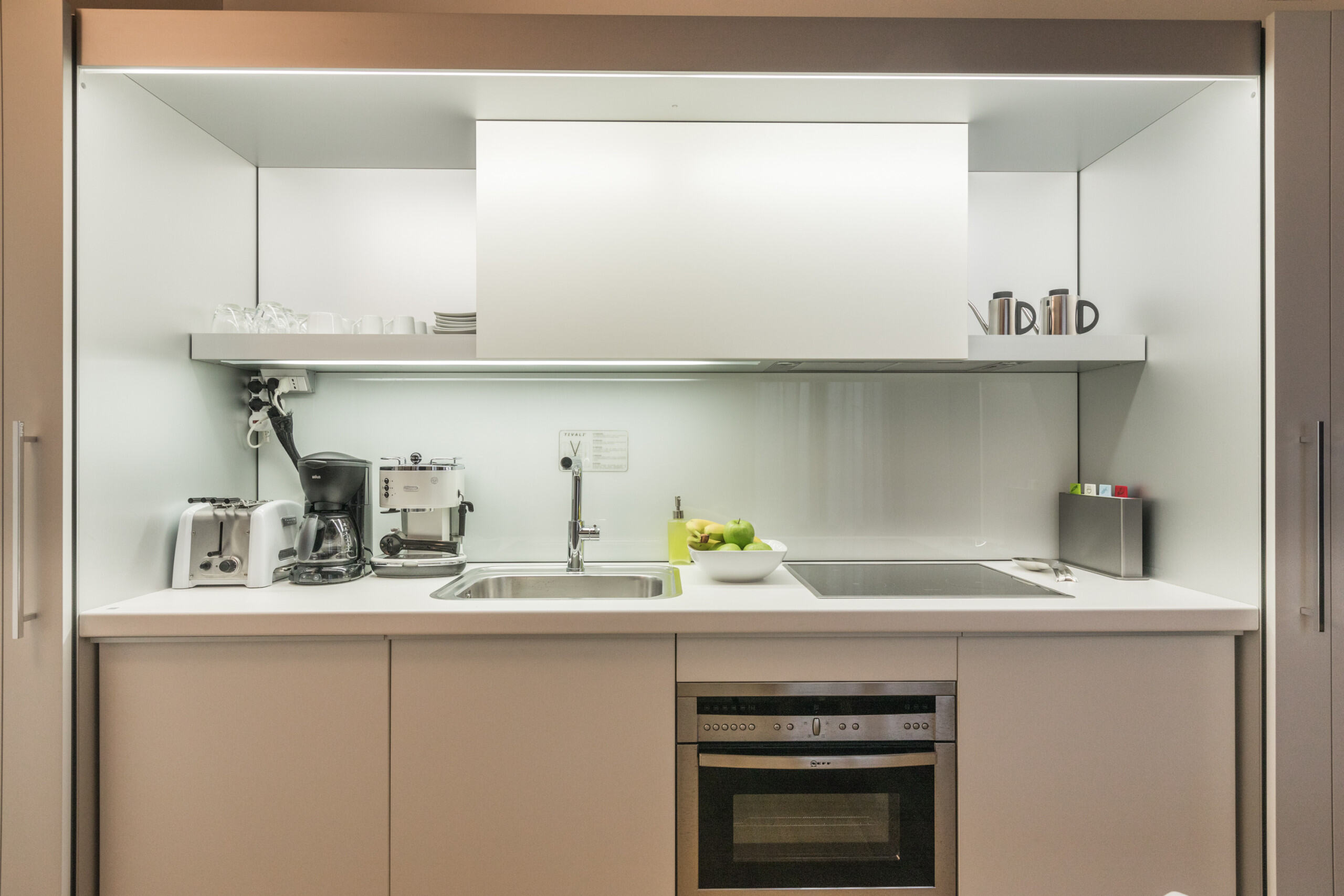 As soon as you walk in, stylish designer furniture really jumps out at you, but the best feature still needs to be figured out at this stage. In fact, both rooms can be presented during the day time like spacious and tidy living rooms with comfortable sofas and a luxury kitchen, while at night time they can both be easily transformed into bedrooms by hiding the kitchen with a sliding door mechanism and pulling down two invisible double wall-beds. The 20cm thick, 160cm wide mattresses are truly comfortable (queen size) and the mechanism is very simple to use.