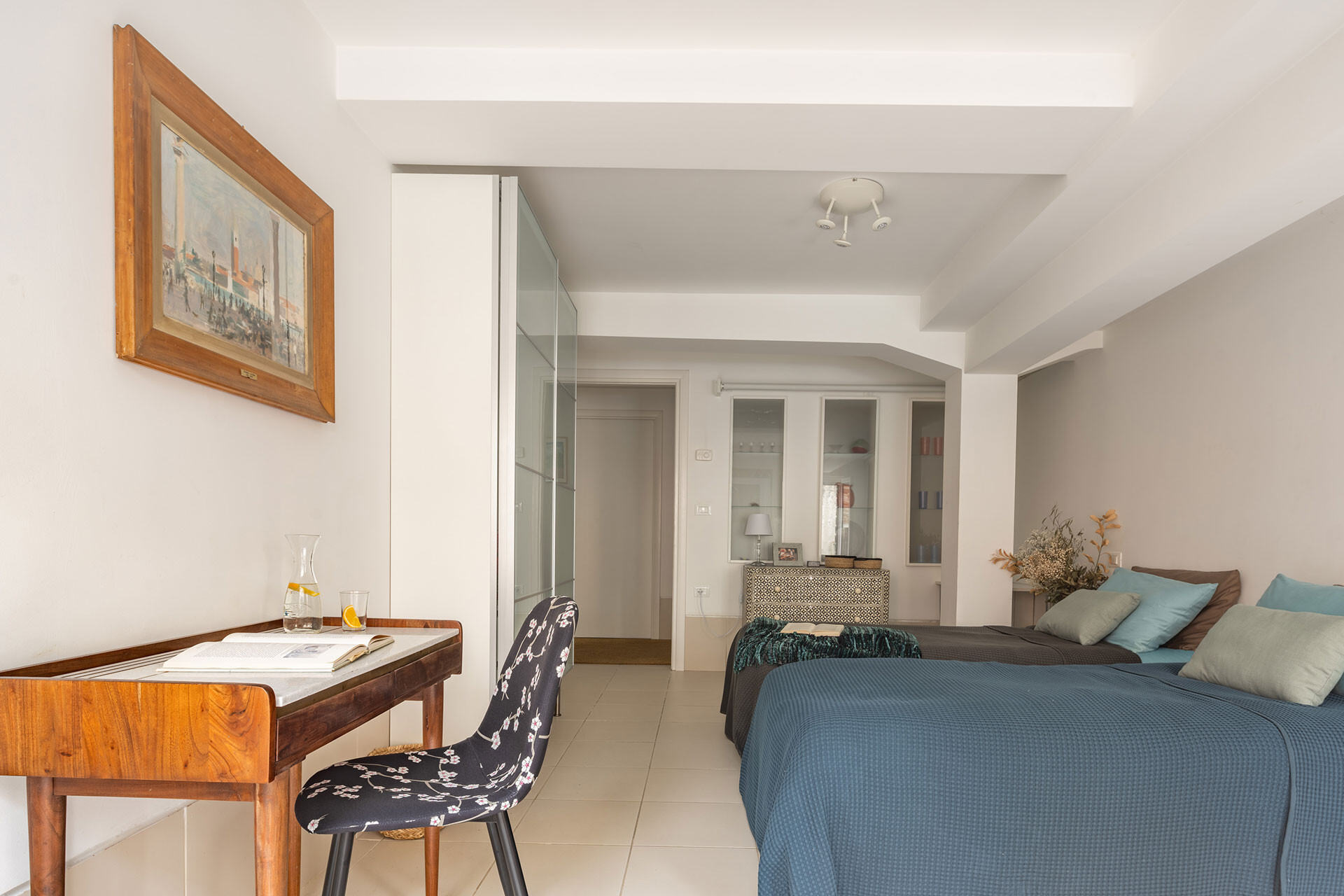 Located at the ground floor therefore easily accessible, the apartment is bright and comfortable and features an easy living sort of atmosphere. There are two bedrooms, both of which can either be prepared with a king size bed (180 cm x 200 cm) or with two single beds (90 cm x 200 cm). Both rooms have plenty of storage space in their large wardrobes.