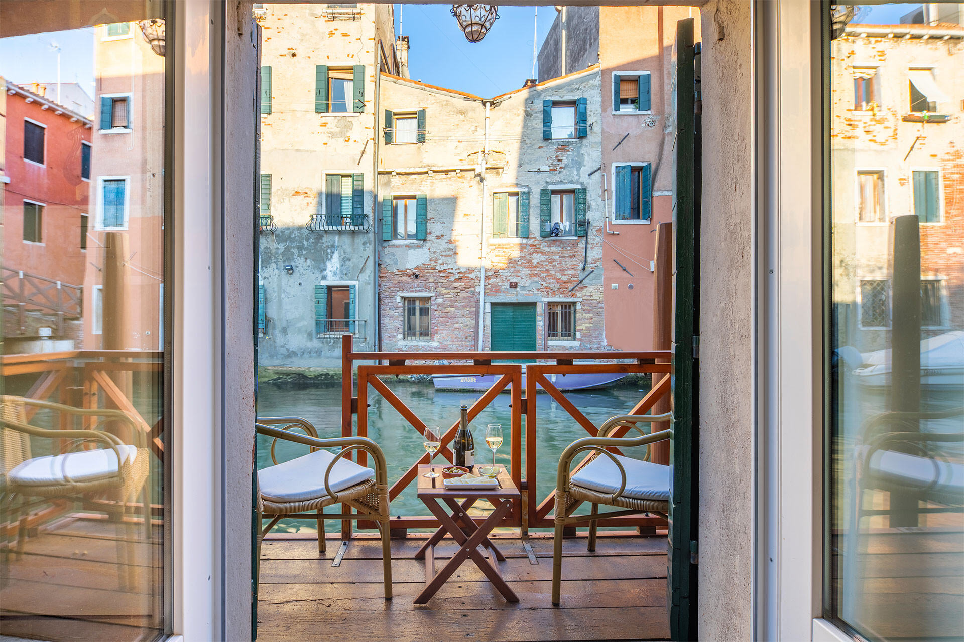 As shown on the pictures the Miranda apartment highlight is the little wooden terrace on the Canal, accessible from the main bedroom. There are two chairs and a little table that can be used on the terrace, perfect for tea and cake or a Venetian style aperitive "on the water".