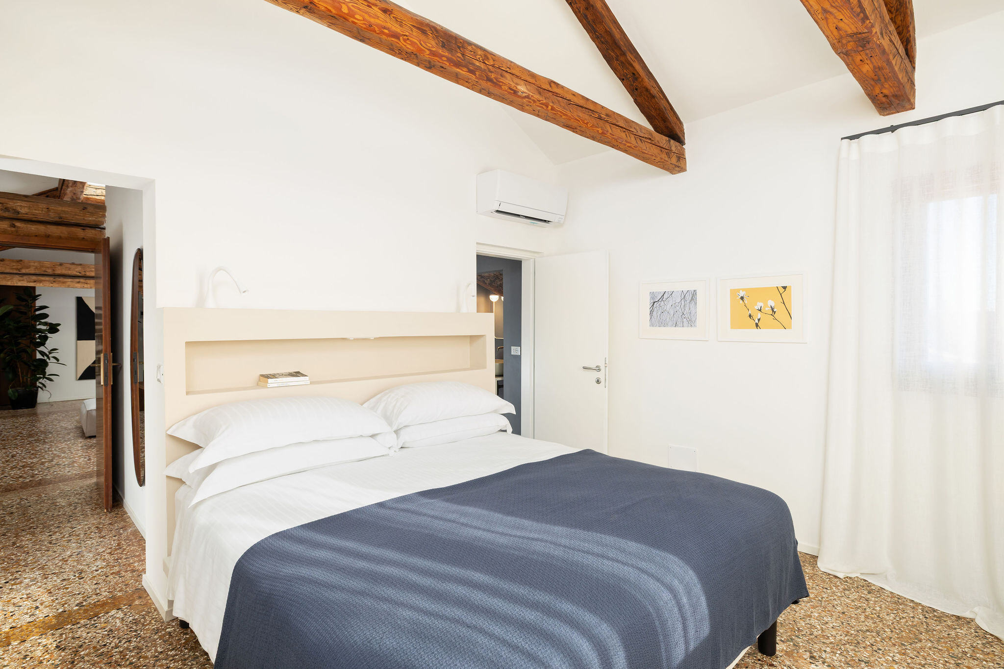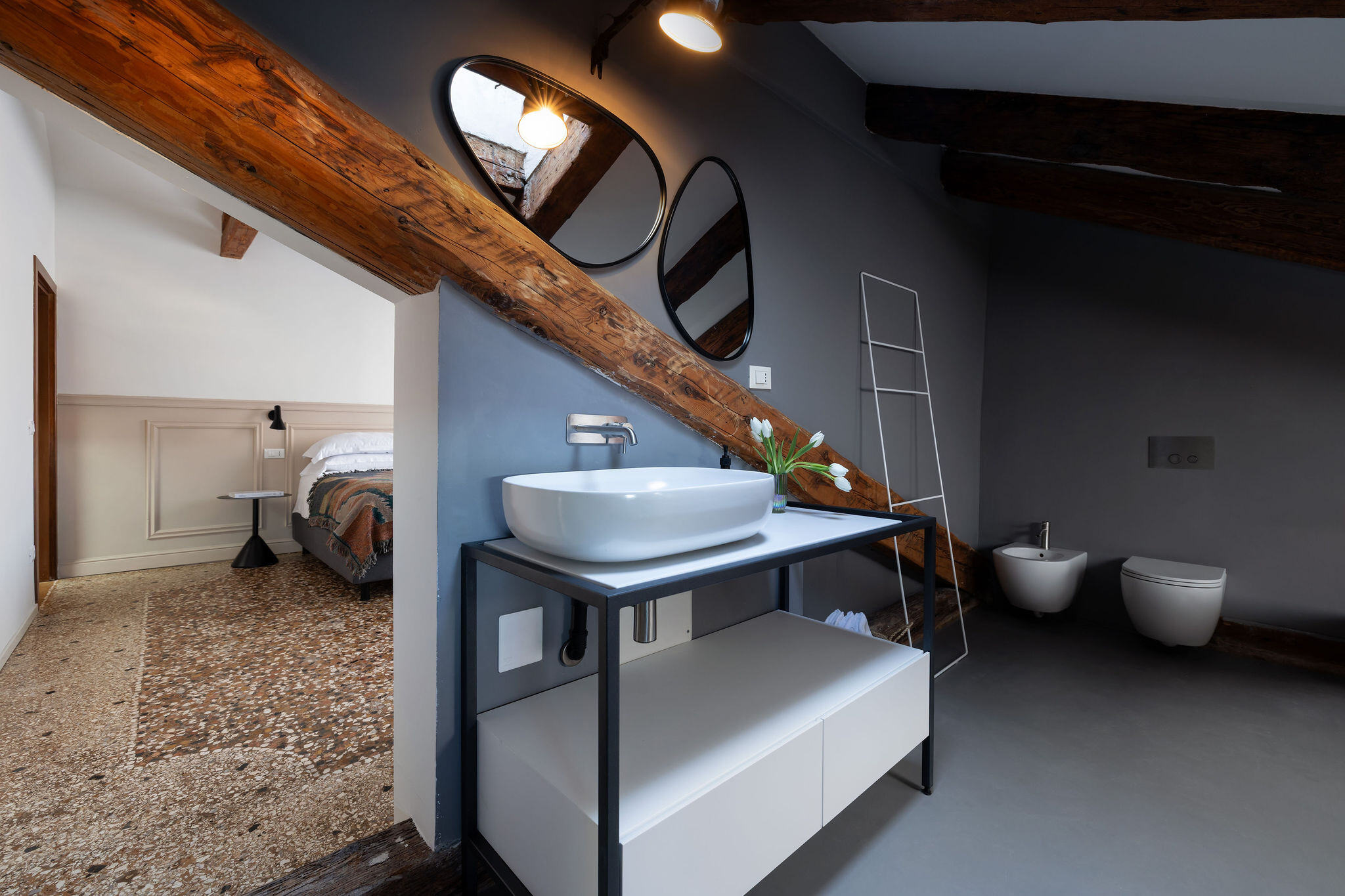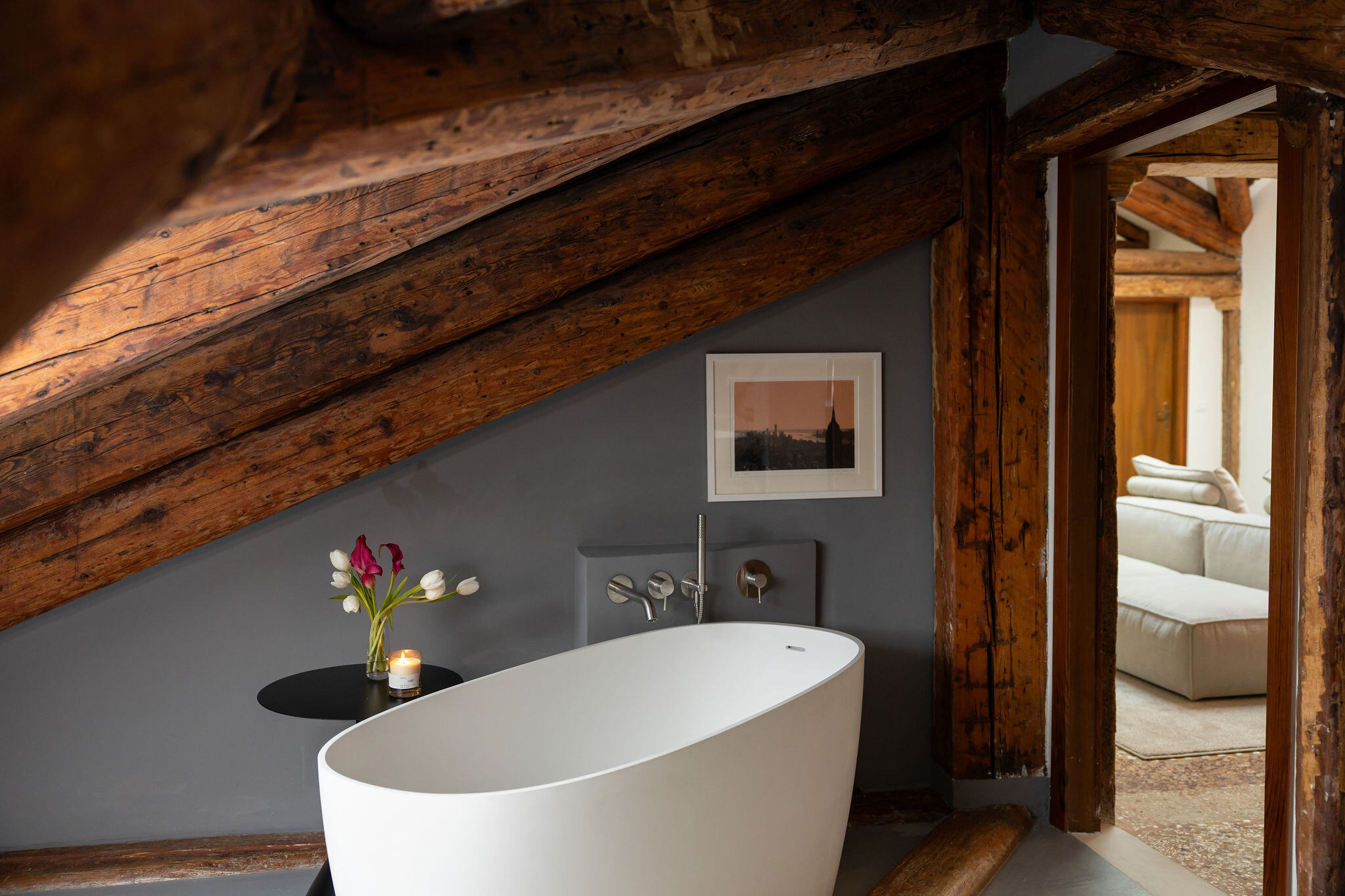 Situated on the third and top floor of a 17th-century building that has recently undergone a complete renovation, this apartment embodies the charm of a classic Venetian attic, featuring exposed beams and trusses in perfect harmony with furnishings signed by renowned Italian designers.