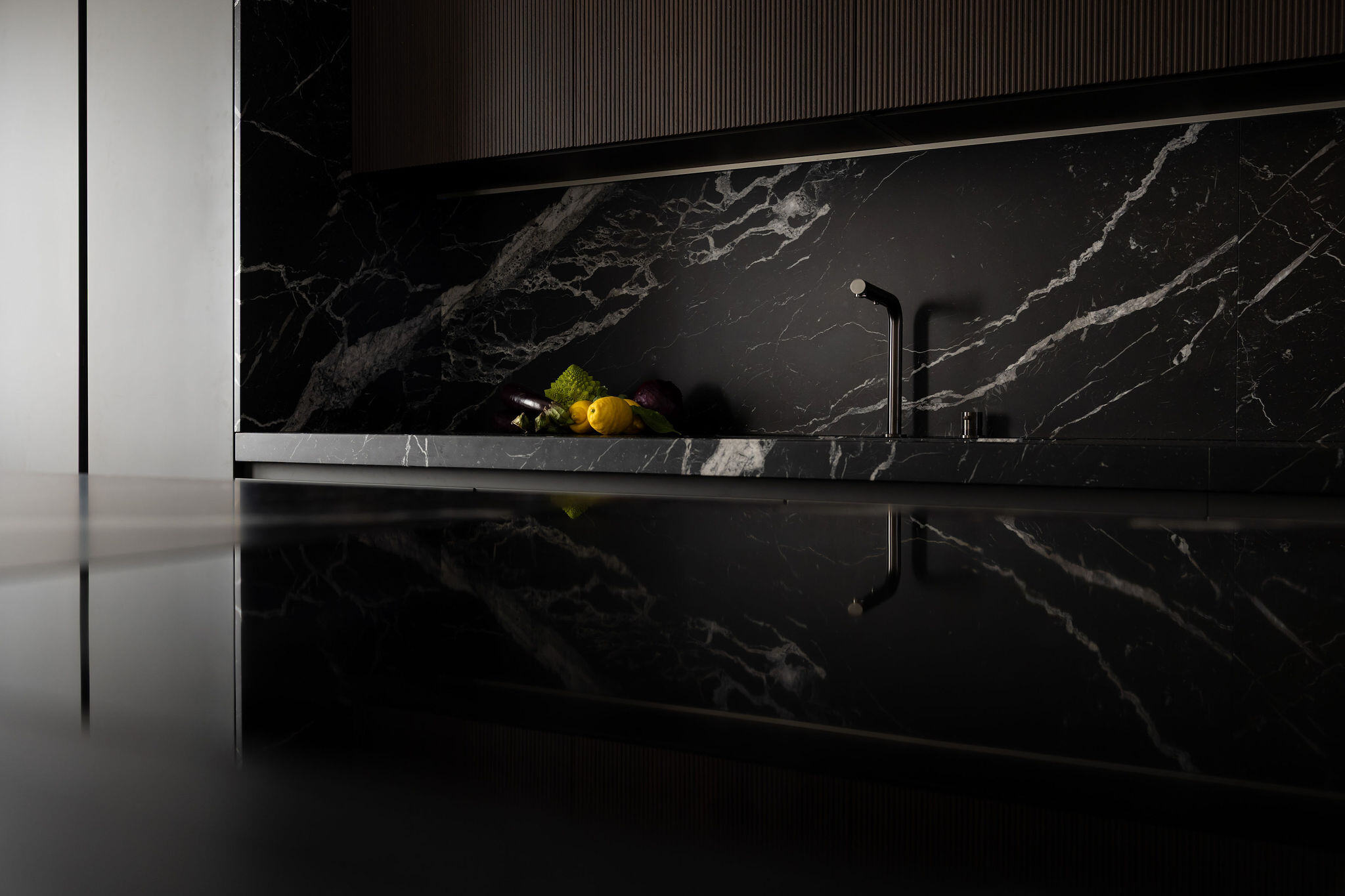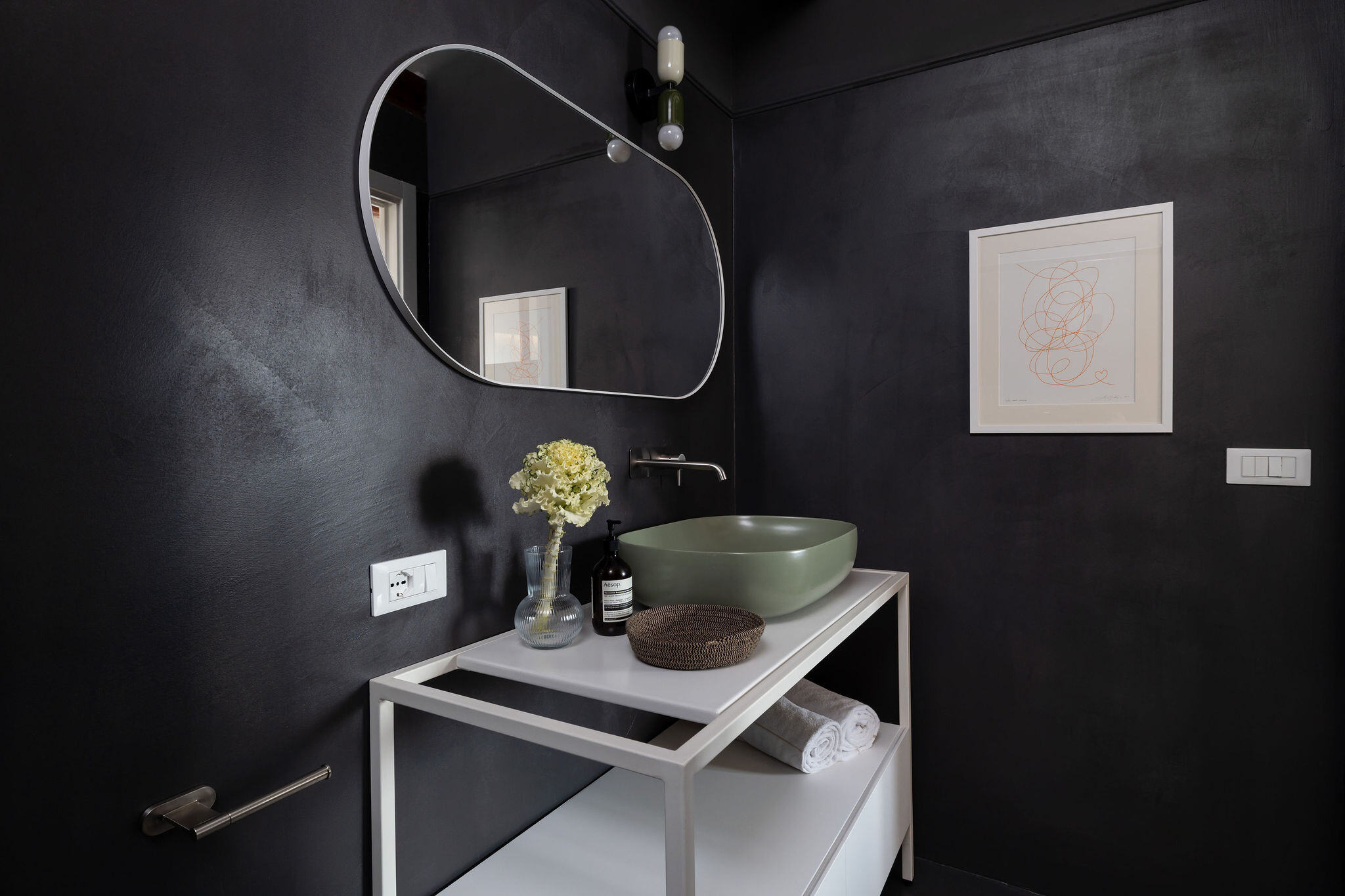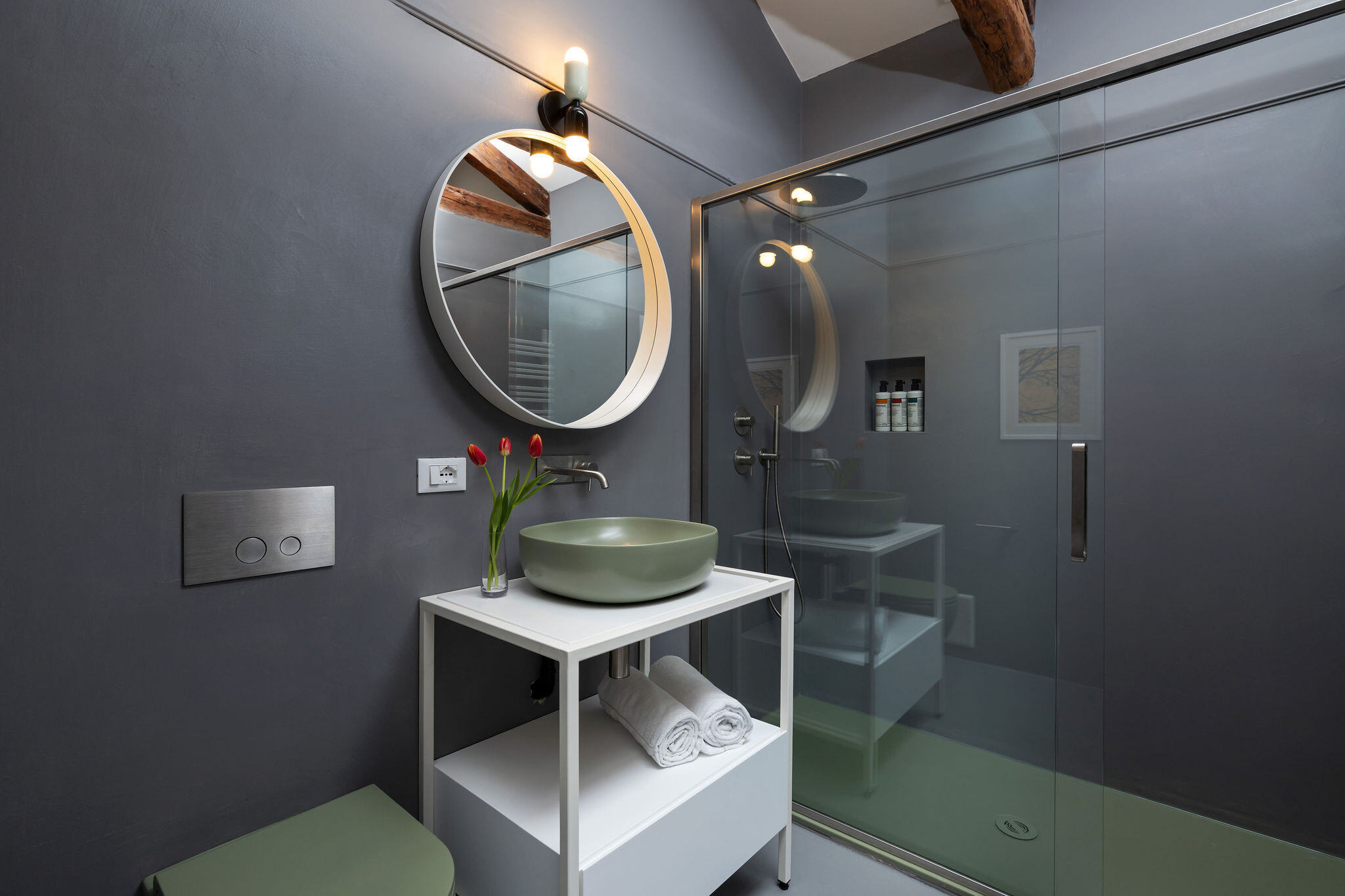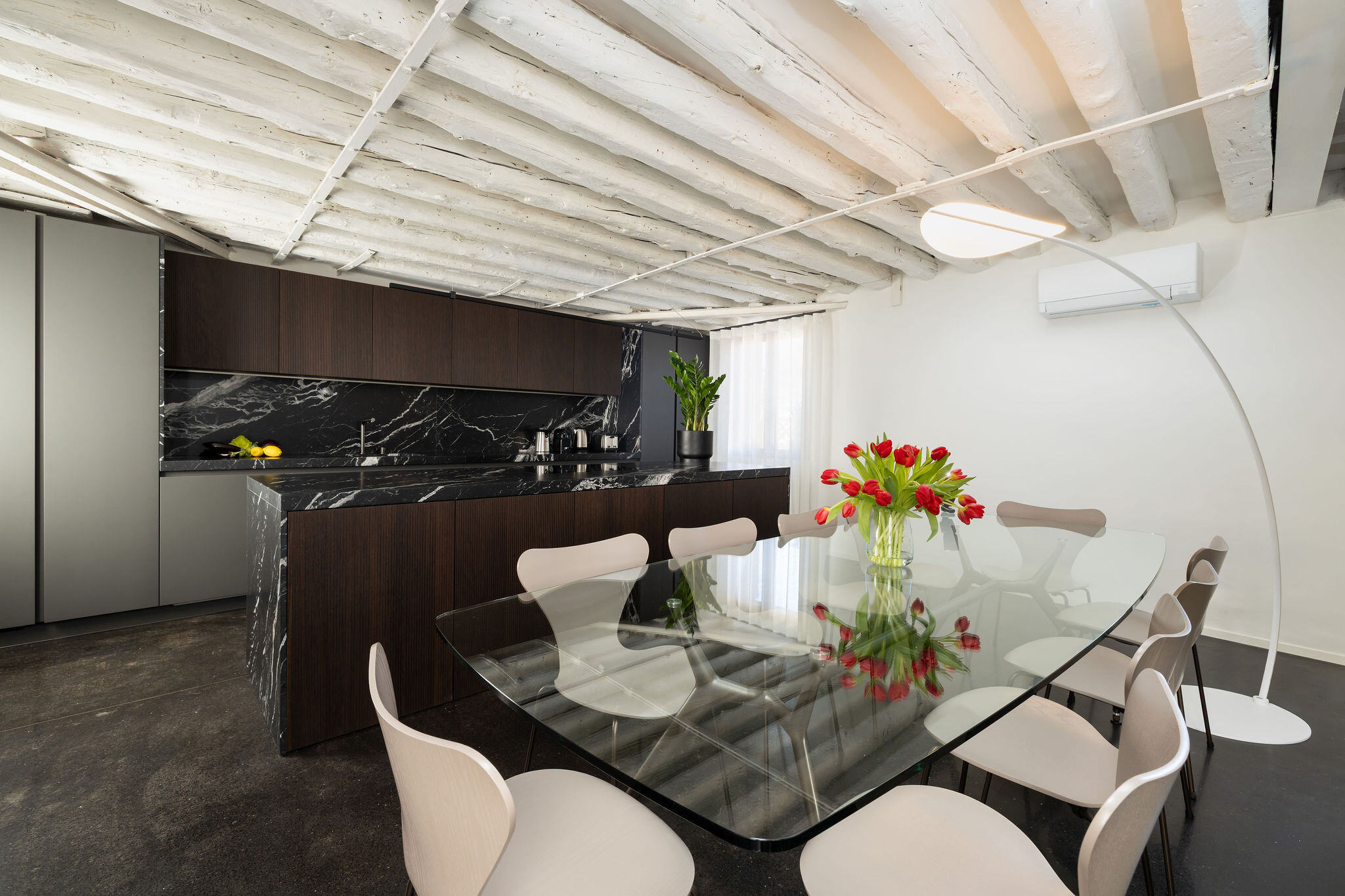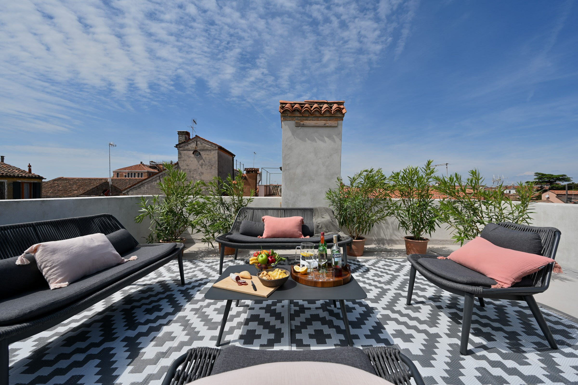 The beating heart of the house is a stunning custom-made kitchen in Marquina marble, fully equipped and perfect for a cooking class or a family meal with friends. A large glass dining table seats up to 12 guests, and as the pièce de résistance, an internal staircase leads to the 40 sqm rooftop terrace. From this privileged spot, one can admire breathtaking panoramic views over the rooftops of Venice, the island of San Giorgio, the Giudecca, and the Basilica della Salute—a perfect setting to enjoy the spectacular fireworks of the Redentore festival, the New Year’s Eve celebrations, or simply a glass of prosecco while watching the sun set over the Serenissima.
