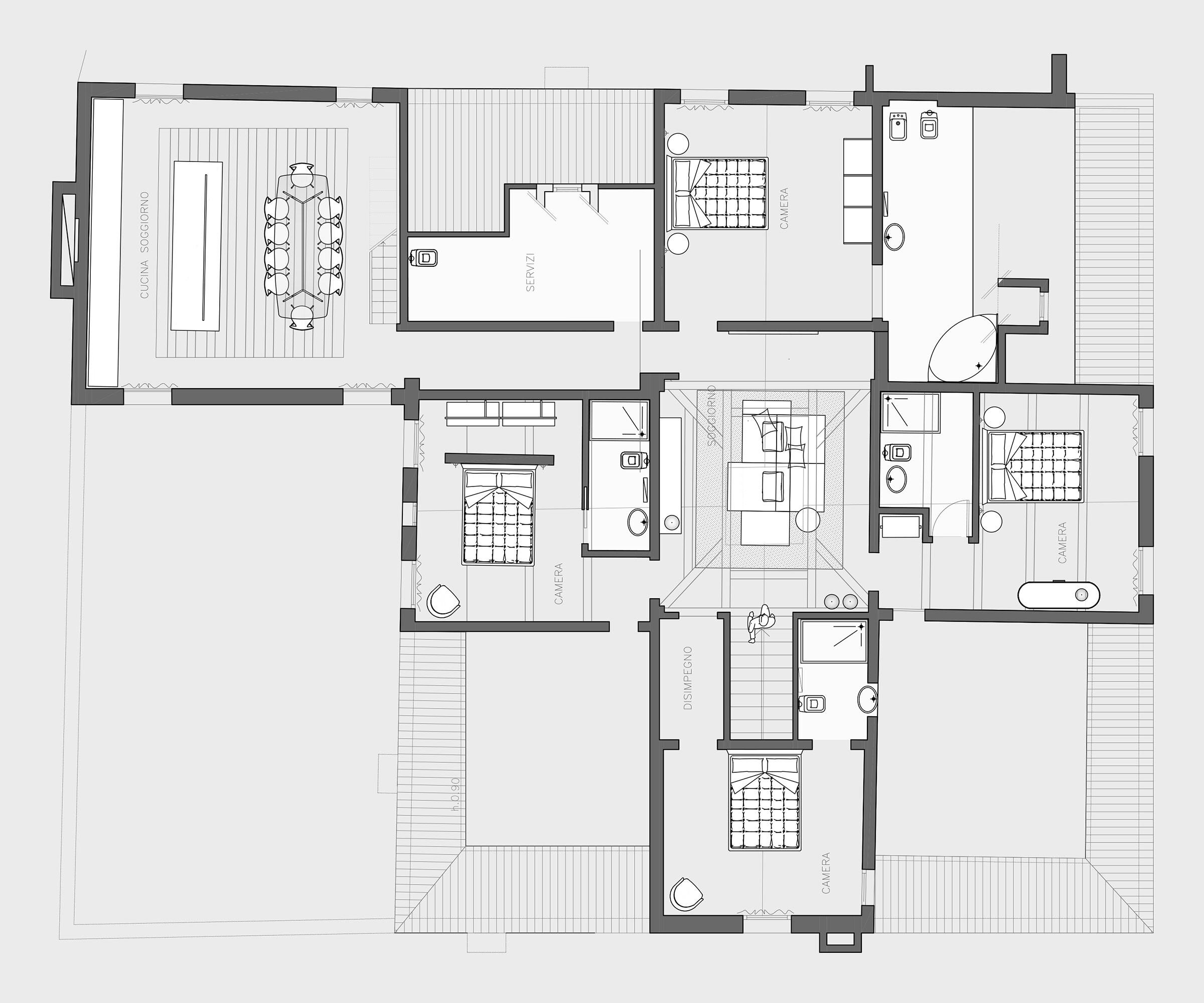A centuries-old stone staircase leads directly to the central living room, illuminated by a large skylight at the heart of the home. From here, one can access the four bedrooms, each equipped with a spacious en-suite bathroom featuring either a shower or a bathtub.