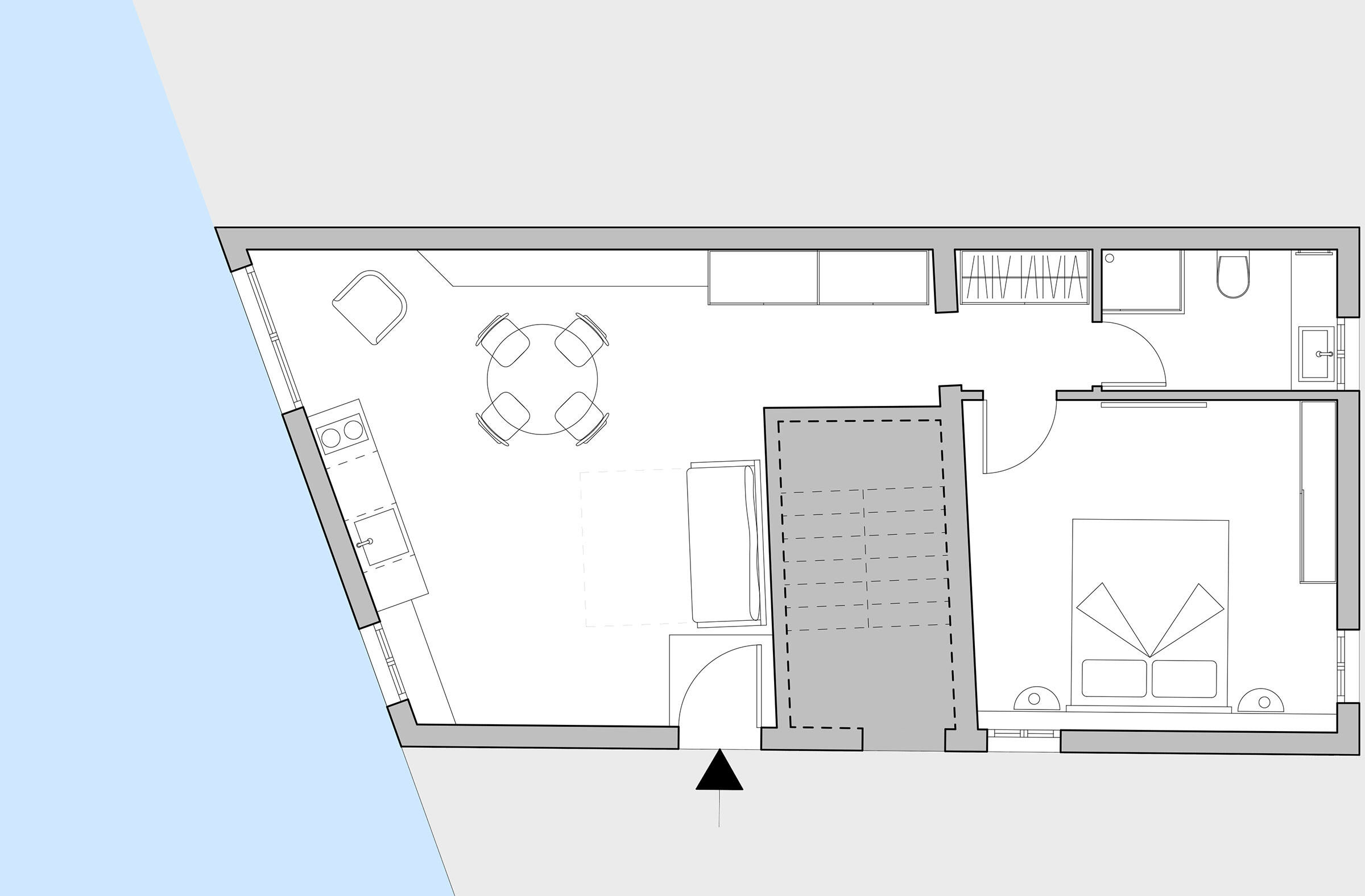 The living room is equipped with a full-optional kitchen, a contemporary style table for four people, a sofa-bed (available on request) and plenty of cupboards where you will find everything necessary also for a long stay.