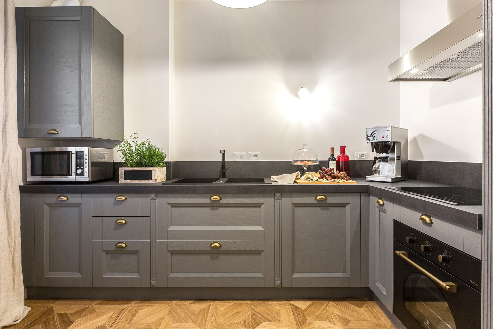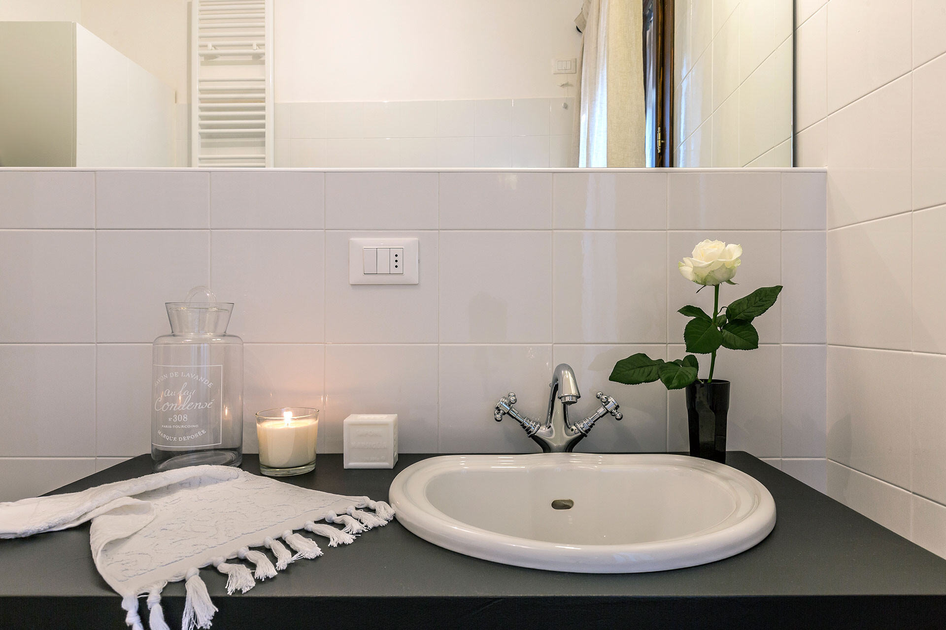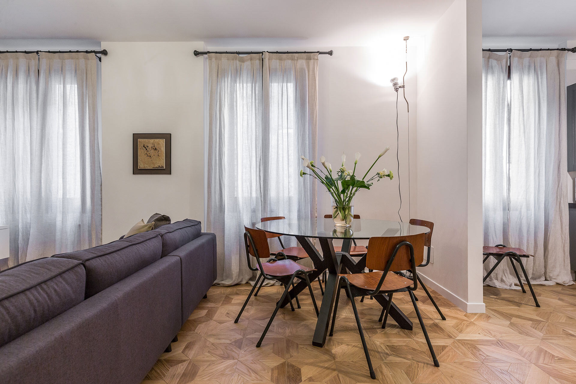 Full of natural light, the interiors are in a cosmopolitan Parisienne style, elegantly furnished with vintage pieces including French industrial lamps from the 40s matching the style of a Doimo kitchen, Danish designer chairs from the 50s, a Shanghai style table with an original 70sParentesi lamp by Achille Castiglioni, beautiful natural oak parquet flooring in the living room and kitchen, original XIX Century Venetian terrazzo flooring in the bedrooms and bathrooms, original modern paintings by a well-known artist, and exquisite linen curtains and upholstered beds and sofas. An extra touch of class: is the original 60s Murano glass chandeliers from the Pauly collection. The result is a clean and comfortable ambience that accommodates anyone’s tastes.