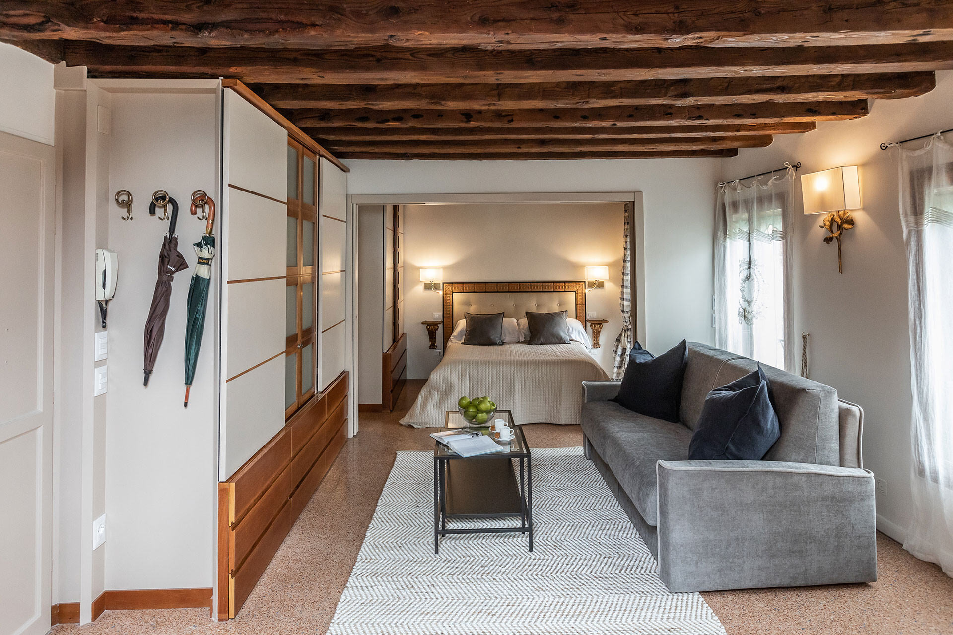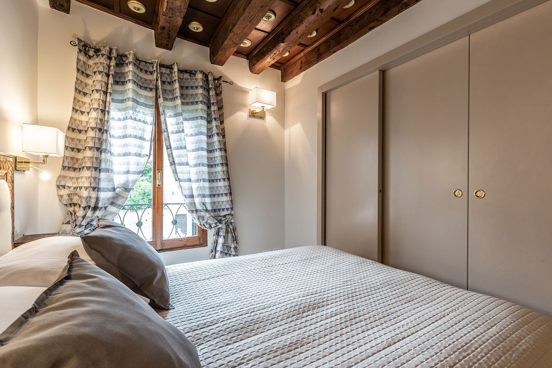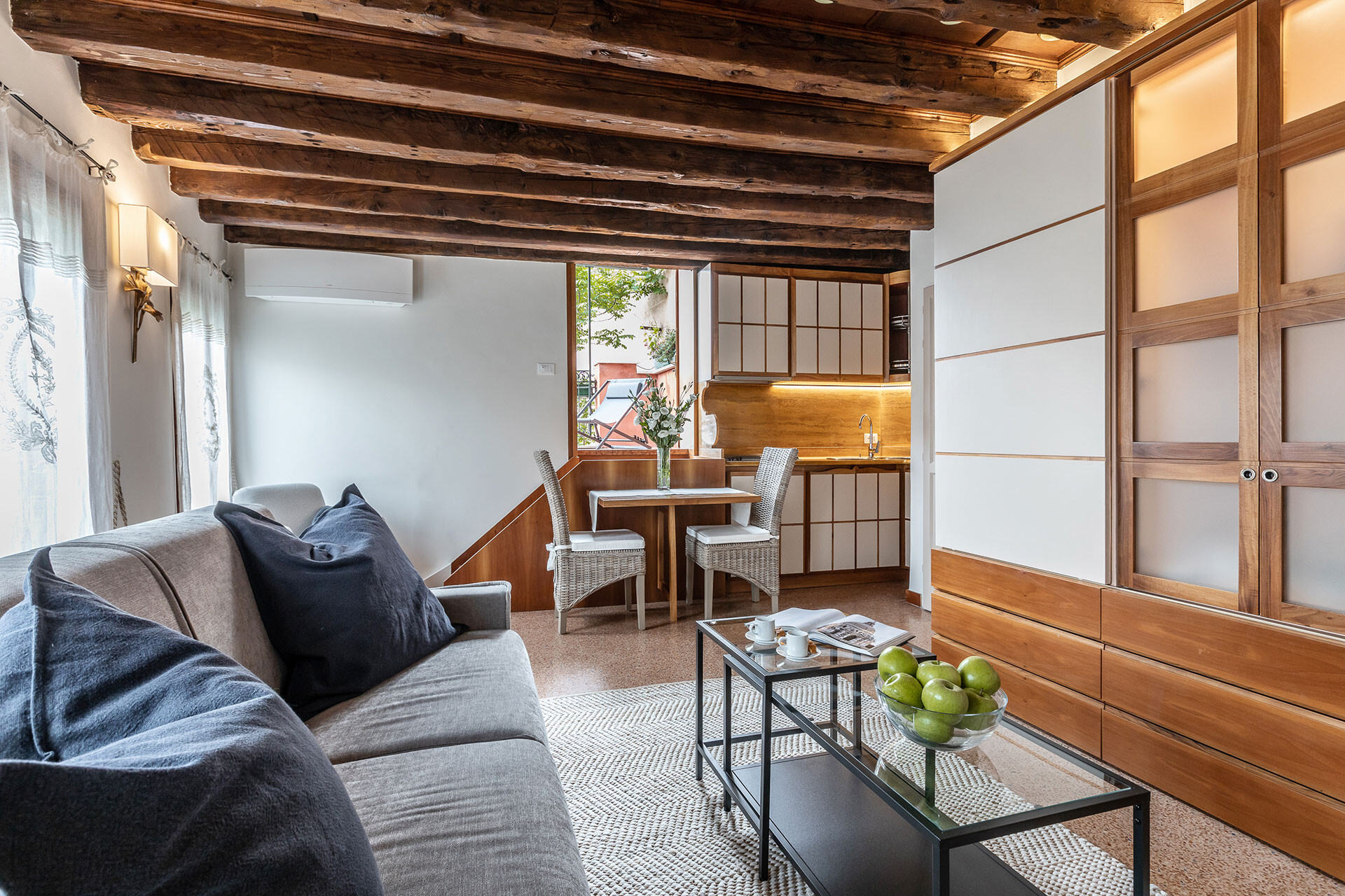 The terrace is by far the highlight of the property: the view that you can enjoy from here is wide open and truly Venetian. The large Arsenale Canal is closed to boat traffic, therefore this spot is particularly quiet end discrete. The terrace is furnished with a table, chairs and sunchair which is perfect for a relaxing breakfast or an aperitif at sunset. The awning offers the possibility to use it also during very hot days or when raining.