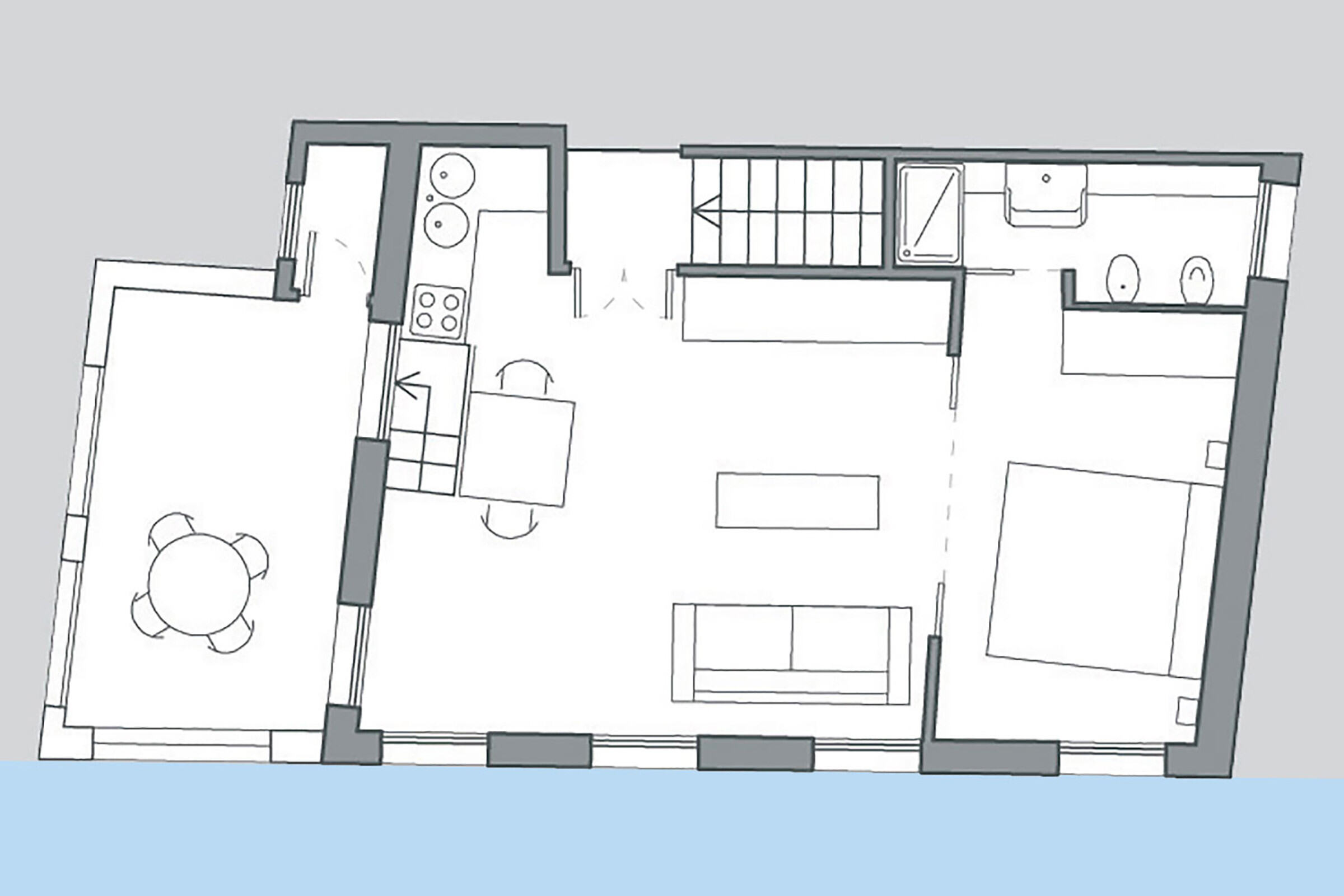 It is composed of a very bright loft-style living and dining area with kitchenette, a small bedroom with queen size bed, large wardrobe and closet space, a mosaic tiled bathroom with shower cabin. The sofa-bed in the living is as comfortable as a normal bed and can easily be opened and closed, so during the day you can use the living room freely.