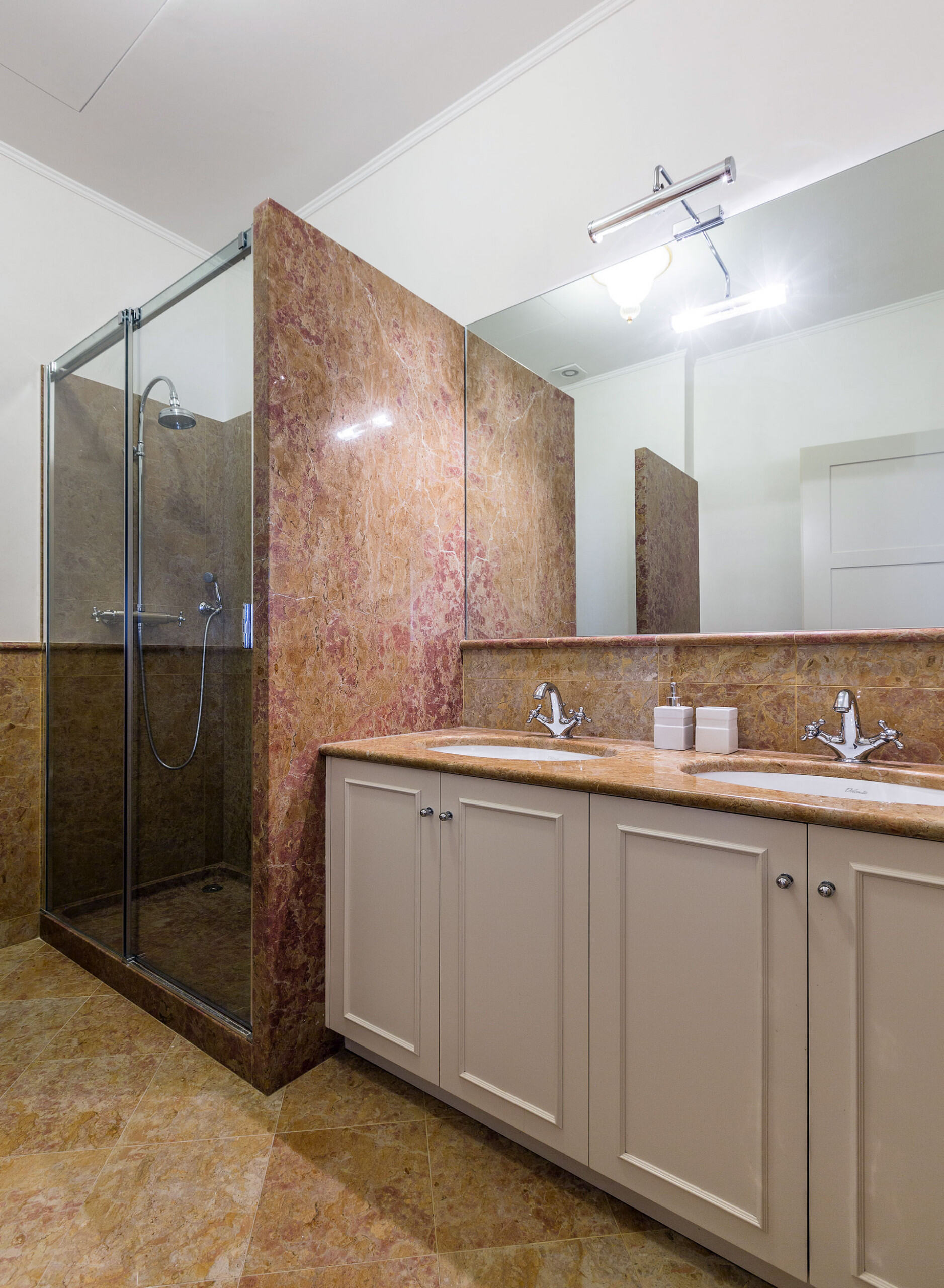 In the room between the living room and the master bedroom there is a double sofa-bed and the access to the second bathroom. The master bedroom boasts a canopied bed dressed with nice linen, while its en-suite marble bathroom is equipped with bathtub. The apartment is equipped with every sort of comfort, including Wi-Fi, A/C, washing machine, dishwasher, oven, large fridge and freezer, TV with DVD player, etc.