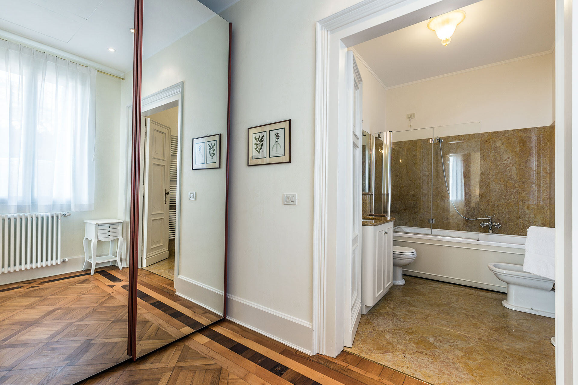 The entire property has been completely and luxuriously refurbished in 2013: an elevator has been installed, the original terrazzo flooring and art-deco inspired inlaid parquet renovated, frescoes and stuccoes brought back to the ancient splendour, the spacious terrace equipped with table, sunshade and sun chairs.