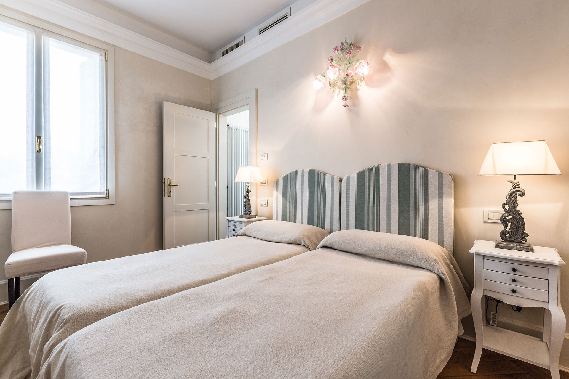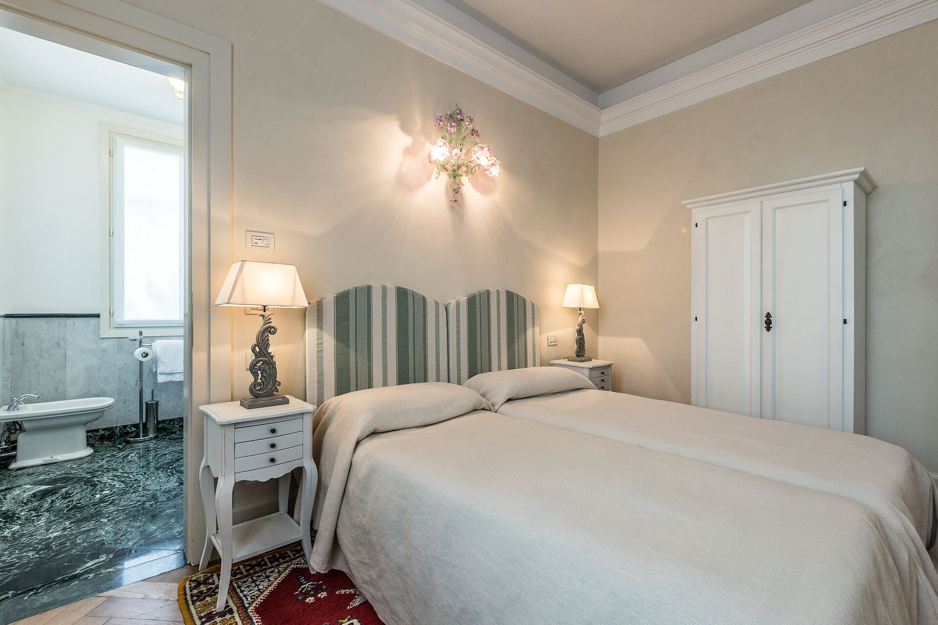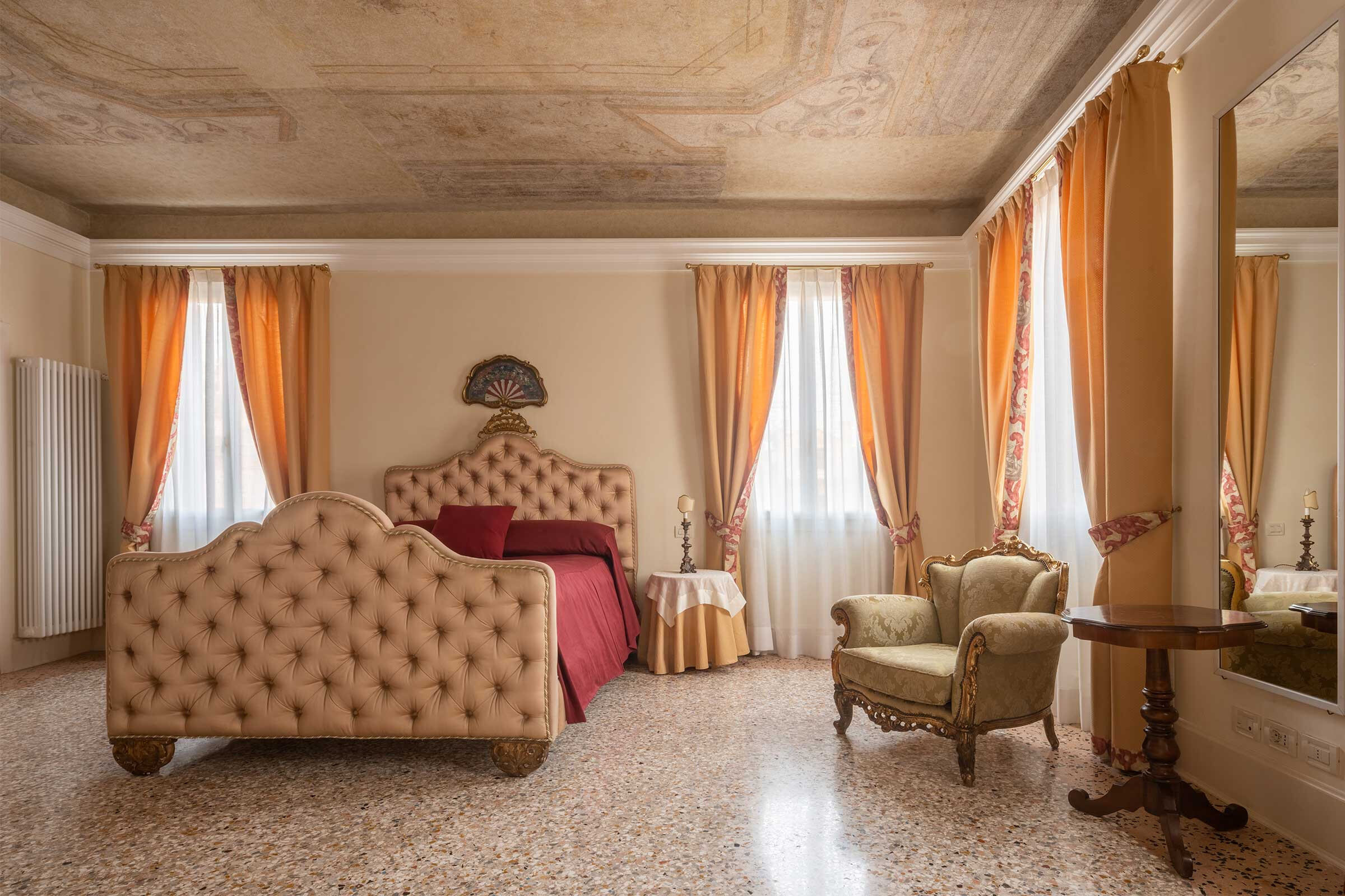 A welcoming hallway leads you straight into the grand master bedroom, where superb furnishings and plenty of natural light really enhance the beauty of this exquisite bedroom. Sleep under the frescoed ceiling and feel like a Doge as you awake!