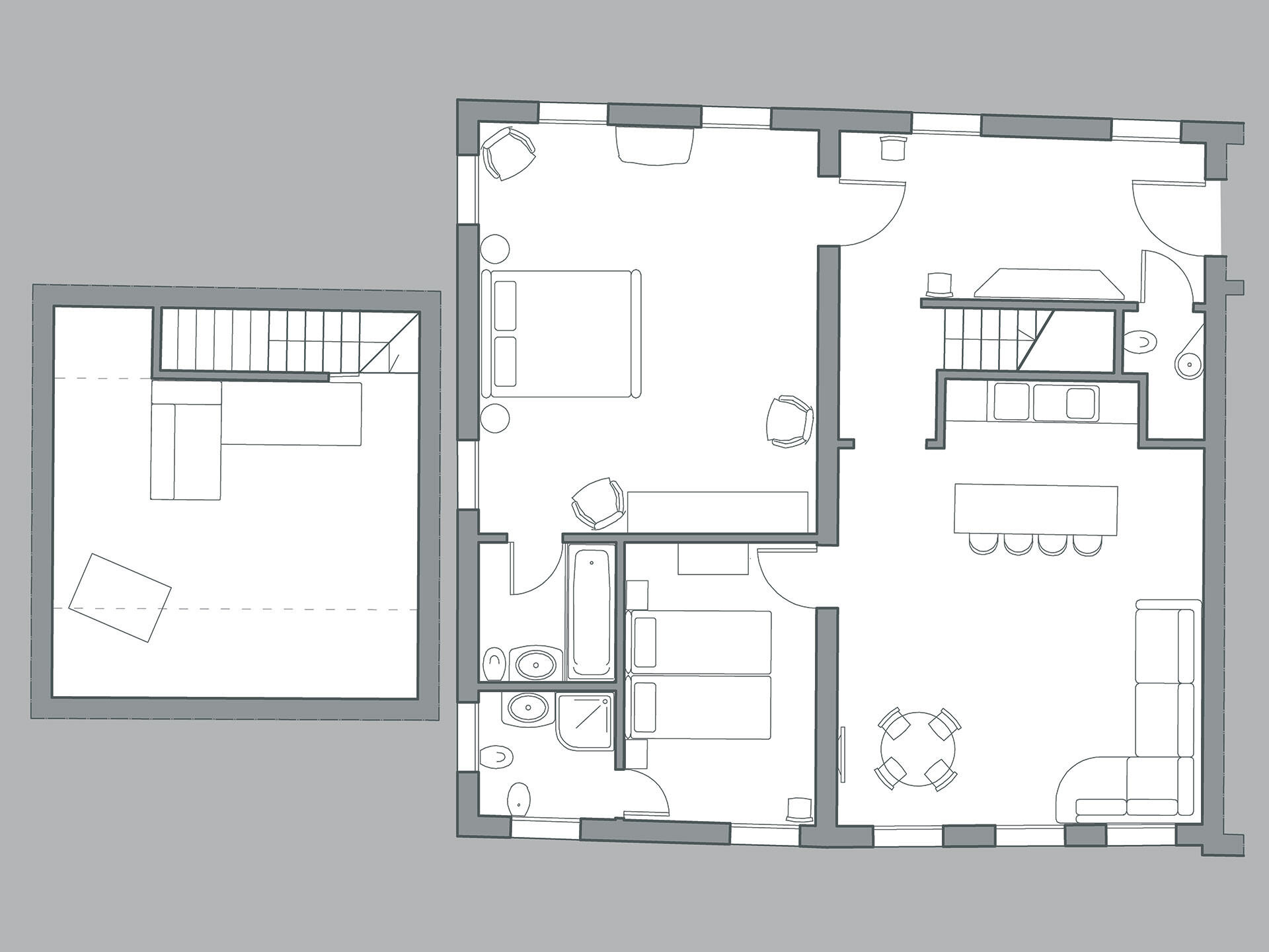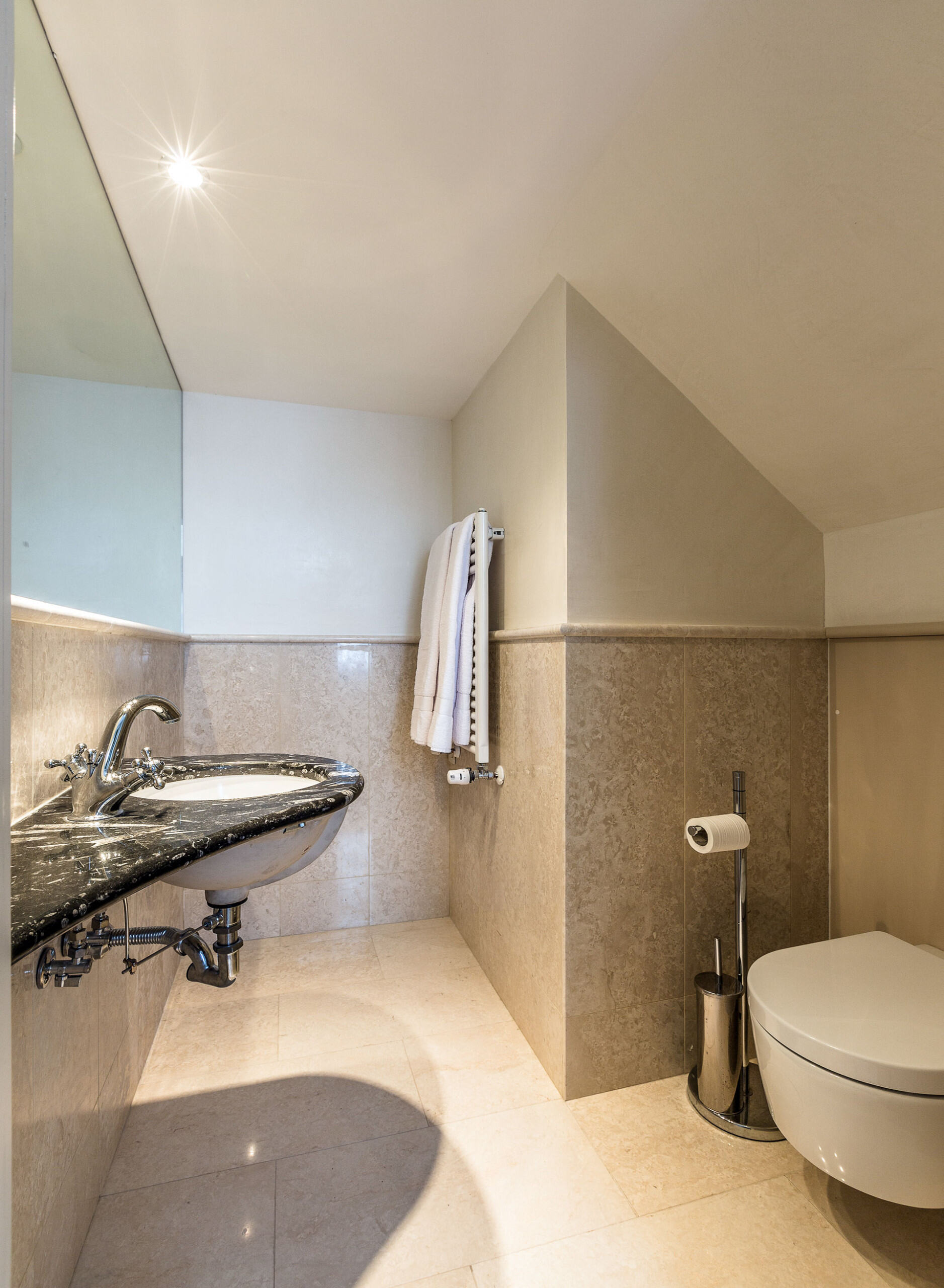 The elegant living room showcases a contemporary and functional open plan kitchen, while offering very comfortable sitting space on a designer sofa. Dine either at the main table or at the breakfast bar, part of the kitchen. There is an en-suite bathroom with a bathtub and a further en-suite bathroom with shower for the second bedroom. This bedroom has a more contemporary feel with crisp linens and fresh interiors. A clever mix of classic and contemporary to suit all. The apartment features a spacious attic floor that can be used as extra bedroom with a French size bed (140 cm wide) perfect for 2 children or 1 adult.