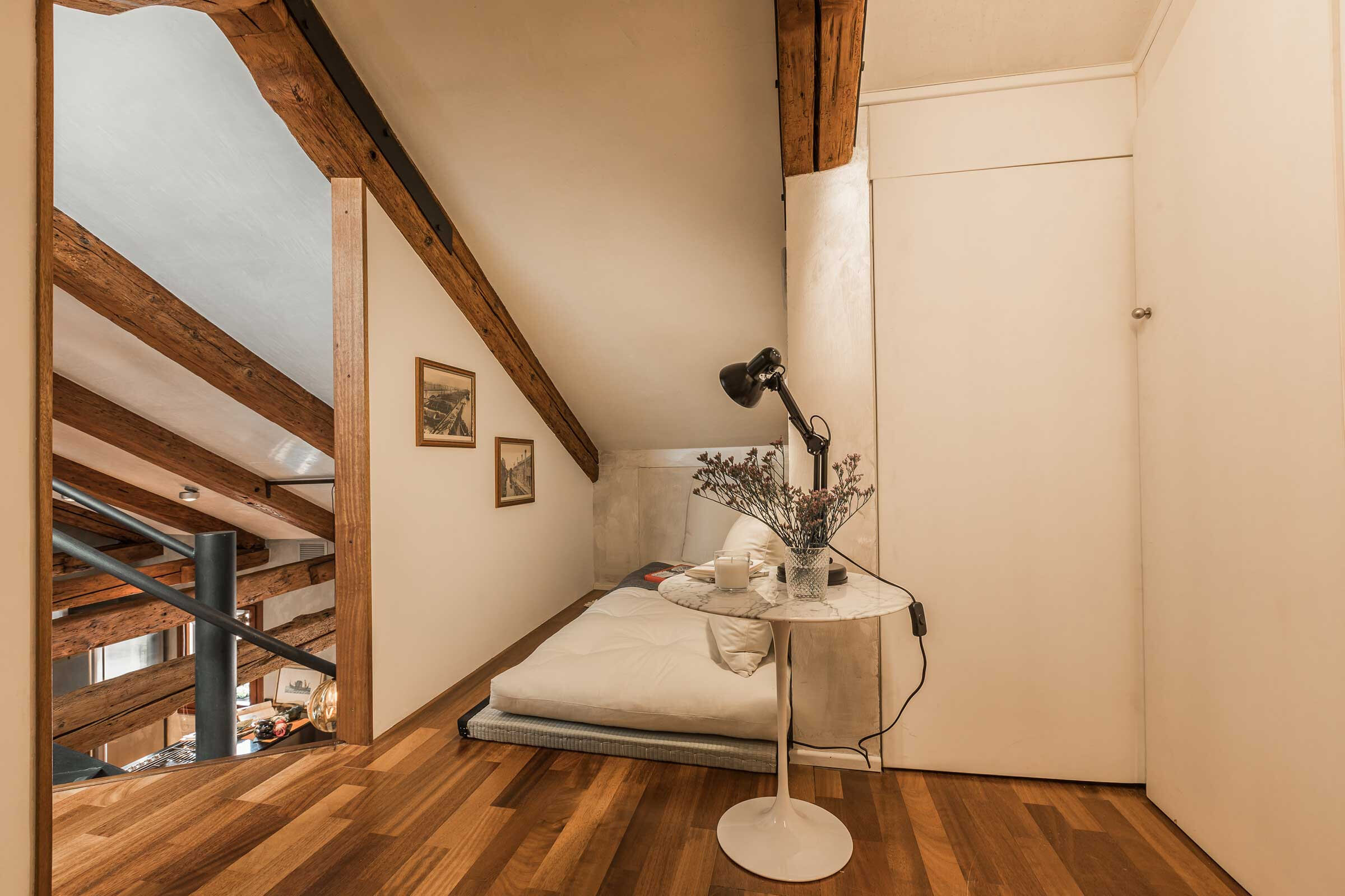 It is composed of a large loft-style living and dining area with nice steel kitchen, a double bedroom with large wardrobe, a luminous bathroom with shower cabin and a small mezzanine located between the living room and the terrace, accessible through the easy-to-climb spiral staircase that leads to the Altana. The mezzanine is very cosy: here you can find a futon bed with plenty of pillows, which you can use as a reading corner. The sofa-bed in the living room is as comfortable as a normal bed and can easily be opened and closed, so during the day you can use the living space freely.