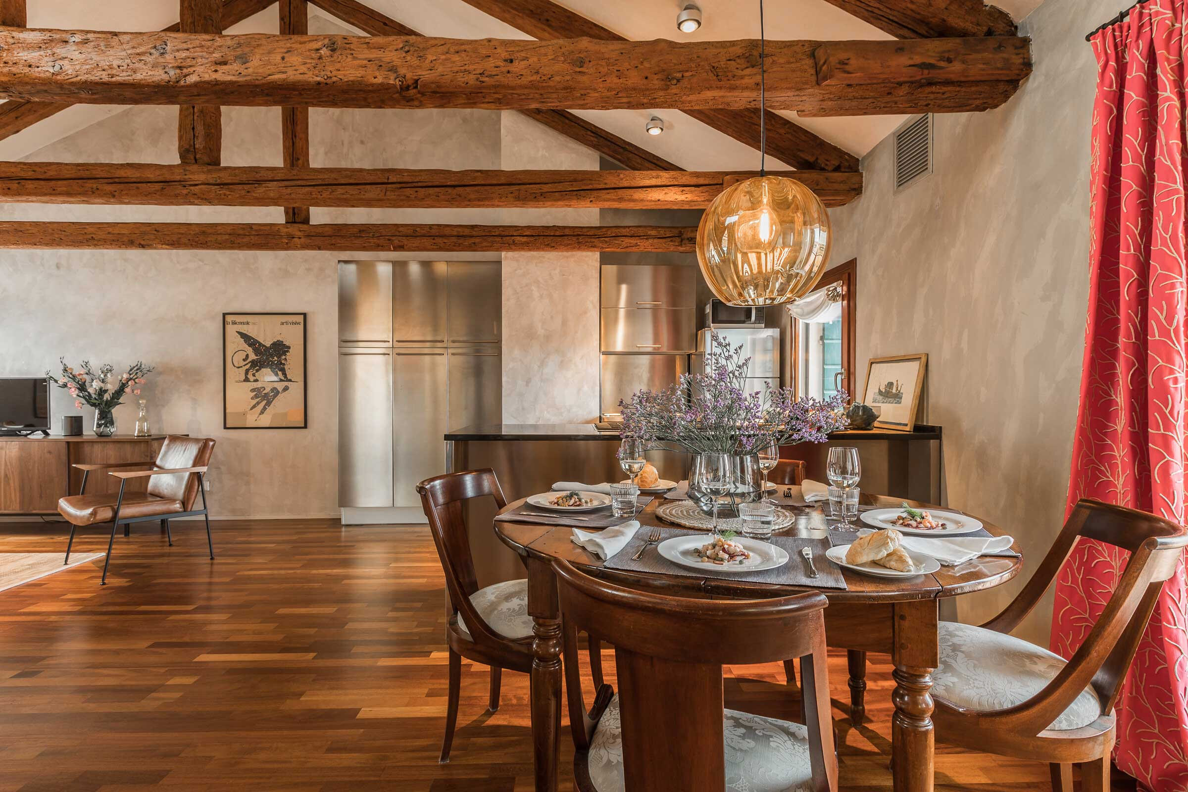 The terrace is by far the highlight of the property: the view that you can enjoy from here is simply stunning. On clear days you can spot the Dolomites on the north; San Marco, the Salute Church and San Giorgio Island on the west; the Venetian Lagoon and the Lido Island on the south. The sunny Altana (traditional wooden roof-top terrace) is furnished with a table and 4 chairs which is perfect for a relaxing breakfast or an aperitif at sunset.