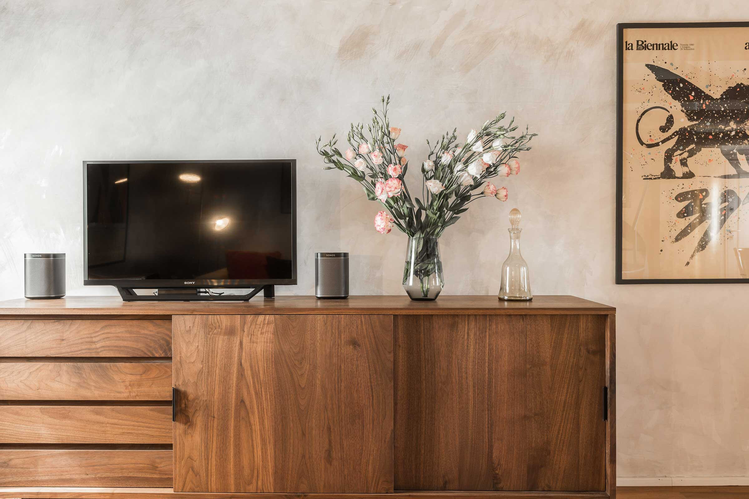 The high-tech kitchen features a professional 5 gas burners stove, large fridge, dishwasher, freezer, gas oven, kettle, etc. The amenities of this apartment include washing machine, Wi-Fi, air conditioning in the living area, independent heating system, Smart TV and Sonos sound system.