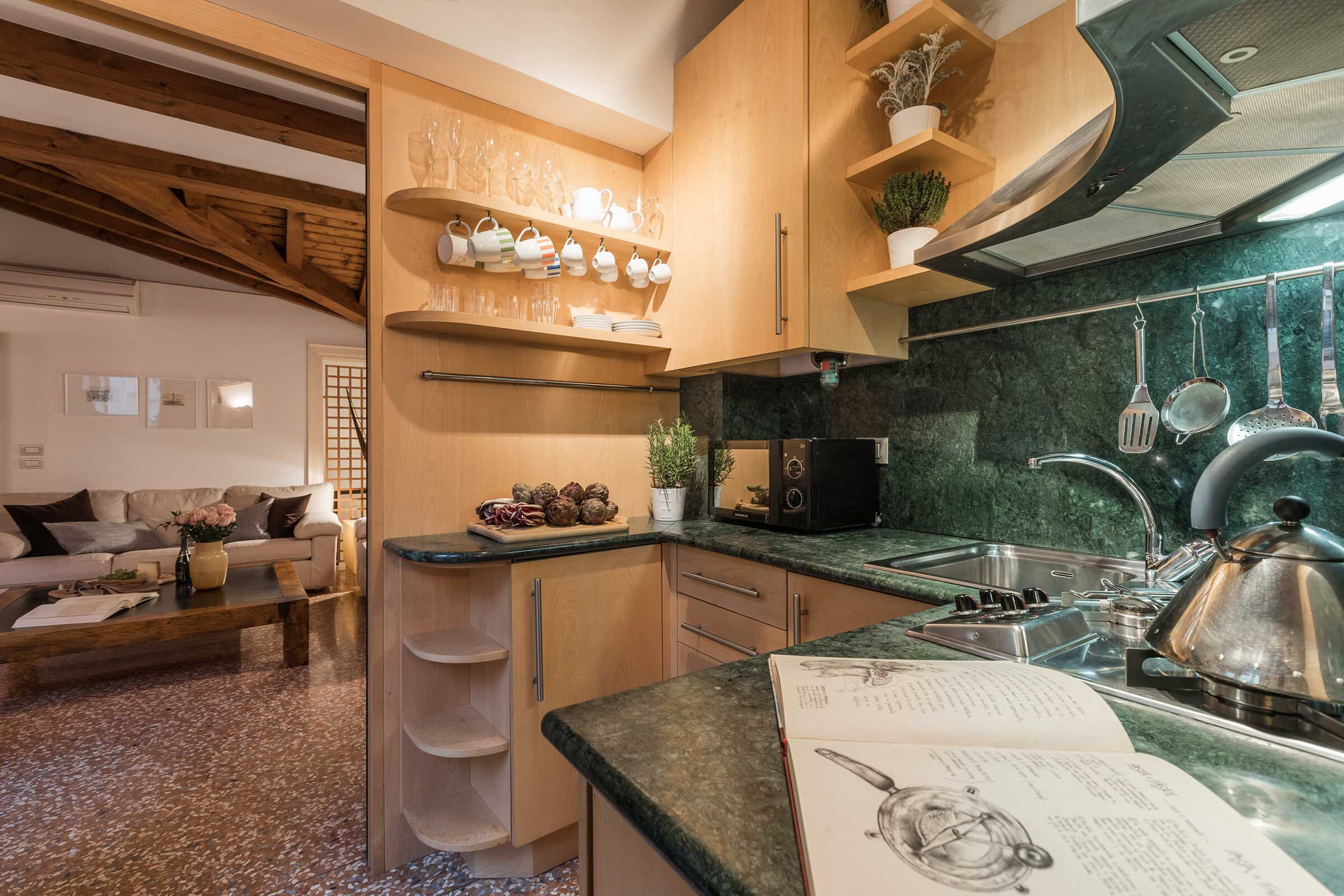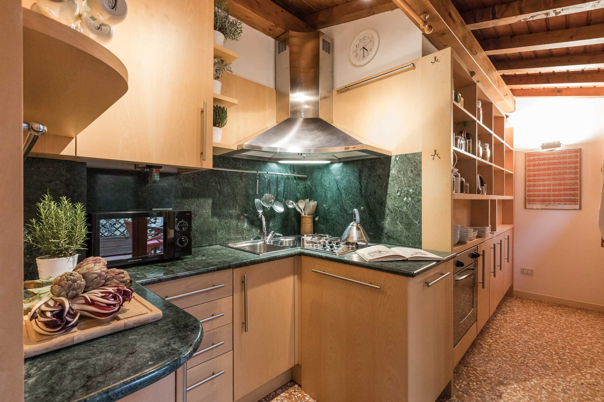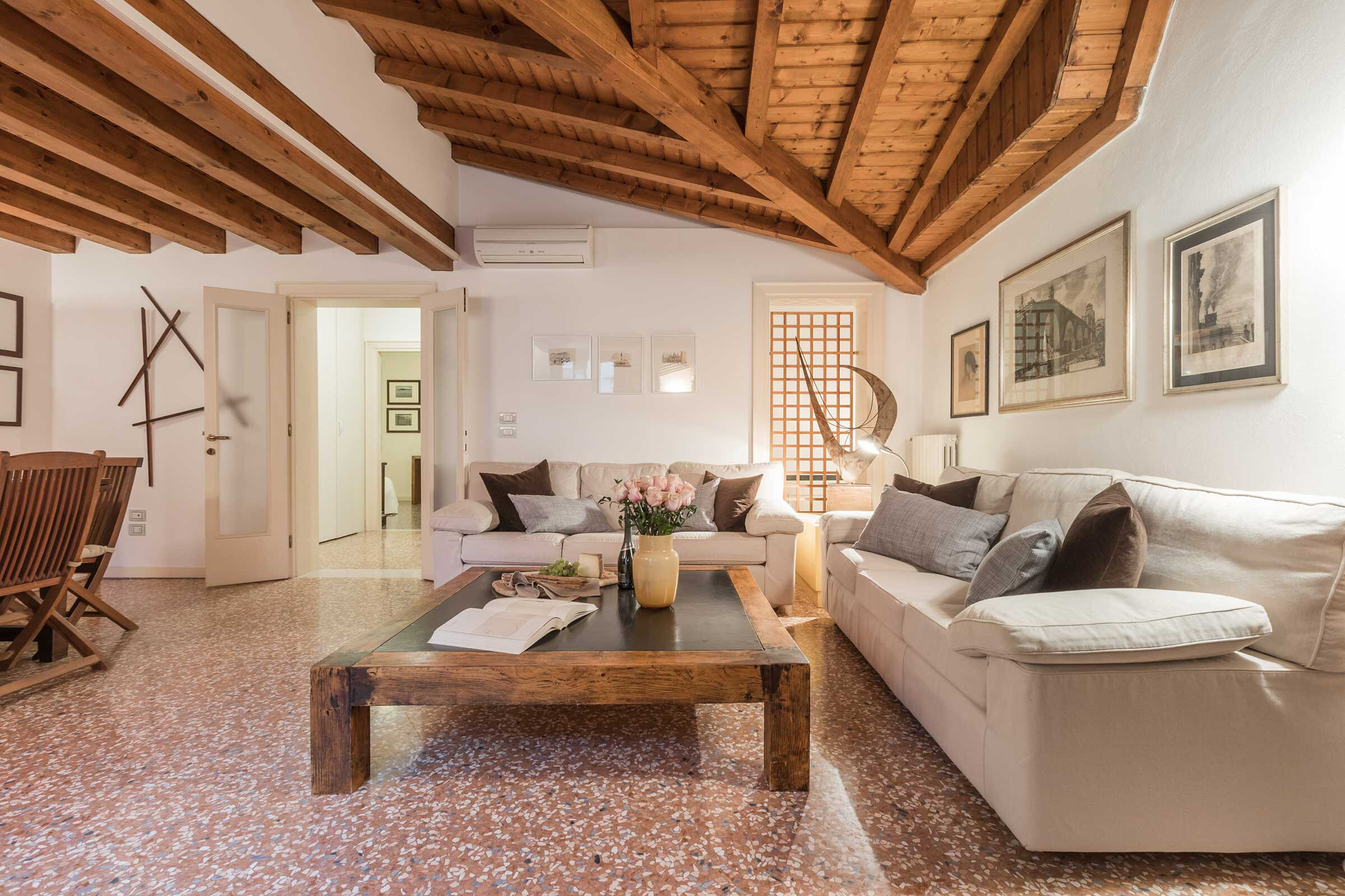 The spacious living room has a slightly Latin feel, with Terrazzo Veneziano flooring, wooden beamed ceiling, plenty of natural wood furniture and interesting artworks. The master bedroom is furnished with a queen size bed, built-in wardrobe and a nice desk; the second bedroom has two single beds that can be set up as a double, plus built-in wardrobe. The kitchen is fully equipped and has stylish dark green marble countertop. The white marble bathroom has a large shower cabin.