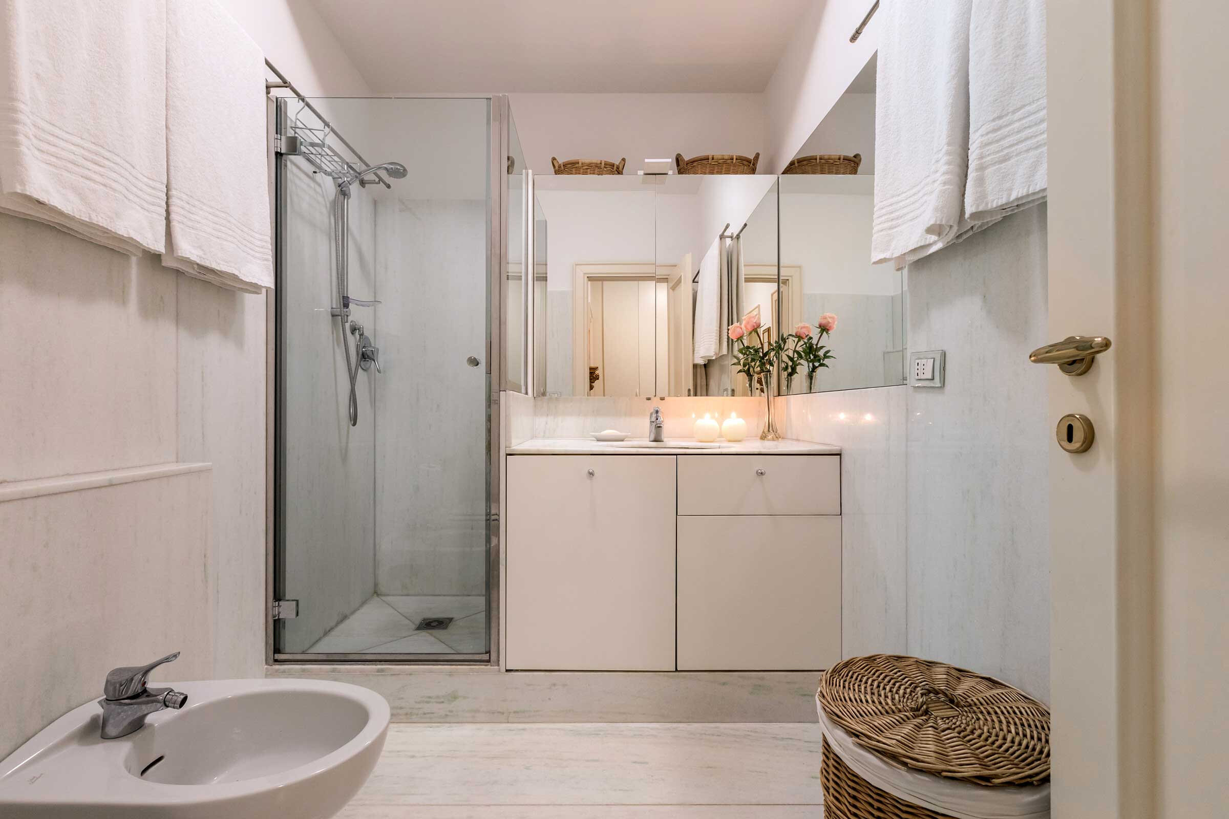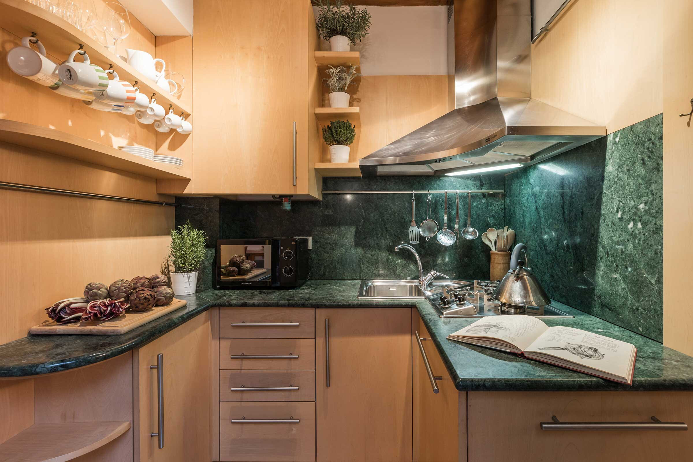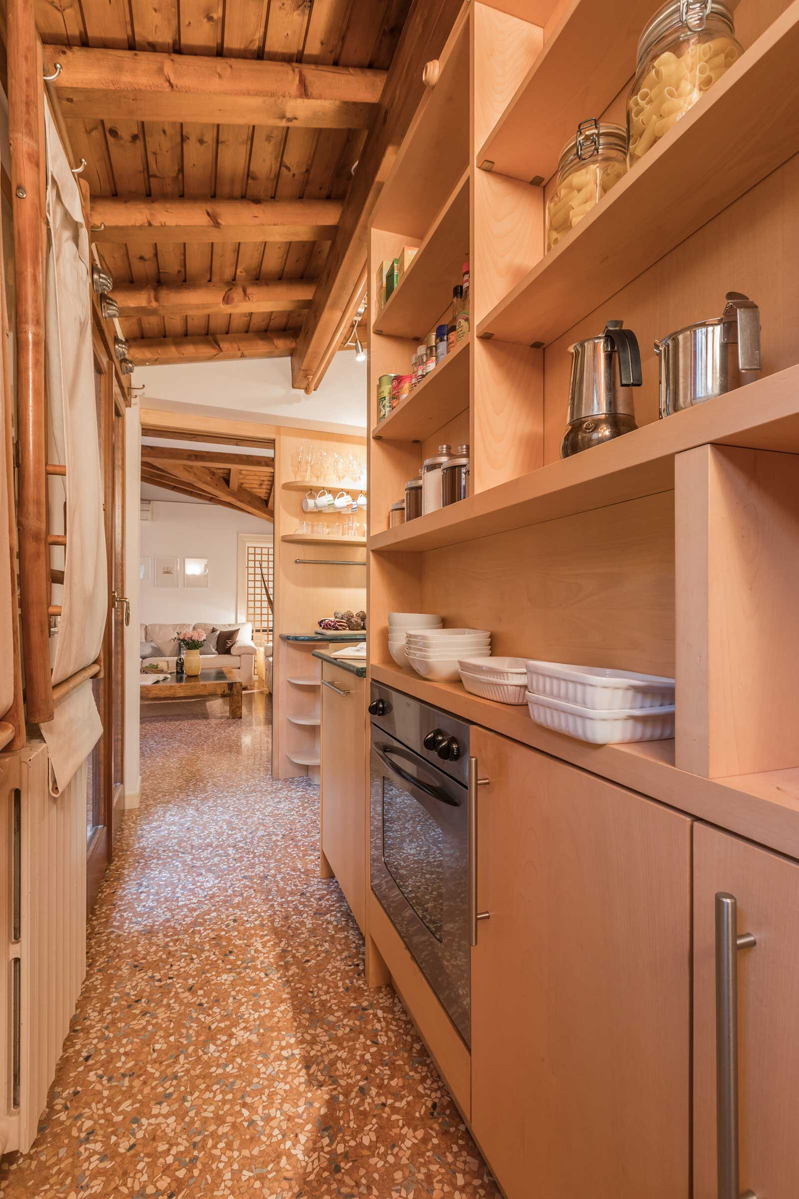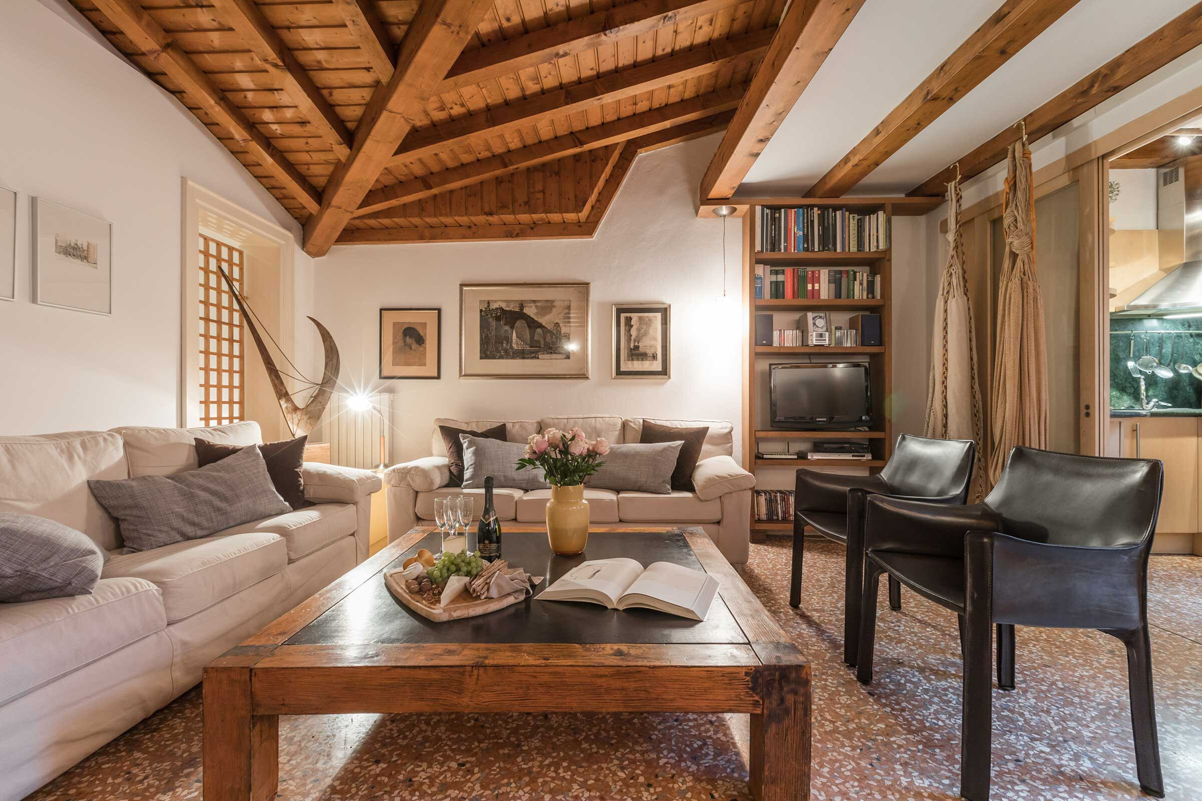 The spacious living room has a slightly Latin feel, with Terrazzo Veneziano flooring, wooden beamed ceiling, plenty of natural wood furniture and interesting artworks. The master bedroom is furnished with a queen size bed, built-in wardrobe and a nice desk; the second bedroom has two single beds that can be set up as a double, plus built-in wardrobe. The kitchen is fully equipped and has stylish dark green marble countertop. The white marble bathroom has a large shower cabin.
