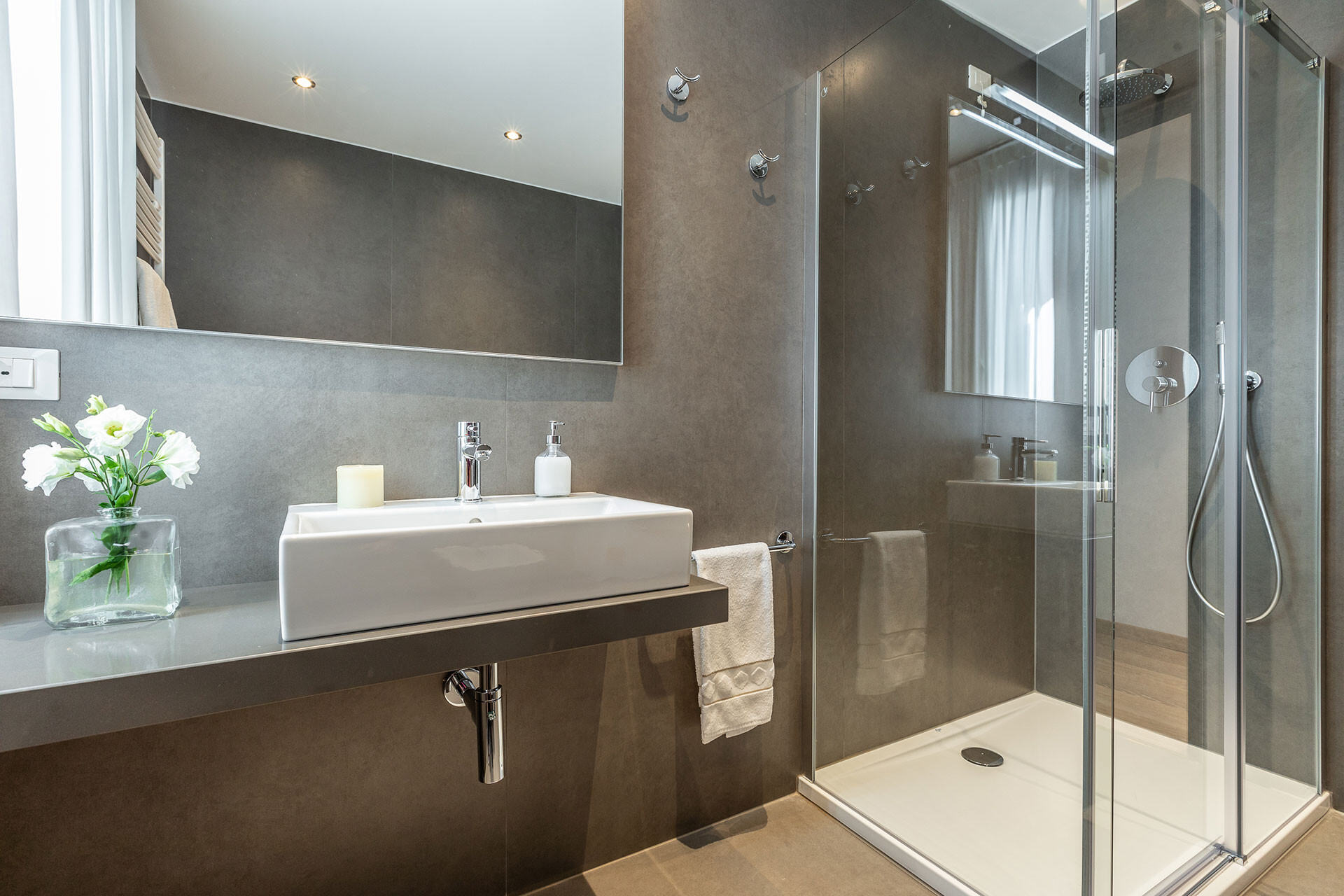 The Carmen apartment is about 80 square meters large and consists of a living and dining room with a comfortable sofa and a table for up to 6 people; two double bedrooms, the first has a king size mattress, the second has two single mattresses that can be set up as one double bed on request; two full bathrooms, the first next to the living room is very spacious, the second between the bedrooms is smaller, both features a nice shower cabin; a spacious and functional kitchen equipped with a set of professional cooking pots, pans, utensils and porcelains, 4 induction stoves, dishwasher, oven, microwave, kettle, toaster and coffee maker.