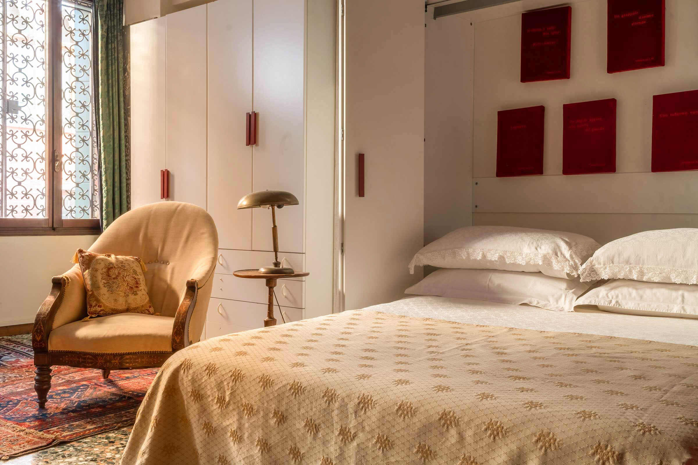 Beside plenty of sofas and couches, the loft is equipped with a brand-new queen-size wall-bed that can be hidden behind a heavy curtain separating what we consider the second bedroom from the living room. When the second bed is not needed the same space can be used as a lovely canal view reading room: with some effort it is possible to open the private water door and choose a book from the large library available at the apartment, sitting right in front of the gondolas sliding along the canal savouring a good glass of wine, that's Venice!