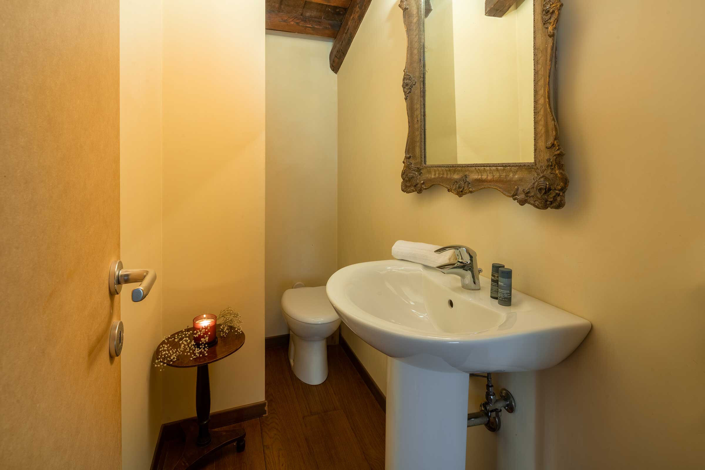 You can access the master bedroom located at the first floor through a rather narrow wooden stairway. It measures about 30 square meters, features high wooden beamed ceiling, is particularly luminous and two of the four windows face the canal. There is also a small toilet room accessible through a short staircase.