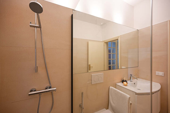 The tall ceiling with large skylights and the old wooden trusses enhances the uniqueness of this place. After the entrance room there is a full bathroom with bathtub and shower screen, the kitchen follows immediately before reaching the loft-style living room. The kitchen has been restored in 2021 therefore it is functional and fully equipped with contemporary electrical appliances, plus it opens on the dining area through an antique stones window, making it easy and convivial to cook for your guests.