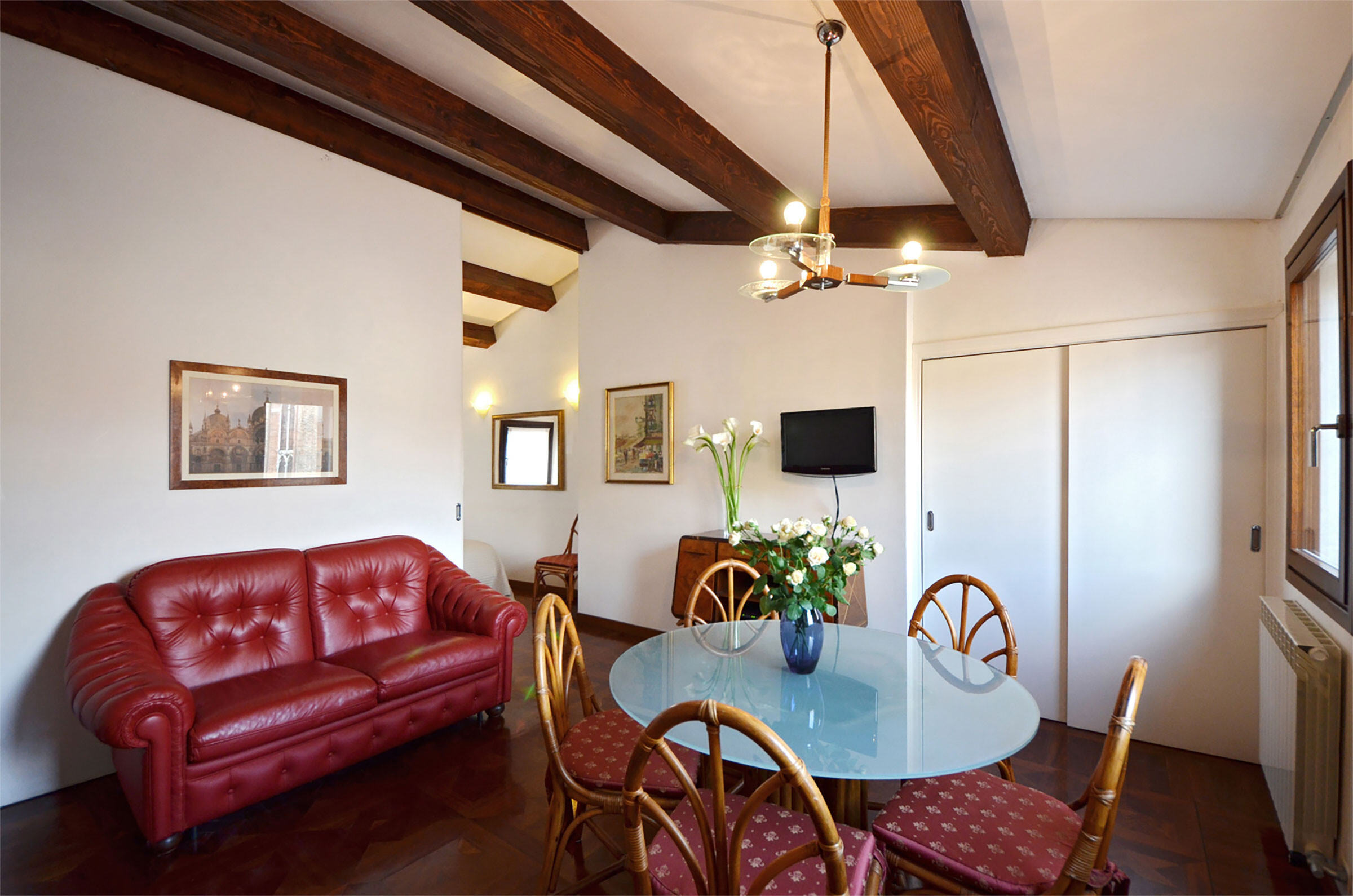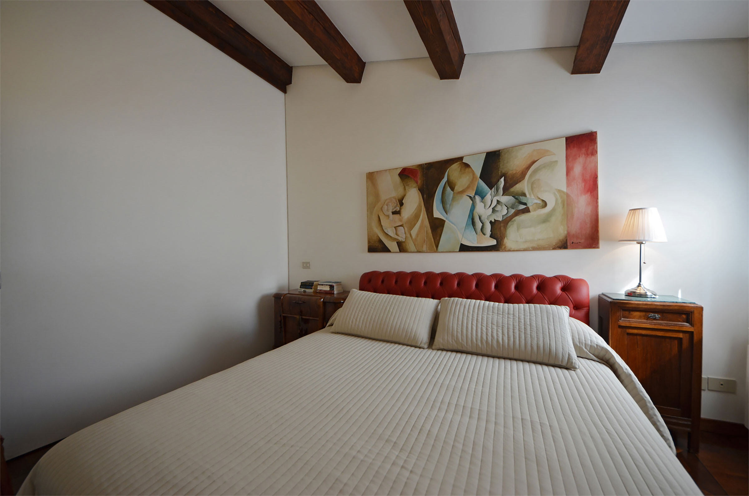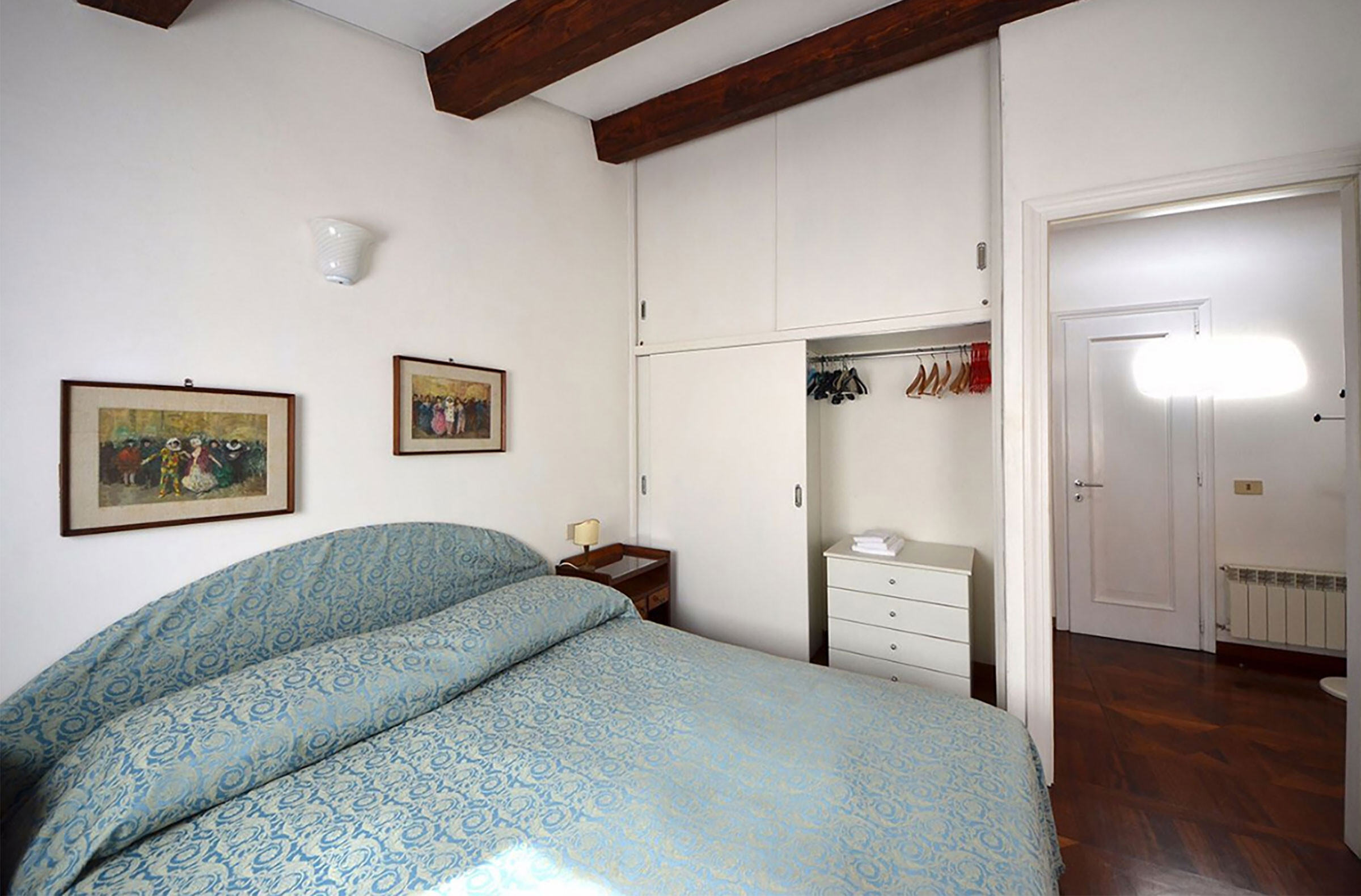 The Frari is a third and top-floor apartment full of natural light that features high wooden beamed ceiling and nice parquet flooring. This apartment is very well laid out to maximally optimize space. The first bedroom has a big built-in wardrobe where you can store many luggage, the second bedroom is part of the living room but can be separated with a well thought sliding door. Please see the pictures in the gallery for further reference. Some closet space is provided also in the second bedroom. In the living room there is also a comfortable sofa-bed in case you need three separate beds. The kitchen and the cupboards of the living room are spacious enough to store necessary pots, pans, utensils, plates, cutlery, glasses.