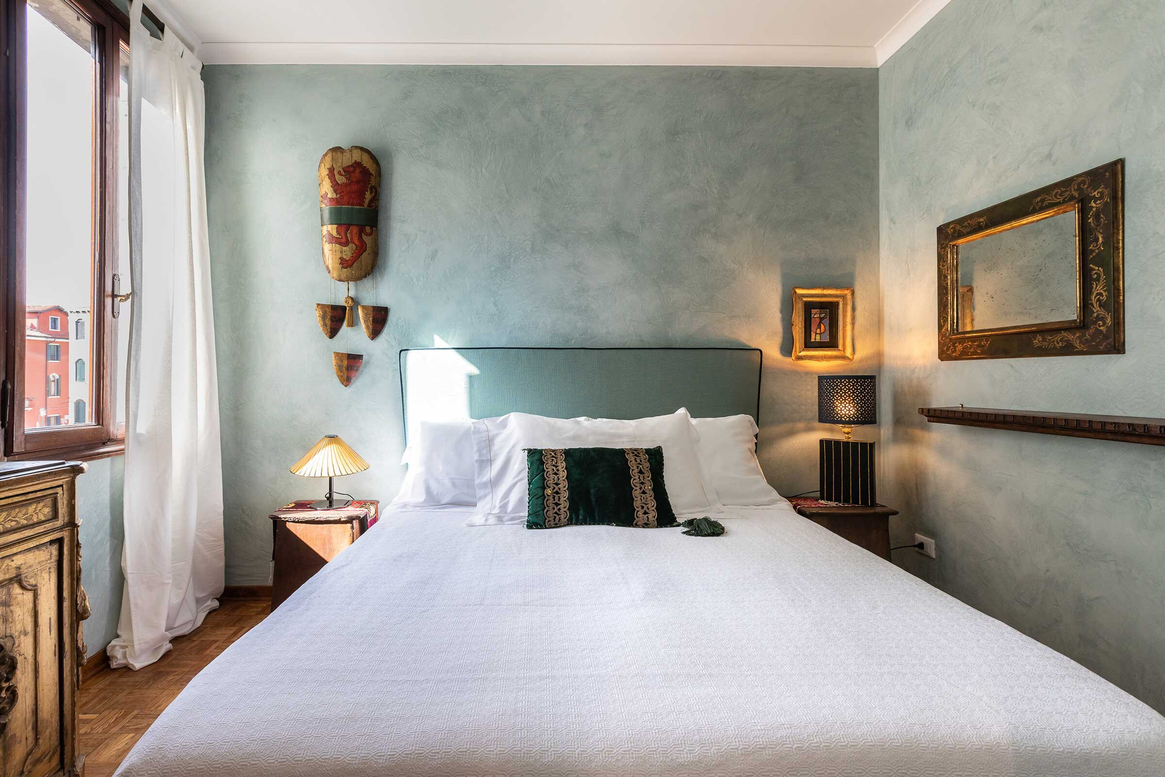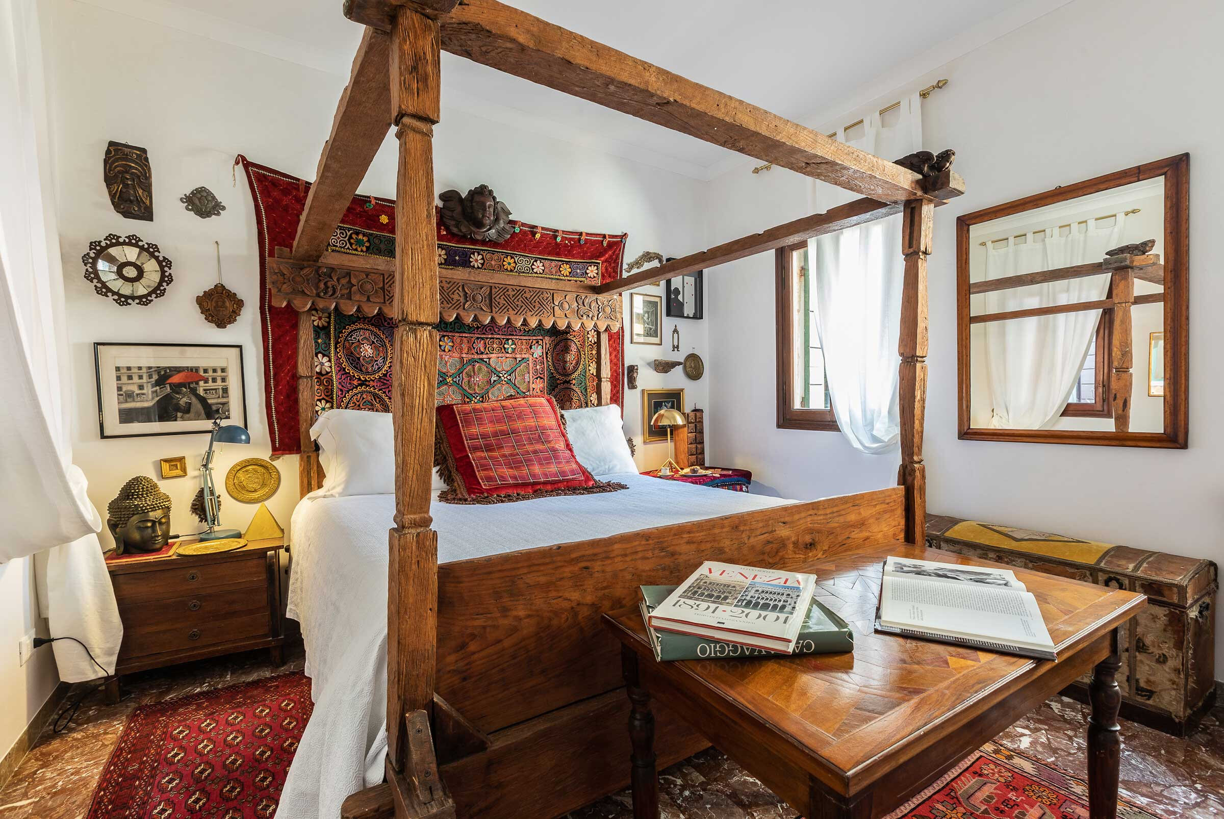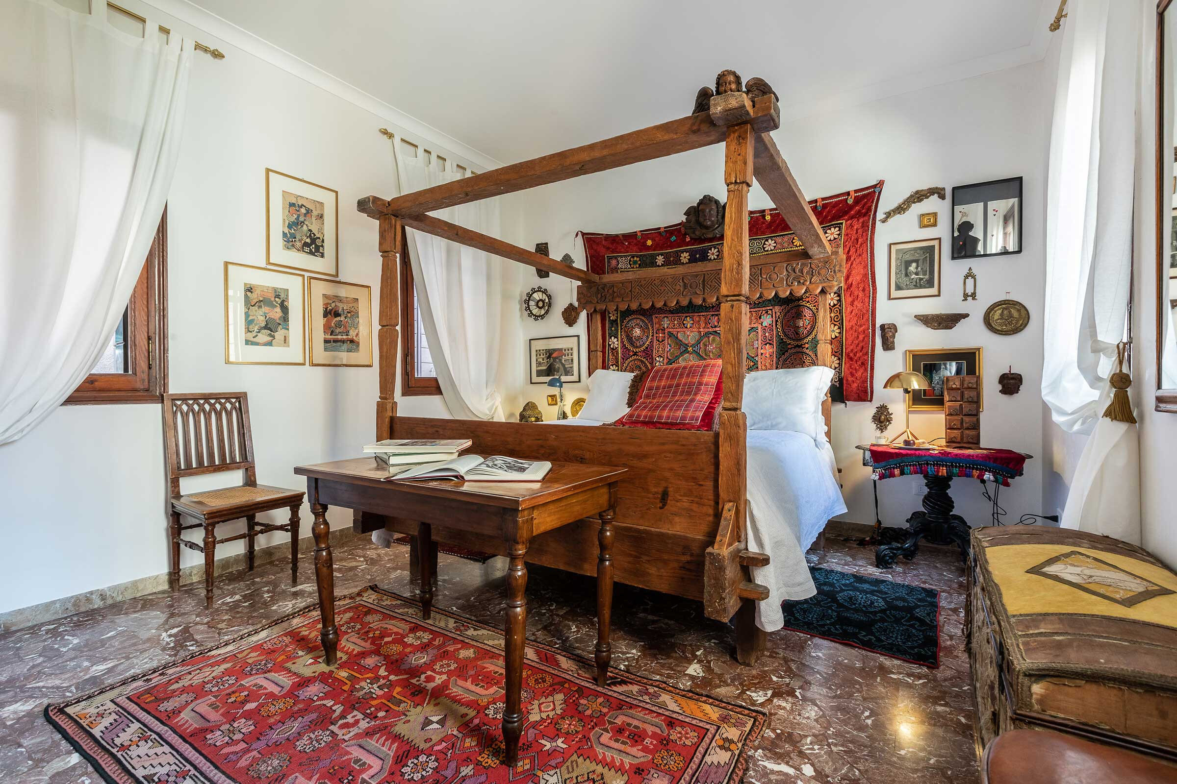 A gorgeous wooden and metal staircase leads to the first floor, composed of: the main bedroom with a stunning antique four poster bed, a smaller but very charming bedroom with a twin-size bed (120x190cm), and a renovated bathroom with large shower. In the attic floor there is a third bedroom with a beautiful queen size bed and a luxurious bathroom with bathtub. In total this apartment sleeps comfortably 5 people. The rooms are enriched by a selection of interior details from the Owner’s family collection, expertly curated to confer that sophisticated flair of the Venetian eclecticism.