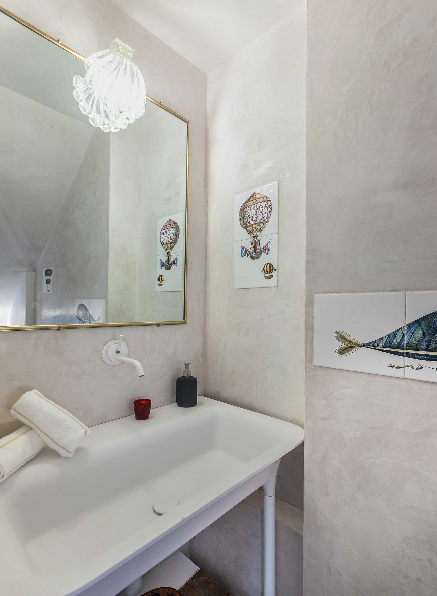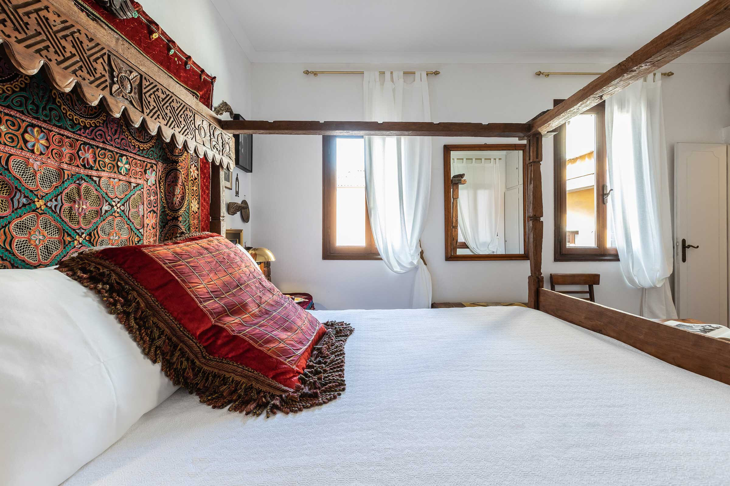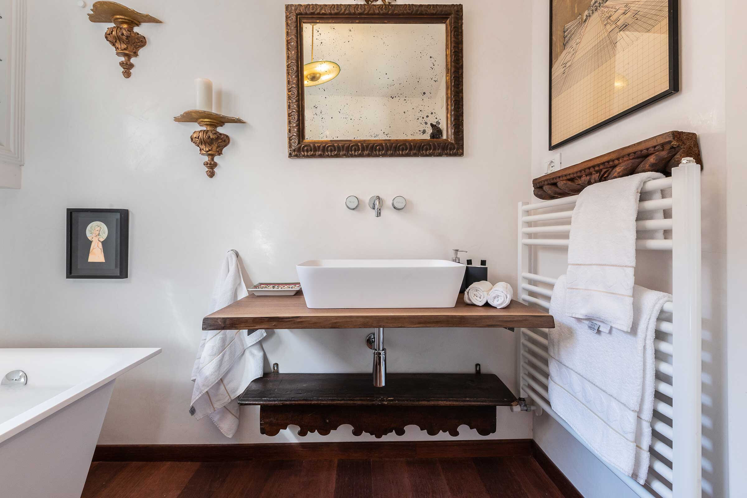 A gorgeous wooden and metal staircase leads to the first floor, composed of: the main bedroom with a stunning antique four poster bed, a smaller but very charming bedroom with a twin-size bed (120x190cm), and a renovated bathroom with large shower. In the attic floor there is a third bedroom with a beautiful queen size bed and a luxurious bathroom with bathtub. In total this apartment sleeps comfortably 5 people. The rooms are enriched by a selection of interior details from the Owner’s family collection, expertly curated to confer that sophisticated flair of the Venetian eclecticism.
