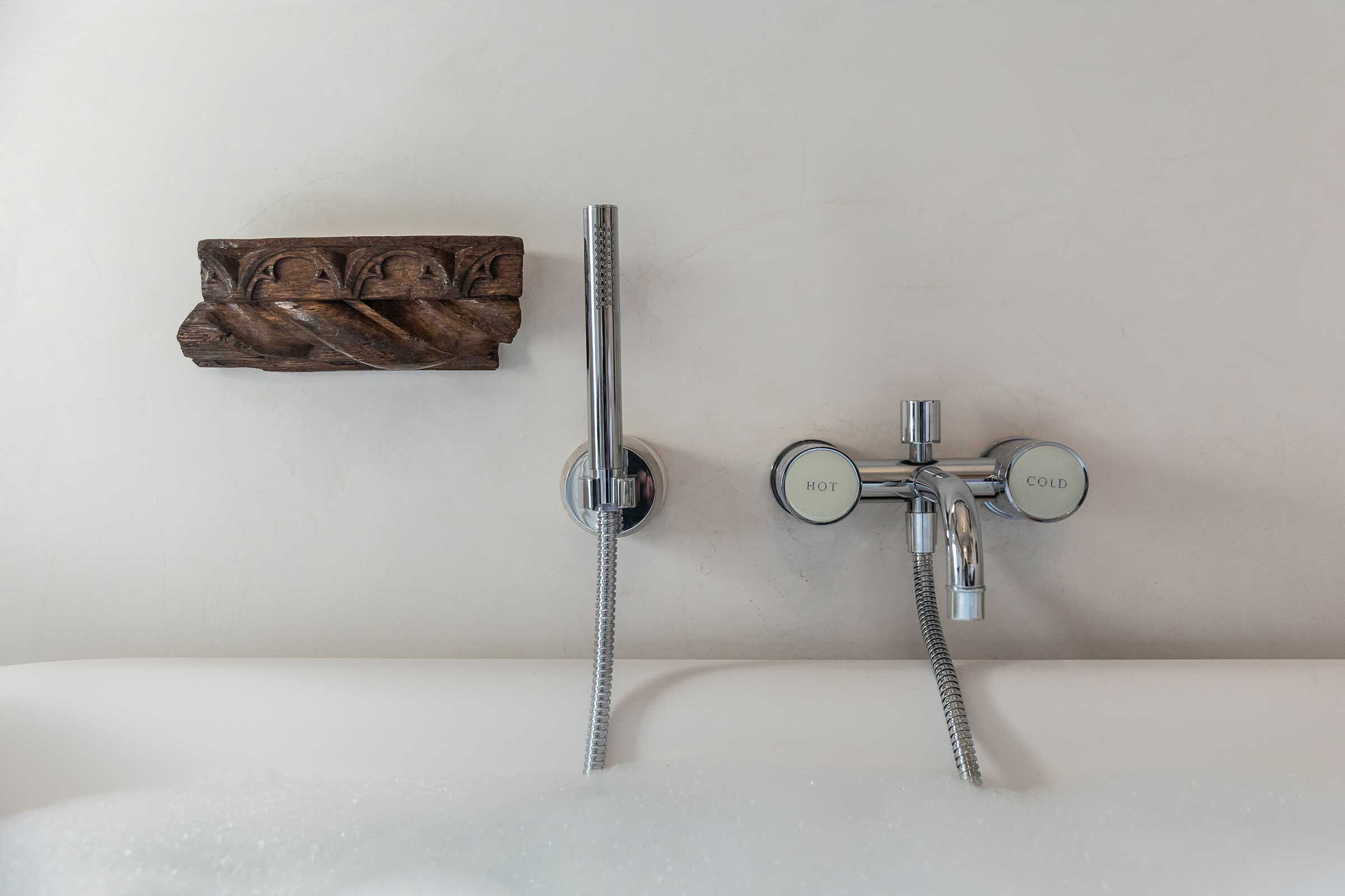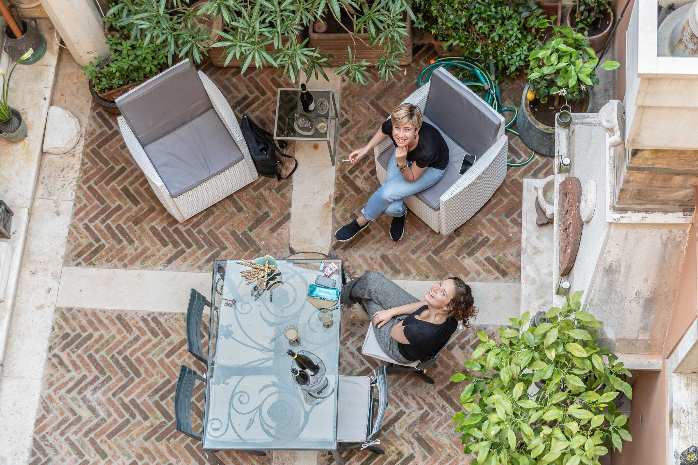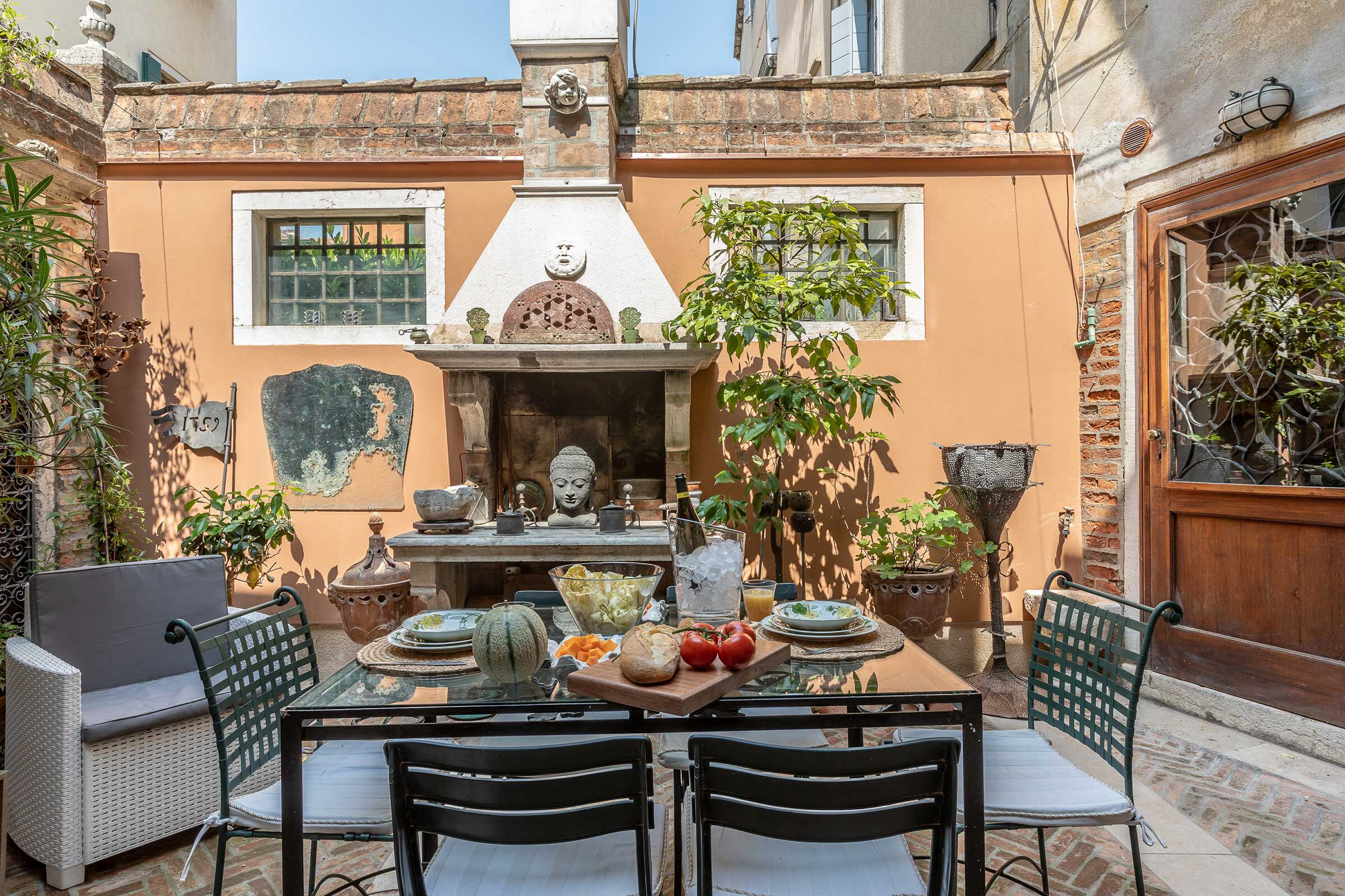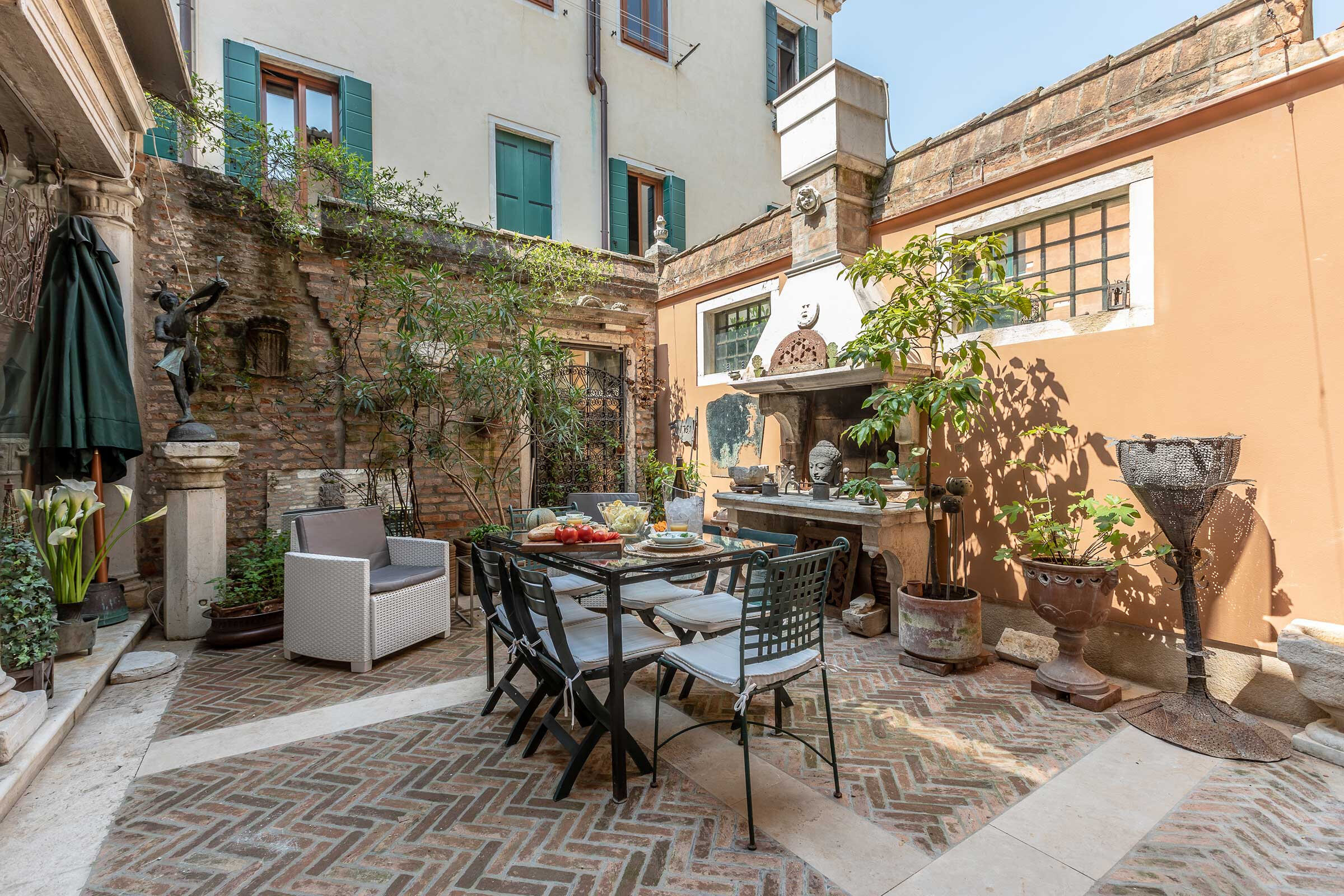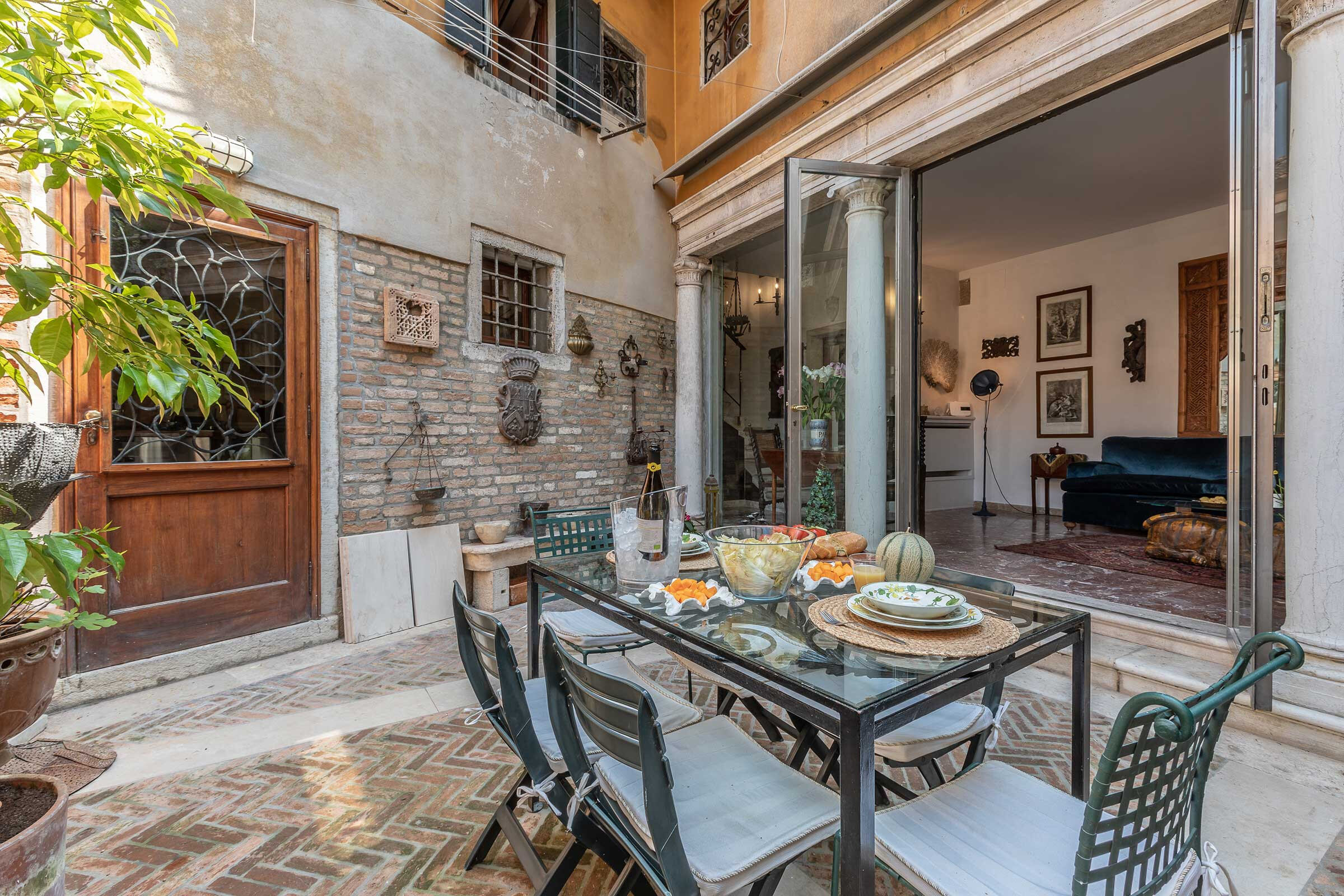 In particular the living room is divided from the private courtyard only by two ancient marble columns and a glass wall, conferring the feeling of a large open-air living room. In the courtyard are found interesting antique iron and stone details, a fireplace and a good size table with sun umbrella, for great out-door breakfasts or candle-light dinners!