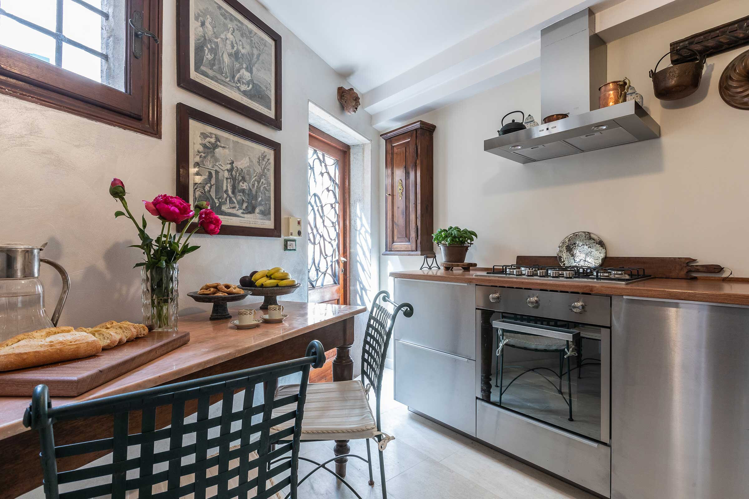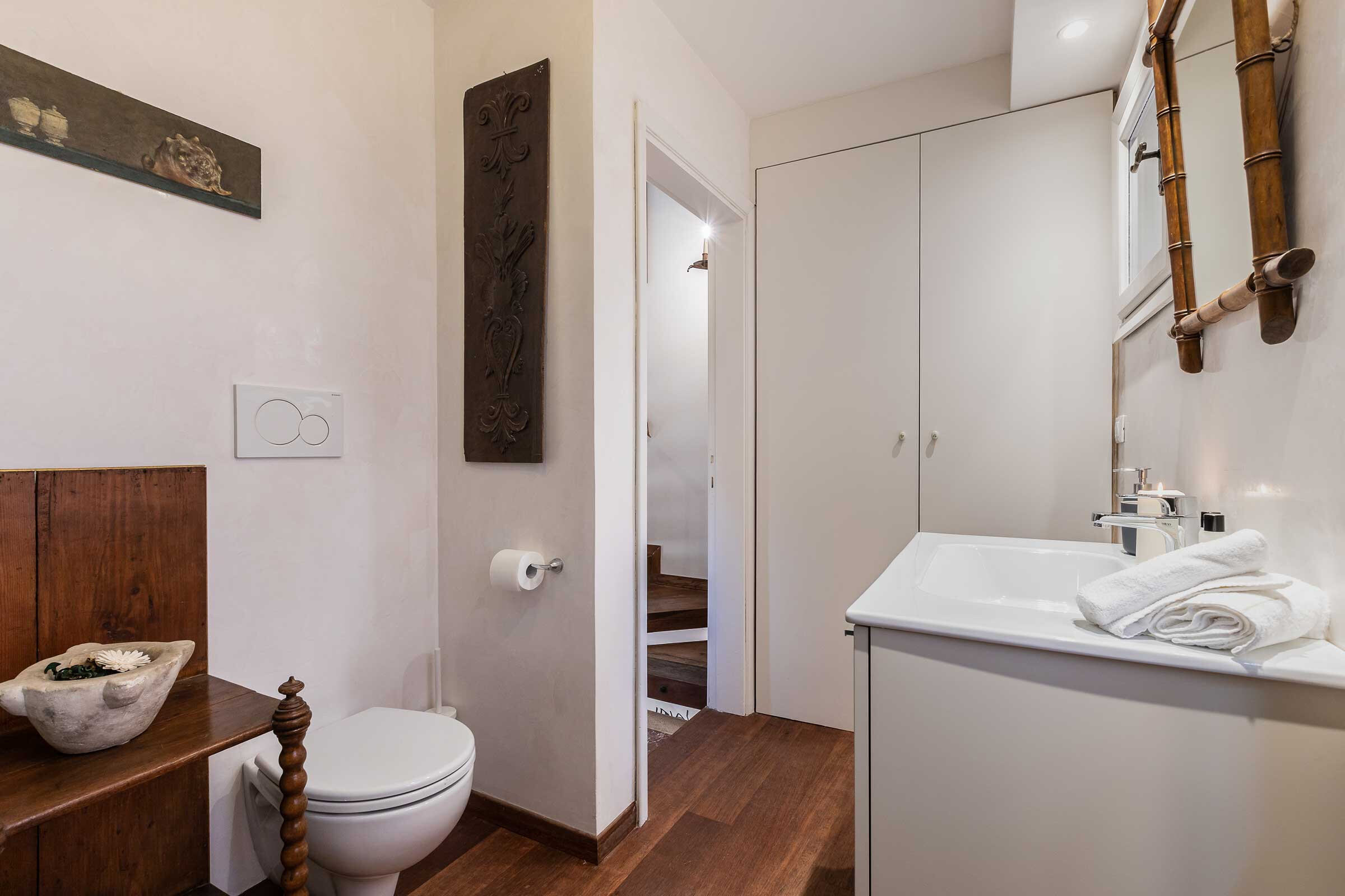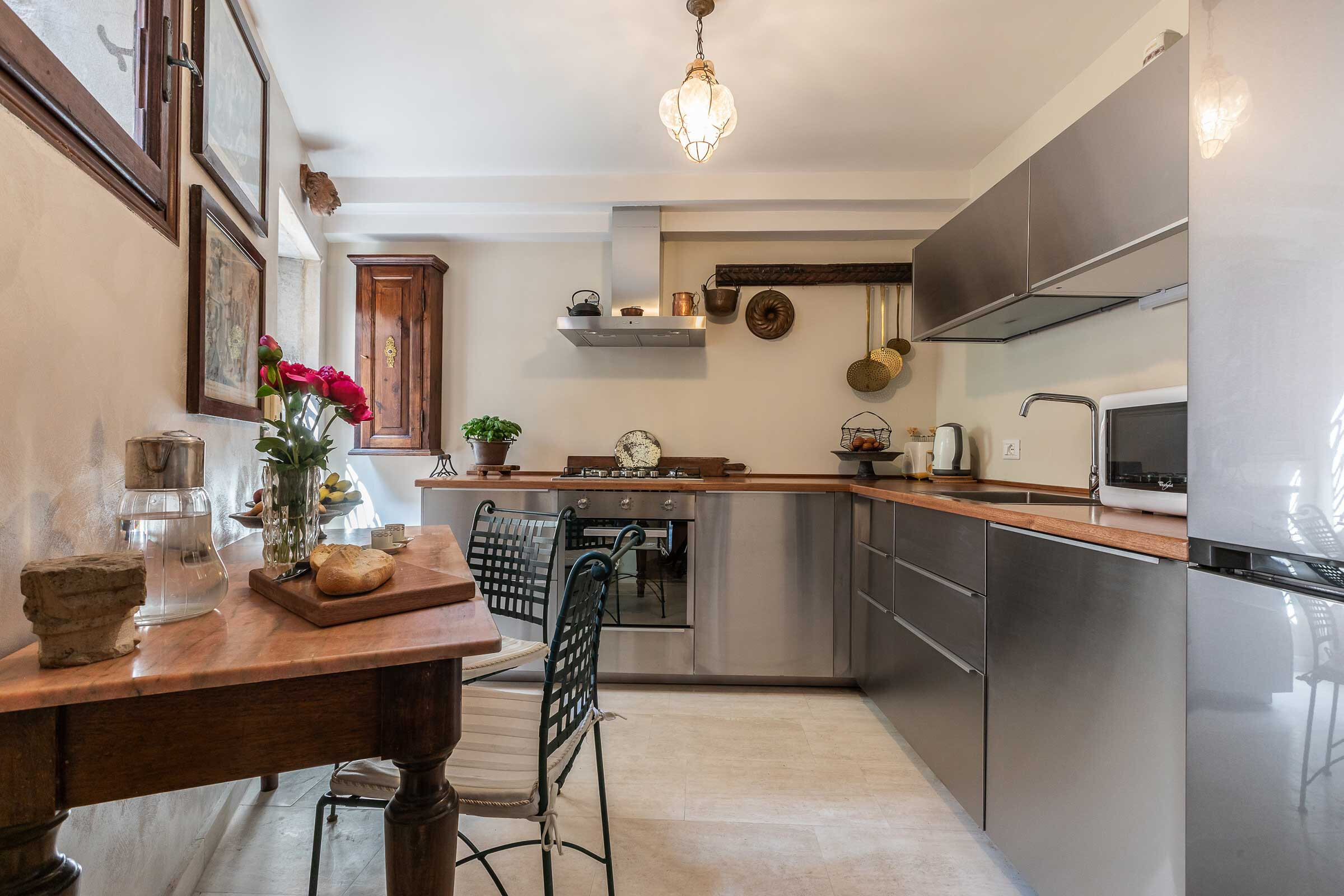 From the courtyard you can access also the newly renovated steel kitchen where there is a large fridge with freezer, oven, microwave, kettle, 5 burners gas stove, dishwasher, beside all the basic equipment of a modern kitchen. The ground floor is completed by a small but stylish toilet and a small entrance room.