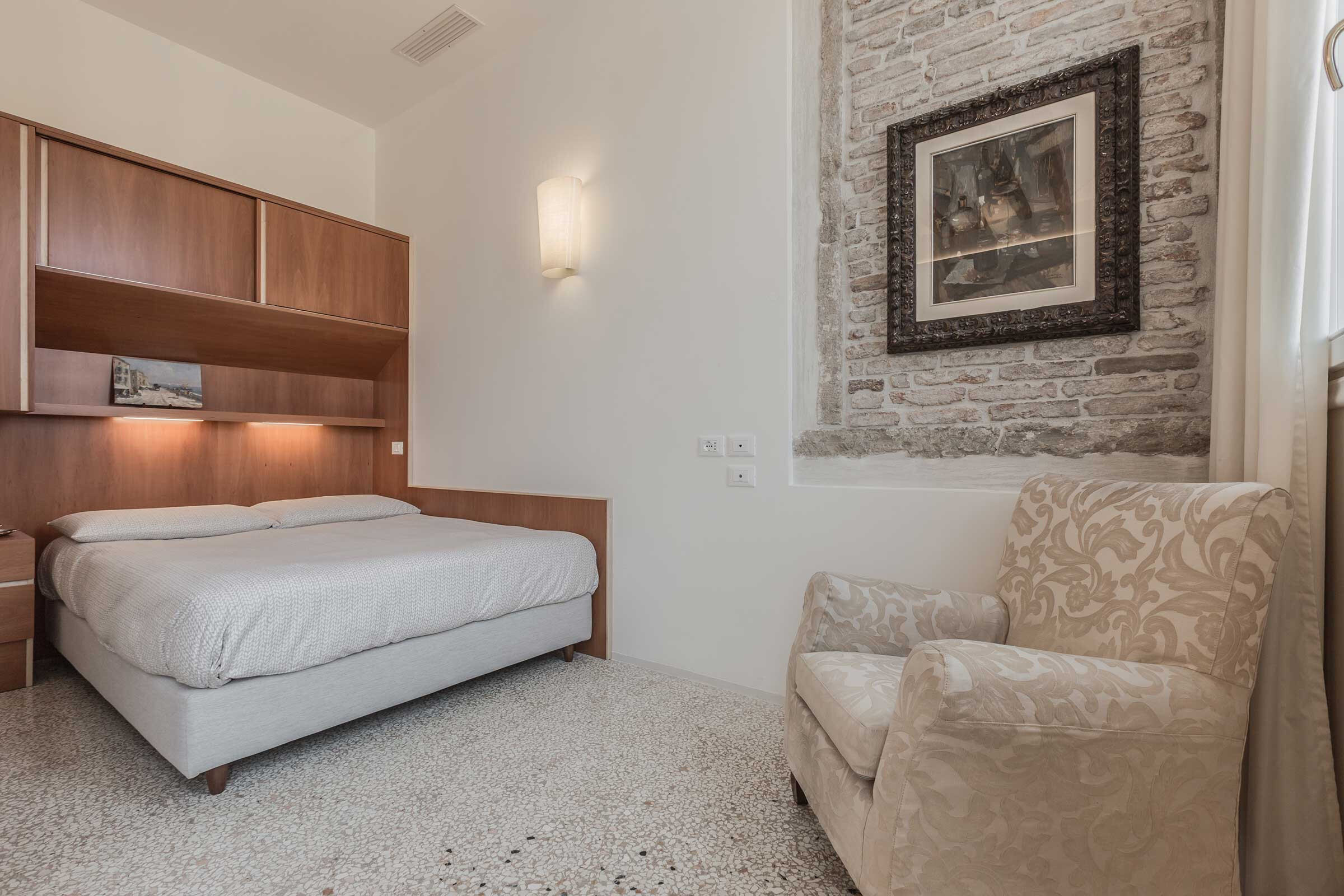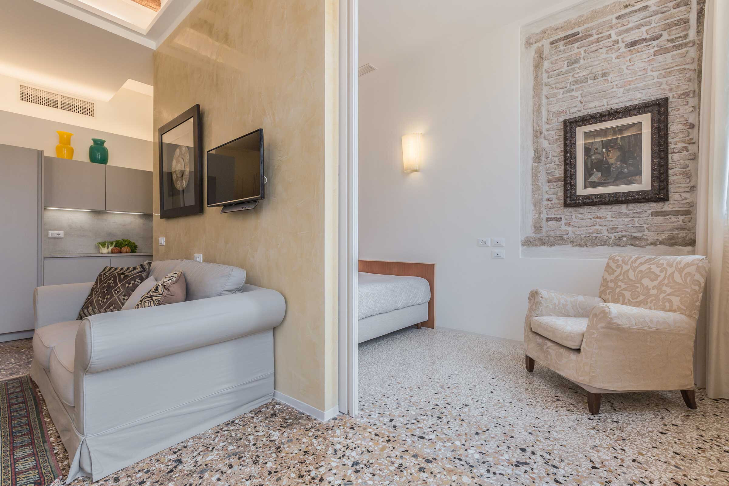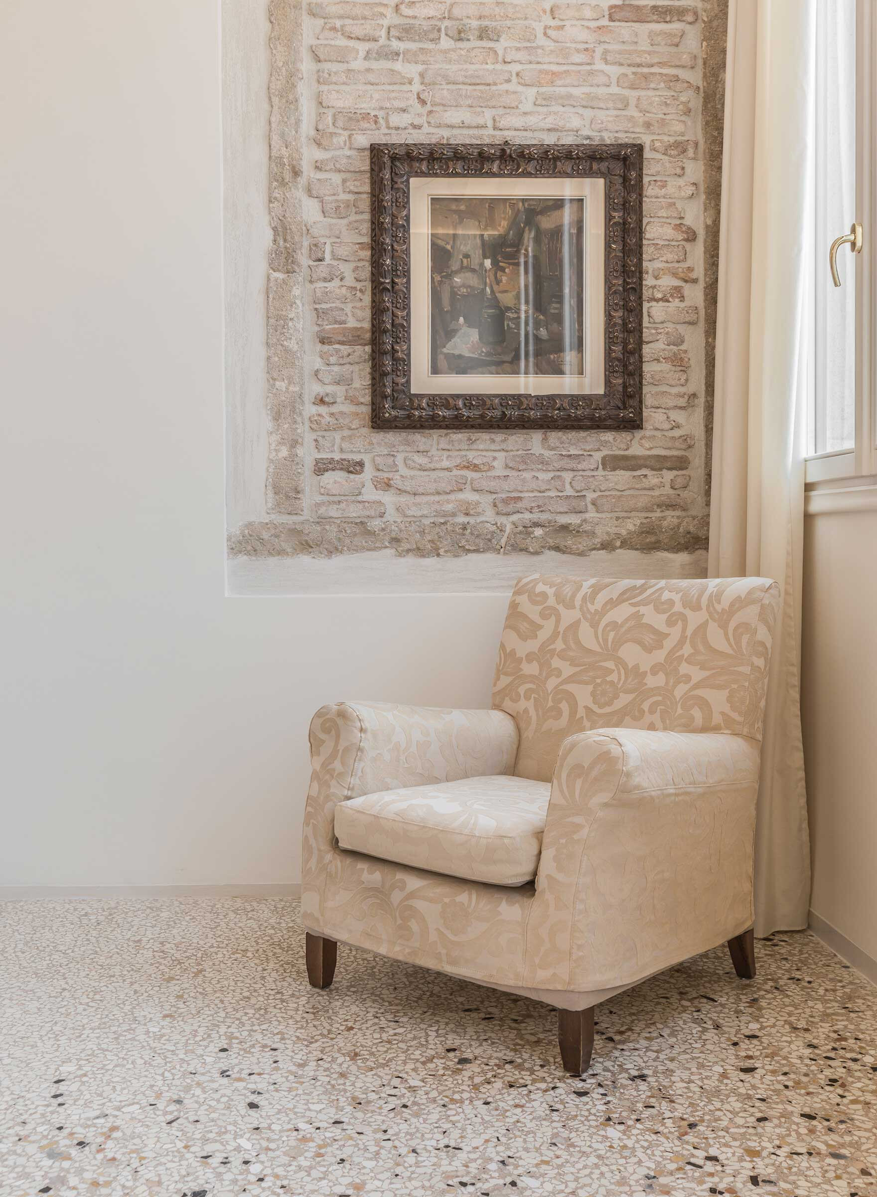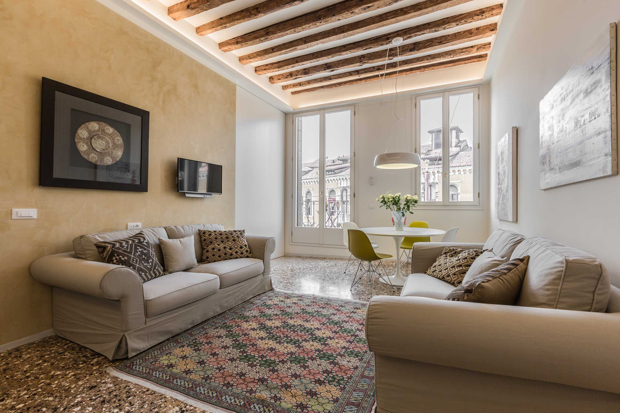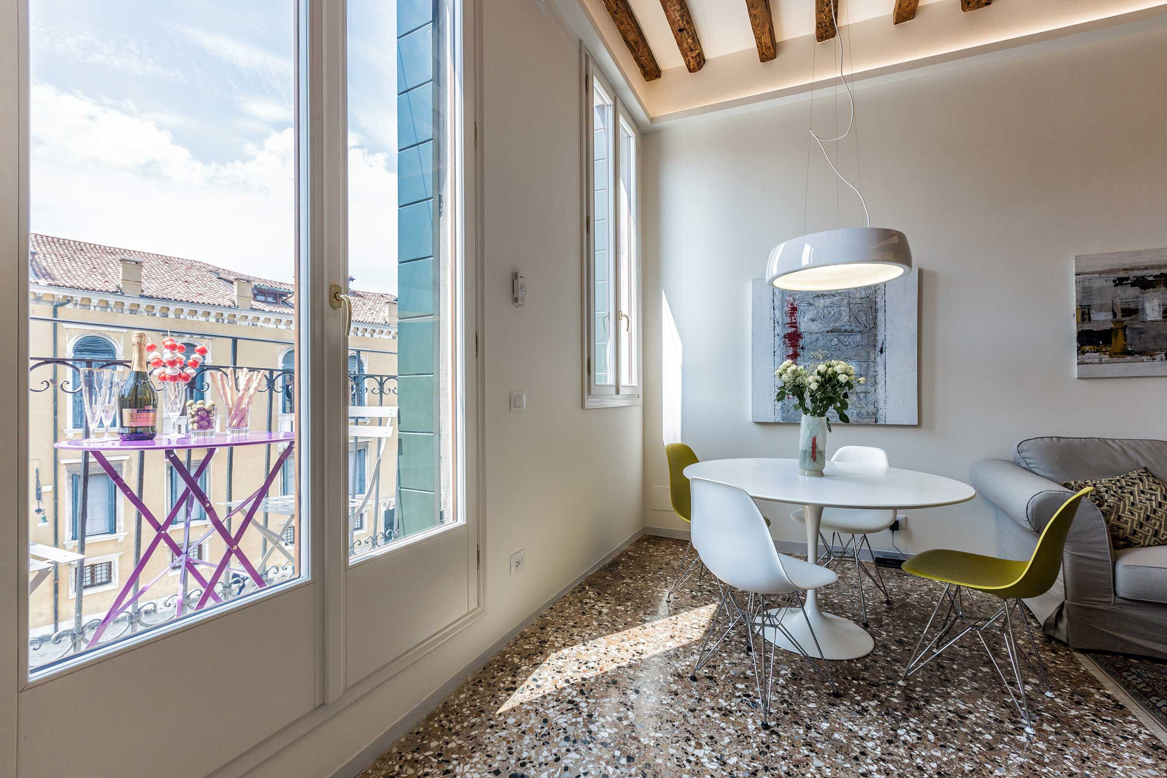 Full of natural light, elegantly furnished with some renown designer pieces, the Manin is truly comfortable for everyone, be it a family with children or a romantic couple. Authentic Terrazzo Veneziano flooring, antique wooden beamed ceiling, precious mosaic tiles in both bathrooms, luxury shower cabins are only some of the highlights of this property.