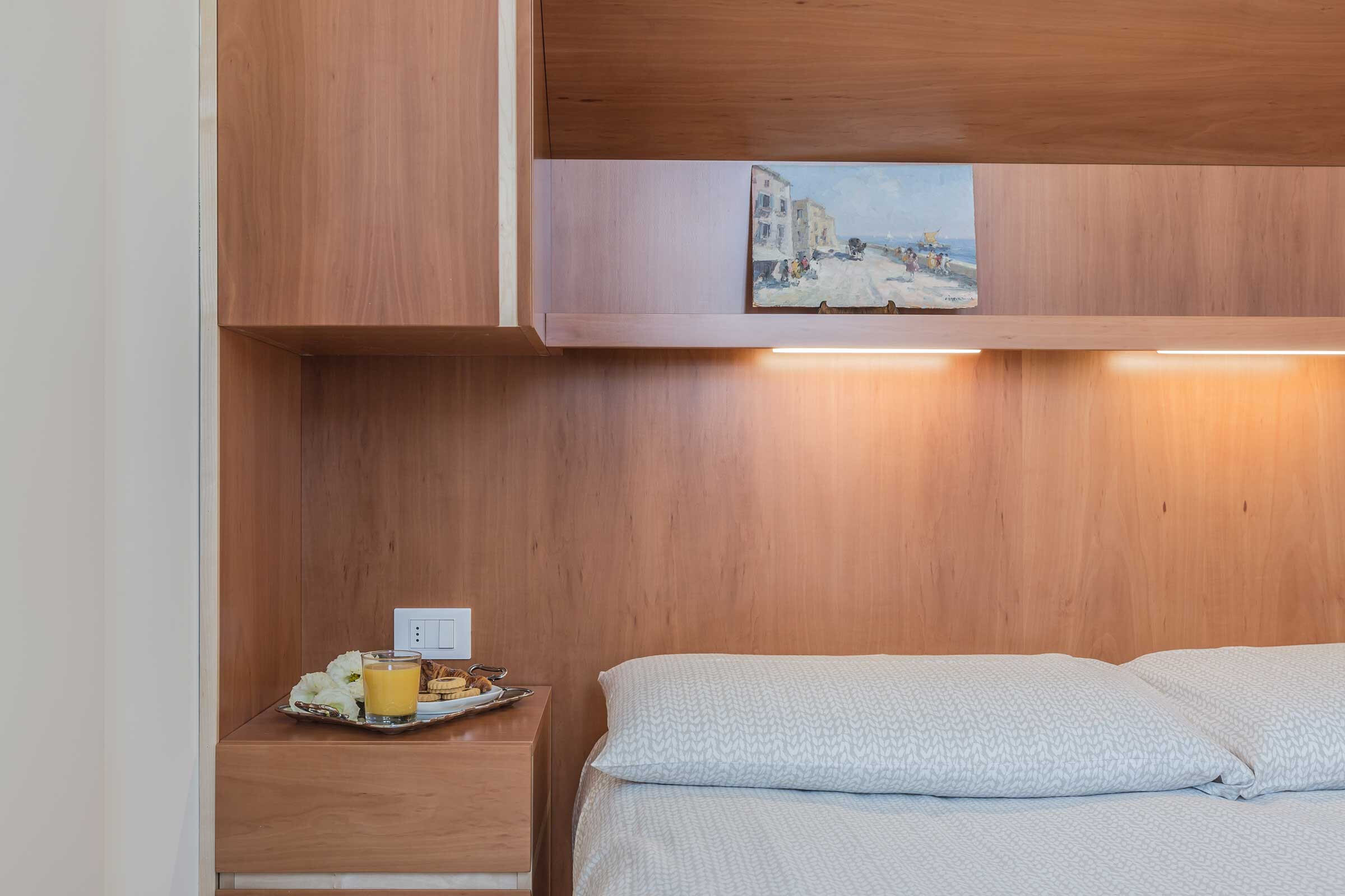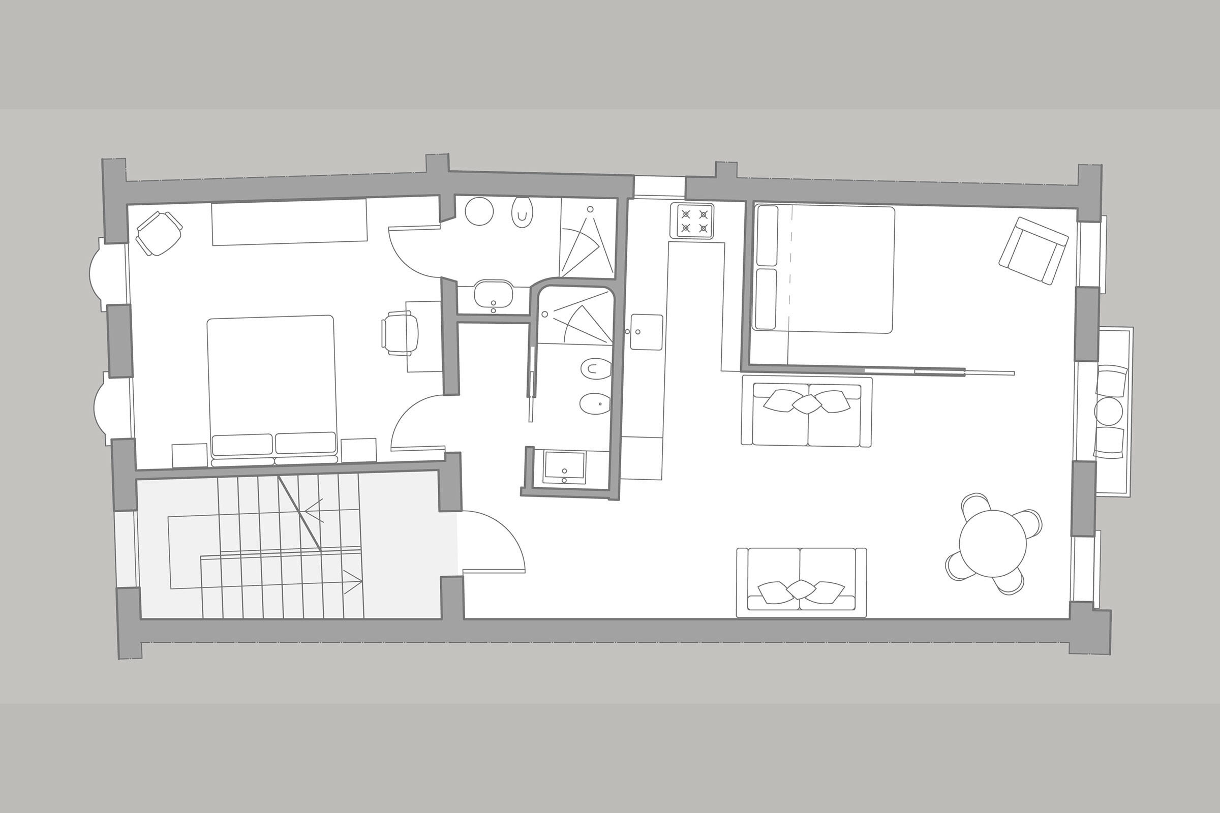 It is laid out on about 80 square meters and is composed of a living and dining room with two comfortable sofas and a table for up to 6 people, a functional kitchen equipped with brand new appliances, the main bedroom with en-suite bathroom and a second smaller bedroom with a second bathroom. In the main bedroom there are 2 single beds that can be also used as king size bed on request; the second bedroom can be accessed through a sliding wall in the living room (this room can be completely separated and closed from the living room) and is equipped with a queen bed (160 cm wide by 200 cm long mattress).