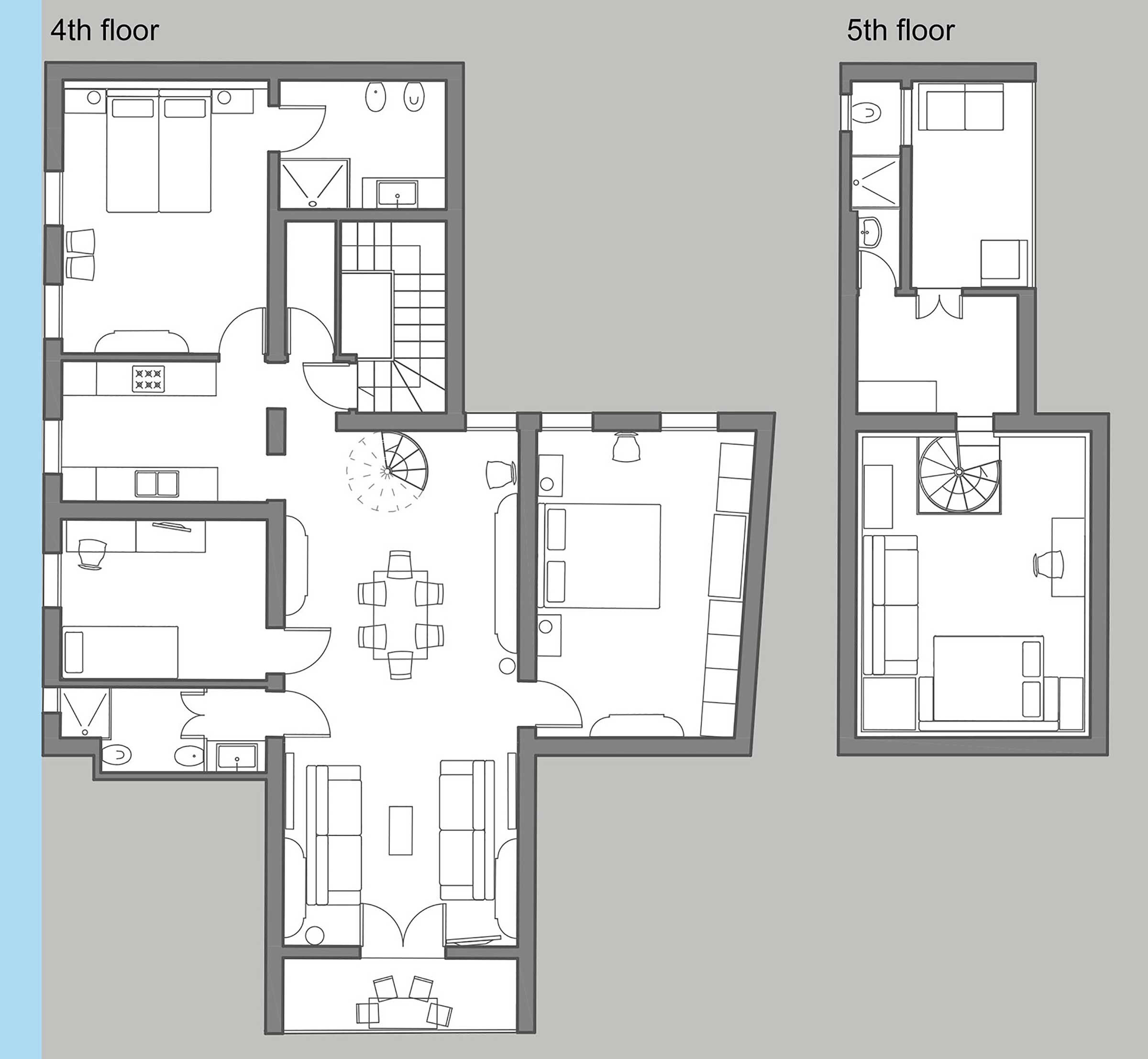 The Nabucco apartment is laid out on about 160 square meters and is composed of a large living and dining room with two large sofas and an extensive library, plus a table that can be extended to seat up to 8 people in comfort. The brand-new kitchen has been equipped with every sort of electrical appliance. There are two king size bedrooms and a single bedroom all of which are equipped with high standard Simmons mattresses for your maximum comfort. There are two luxury full bathrooms with shower cabin at the 4th floor, plus a third older and smaller bathroom on the 5th floor. The spiral staircase leads to a very comfortable and cosy mezzanine level furnished with a double sofa bed and a normal sofa, which can be really considered as a 4th bedroom for its privacy (even if it is not completely separated from the main living room below it feels like it).