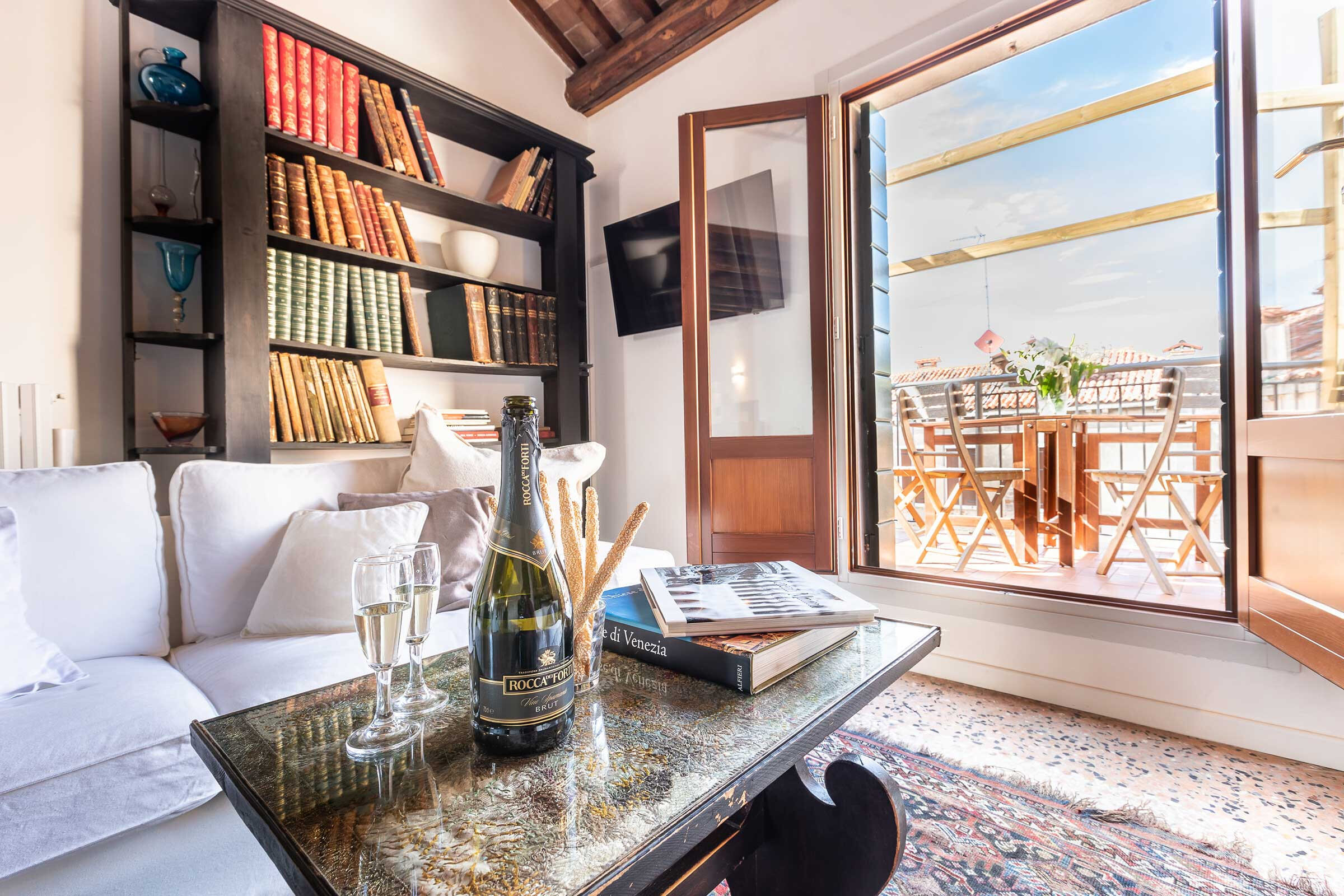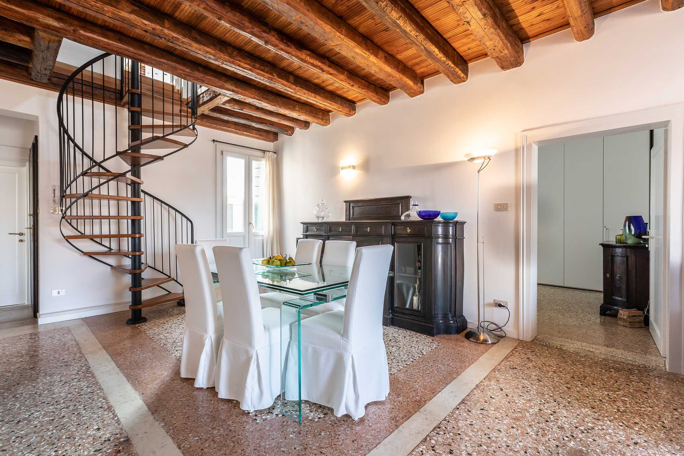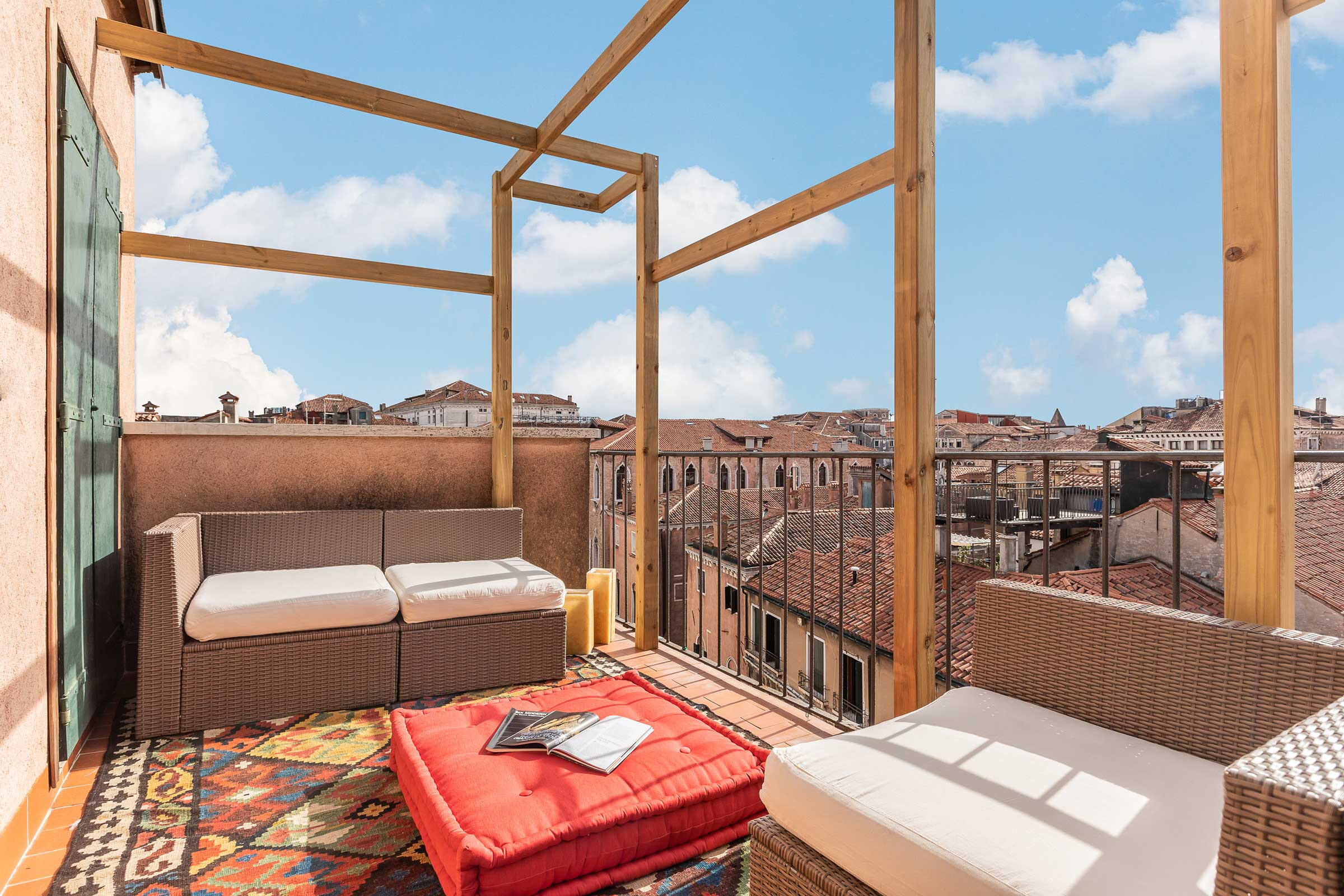 Beside the location and the exquisite interior design, the great plus of the Nabucco apartment are definitively the stunning views on the rooftops, canals and bell towers enjoyable from literally every room, besides the two panoramic terraces. The first terrace is accessible from the living room at the 4th floor, while the second terrace is accessible from the mezzanine level through a nice spiral staircase. On both terraces you can relax in total quietness and privacy being located above the surrounding buildings.