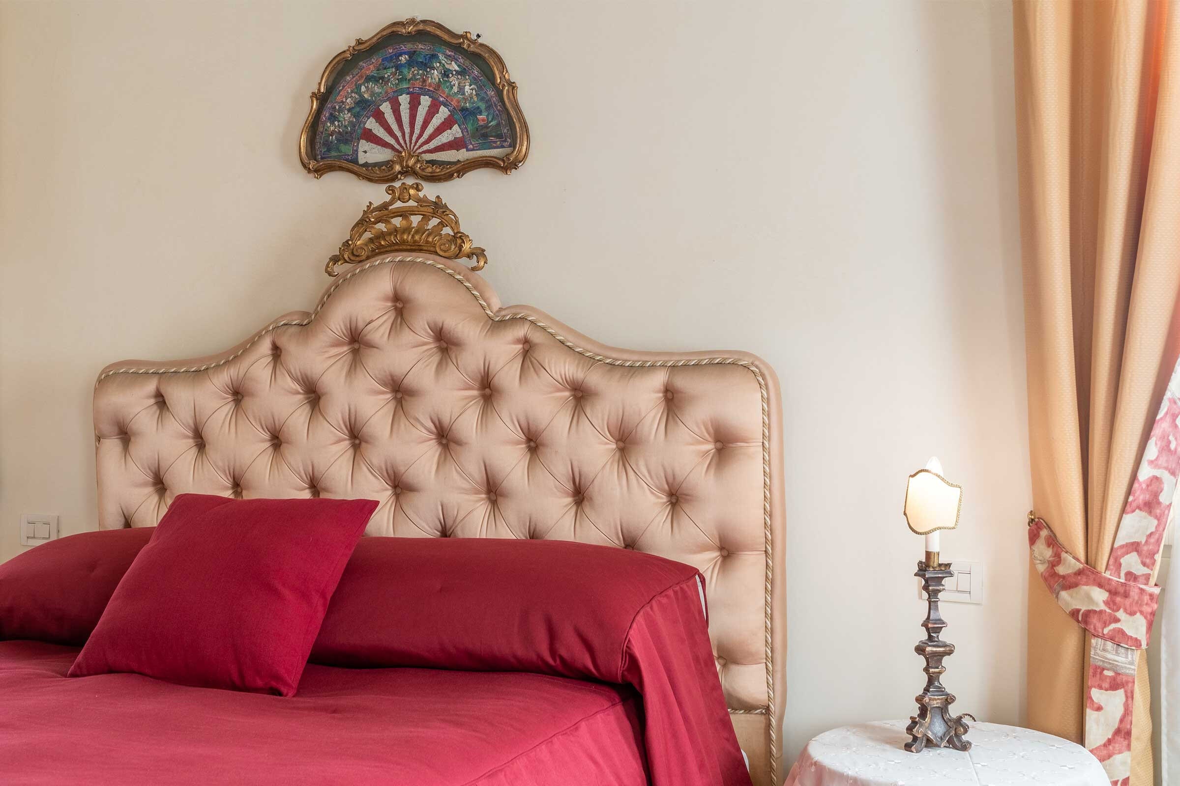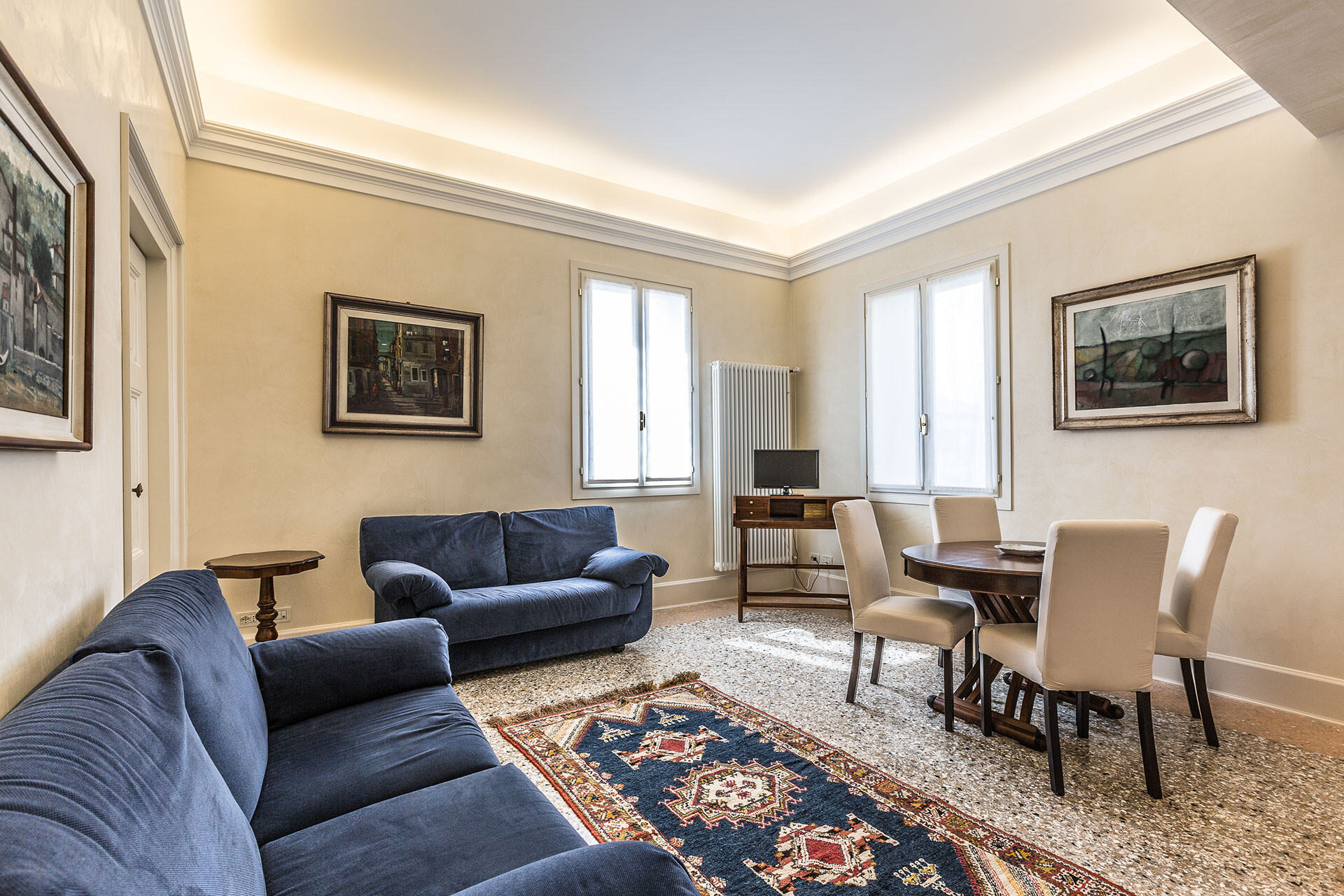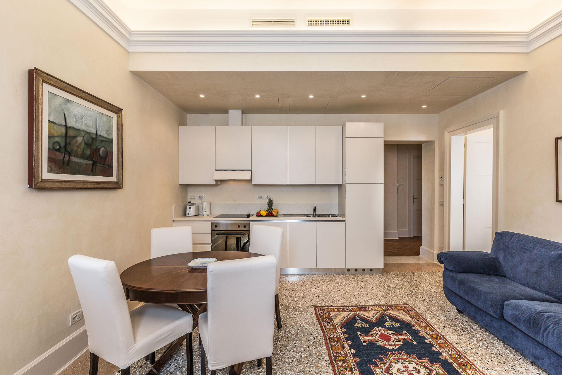 The Alighieri “B” features a very prestigious and spacious living/dining room with the most remarkable stuccoed ceiling, large windows facing Rio di San Lorenzo and offering a stunning panoramic canal view, elegant furnishing and a modern full optional kitchen for chef-proof dining up to 8 people. There is a great master bedroom with en-suite bathroom and a second room with a double sofa-bed with its bathroom. We suggest it for 2 people.