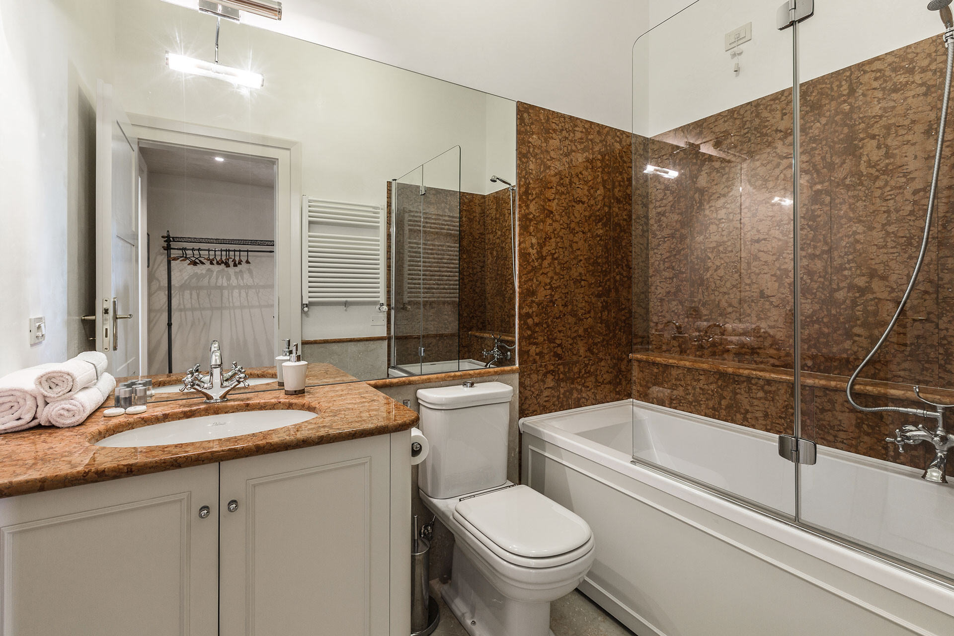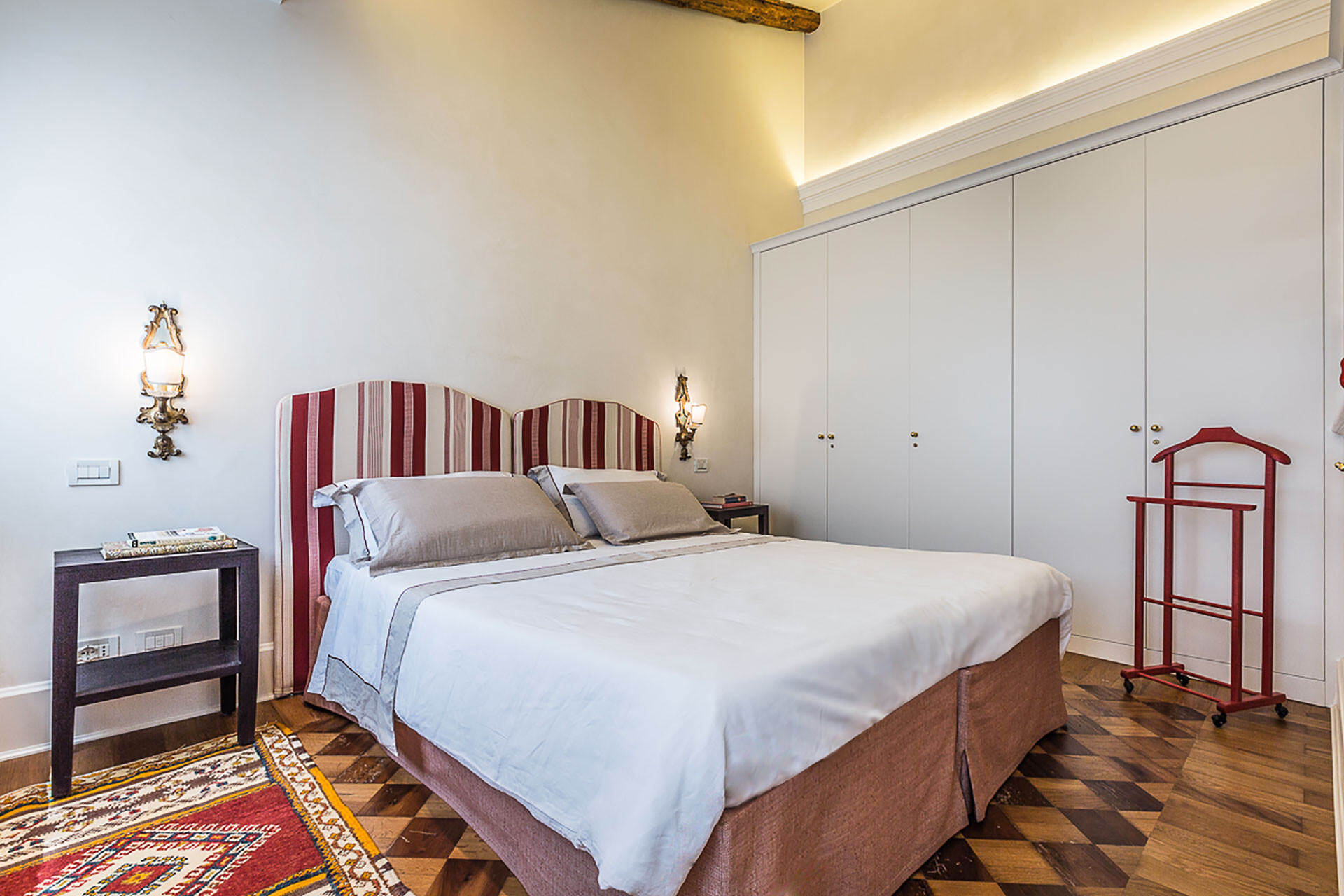 At the Alighieri “D” is composed by an elegant living room showcasing a contemporary and functional open plan kitchen, while offering very comfortable sitting space on a designer sofa. There is a grand master bedroom, where superb furnishings and plenty of natural light really enhance the beauty of this exquisite room. There is an en-suite bathroom with a bathtub and a further en-suite bathroom with shower for the second double bedroom. The apartment features a spacious attic floor that can be used as extra bedroom with double bed. In total it is suitable for up to 6 people.