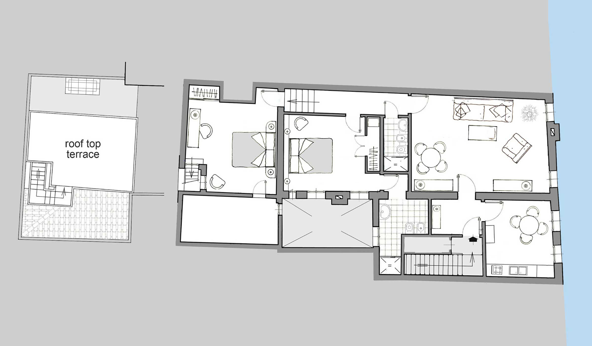 The big plus of this apartment, besides the great location and the quality of the accommodation, is the large wooden roof-top terrace, the so called Altana, where you can dine open-air, have a drink or just sunbathe.