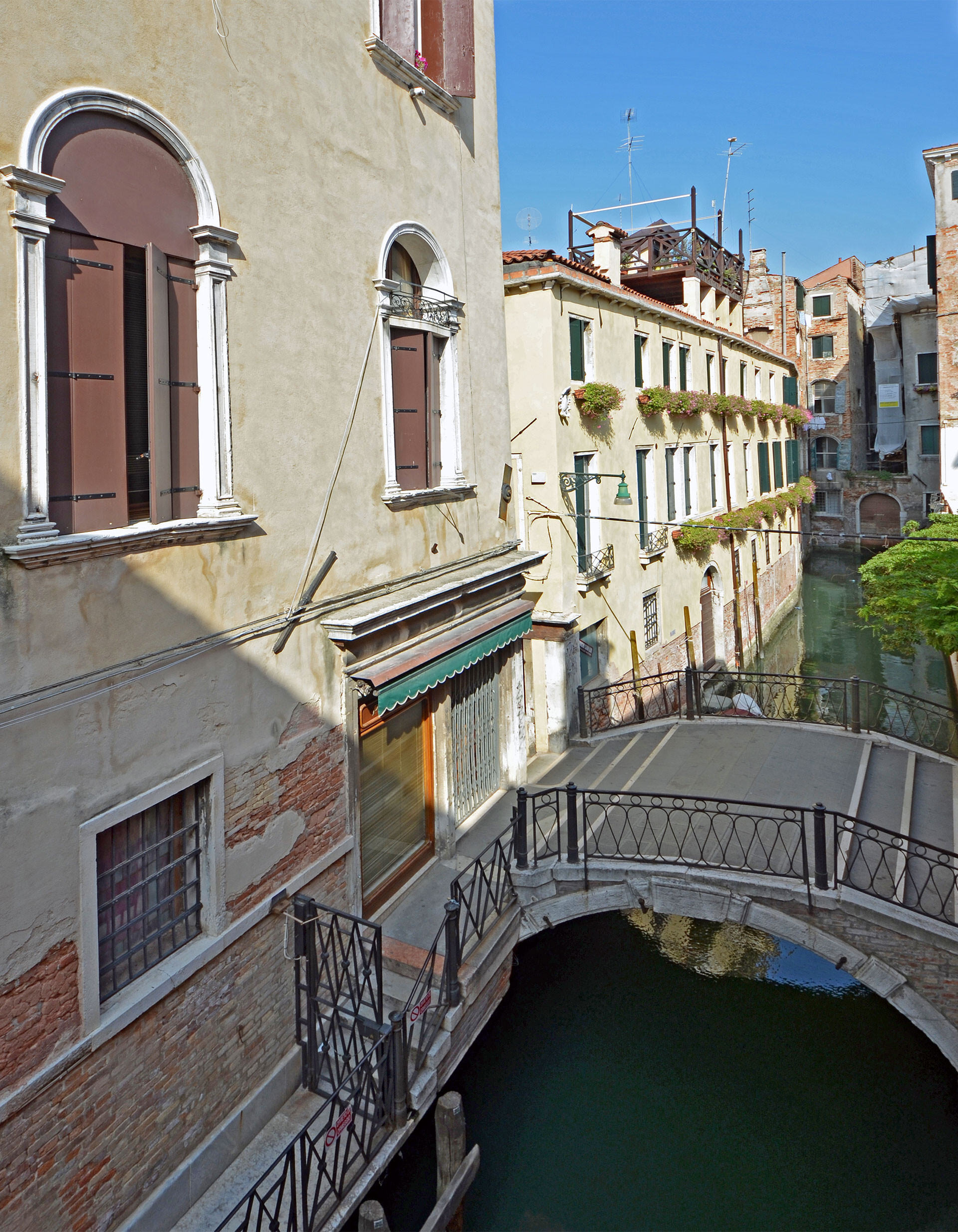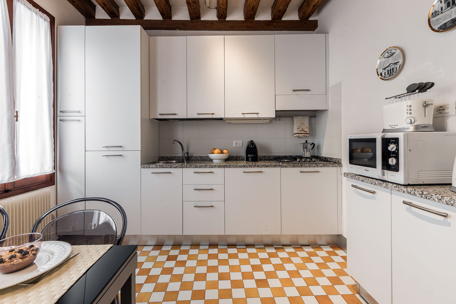 The Querini is a second-floor apartment of about 120 square meters, recently renovated and smartly furnished to please the most demanding guests. Walking in the entrance room you immediately understand that this is a real home, not an impersonal tourist accommodation. In fact, the spacious and cozy living room furnished with beautiful antiques easily communicates with a very functional and airy kitchen, equipped with every possible amenity (except the oven!). The canal view enjoyable from the living room and kitchen windows is not particularly open but definitely picturesque.