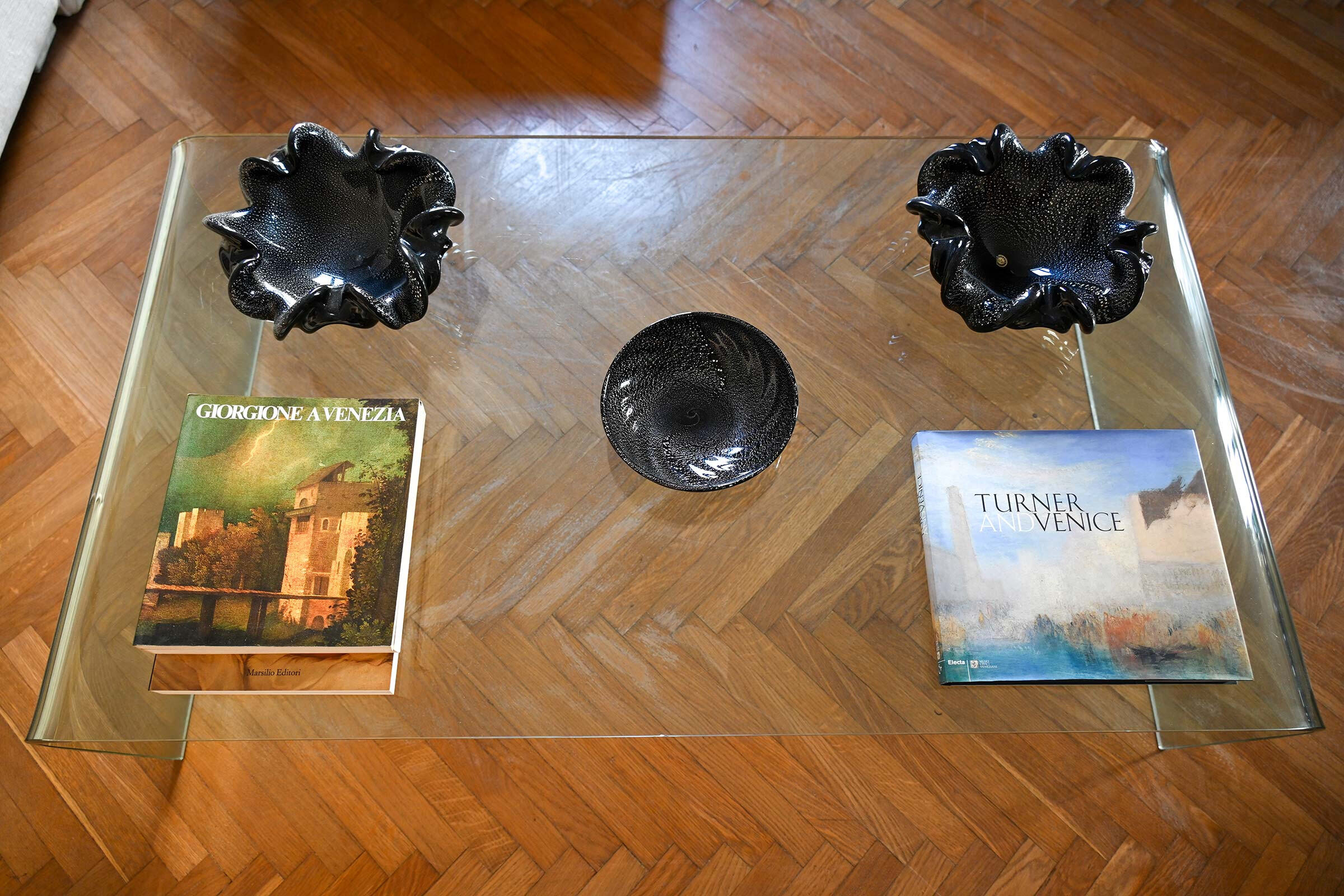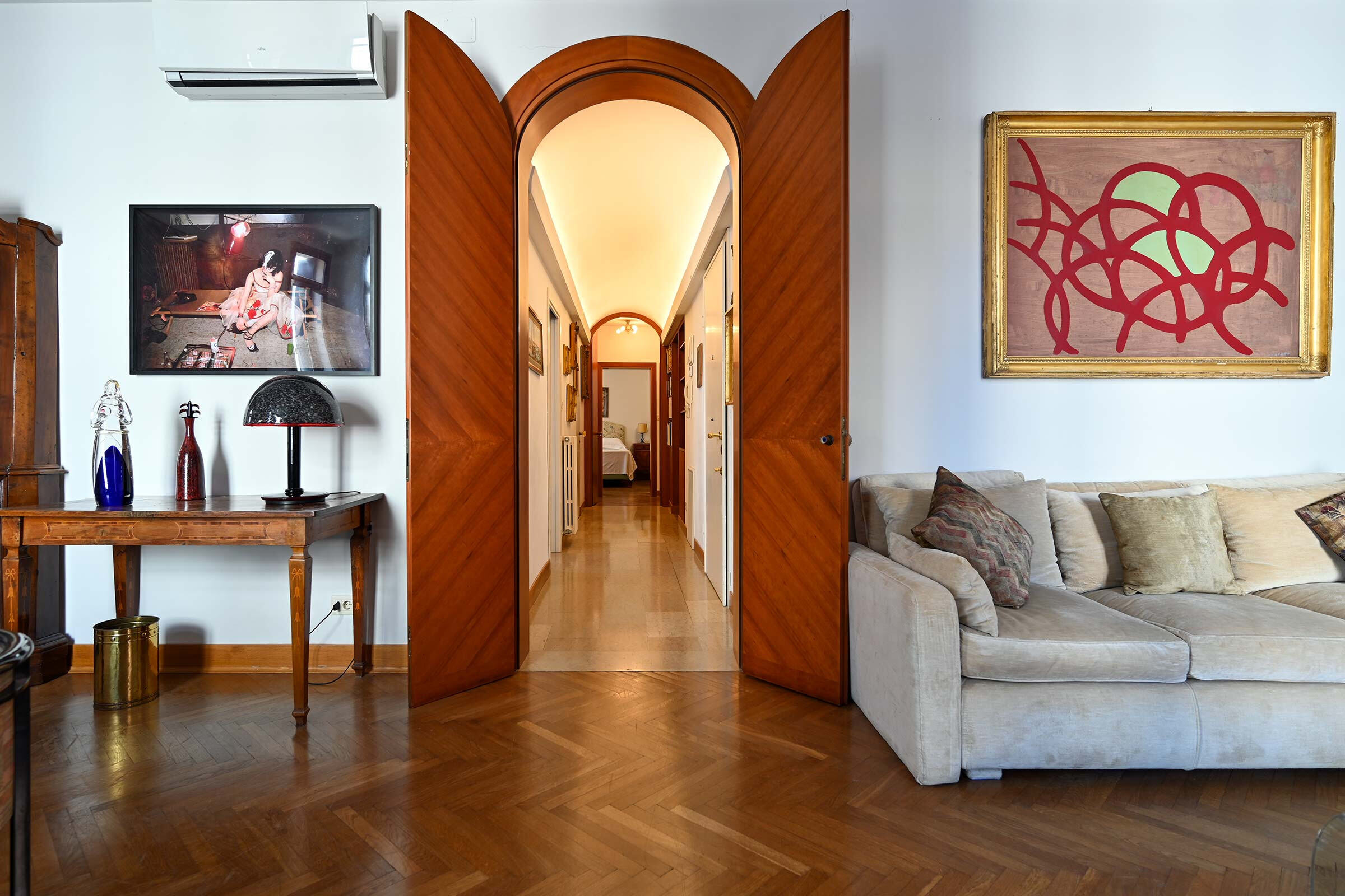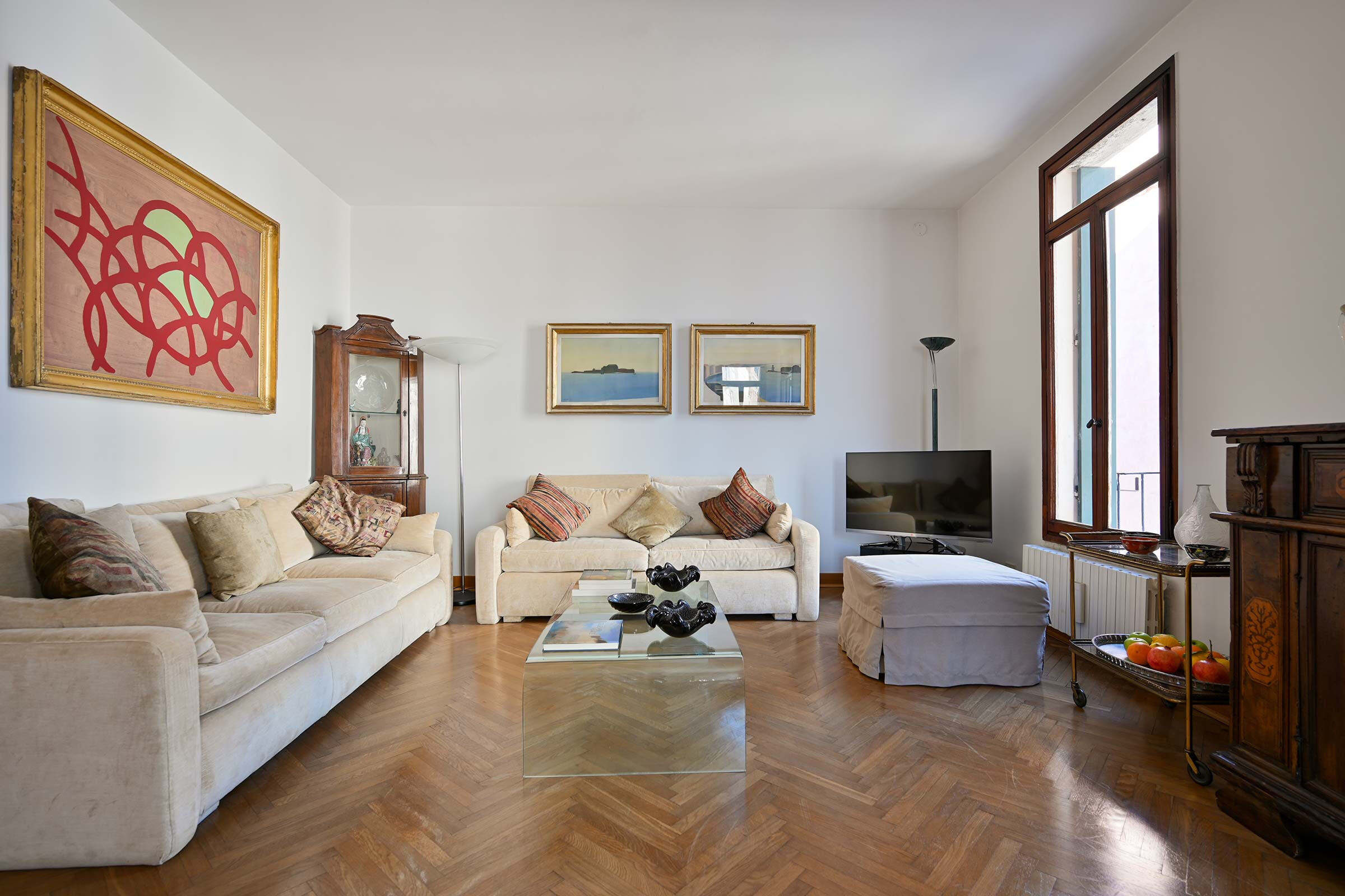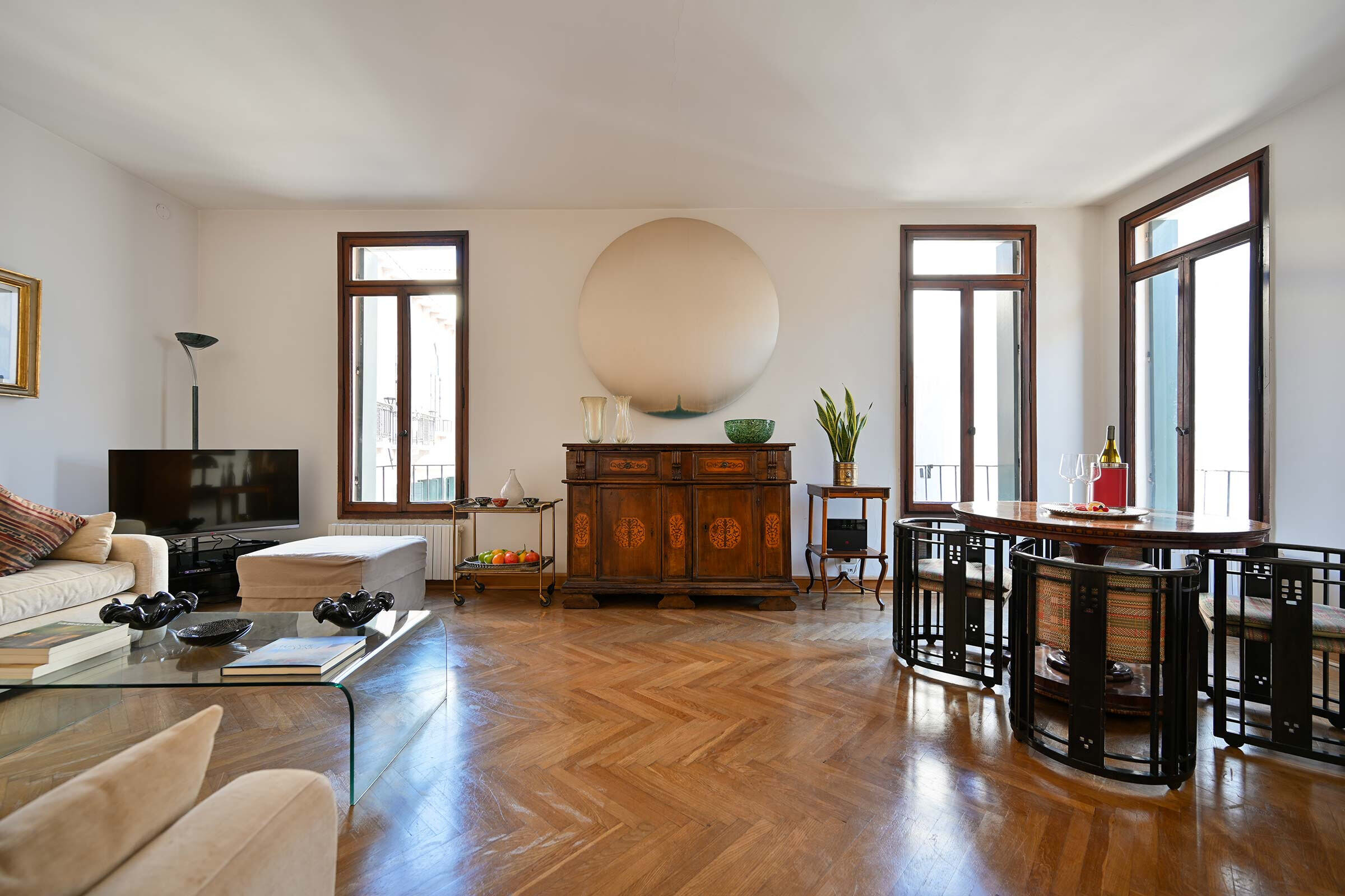 The apartment is flooded with natural light all day long. Elegant interiors and remarkable artworks confer prestige and a welcoming feeling. It is laid out on about 100 square meters: entering the central corridor you can access the spacious living room on the left, the functional and well-equipped kitchen, or the bedrooms area on the right. The living room is the most important room for its incomparable panoramic view that ranges from the Canal, to the Church, to the Square and historical buildings all around! Each window offers a different perspective on the beautiful surroundings, including the San Marco Bell Tower and the Grand Canal on the background.