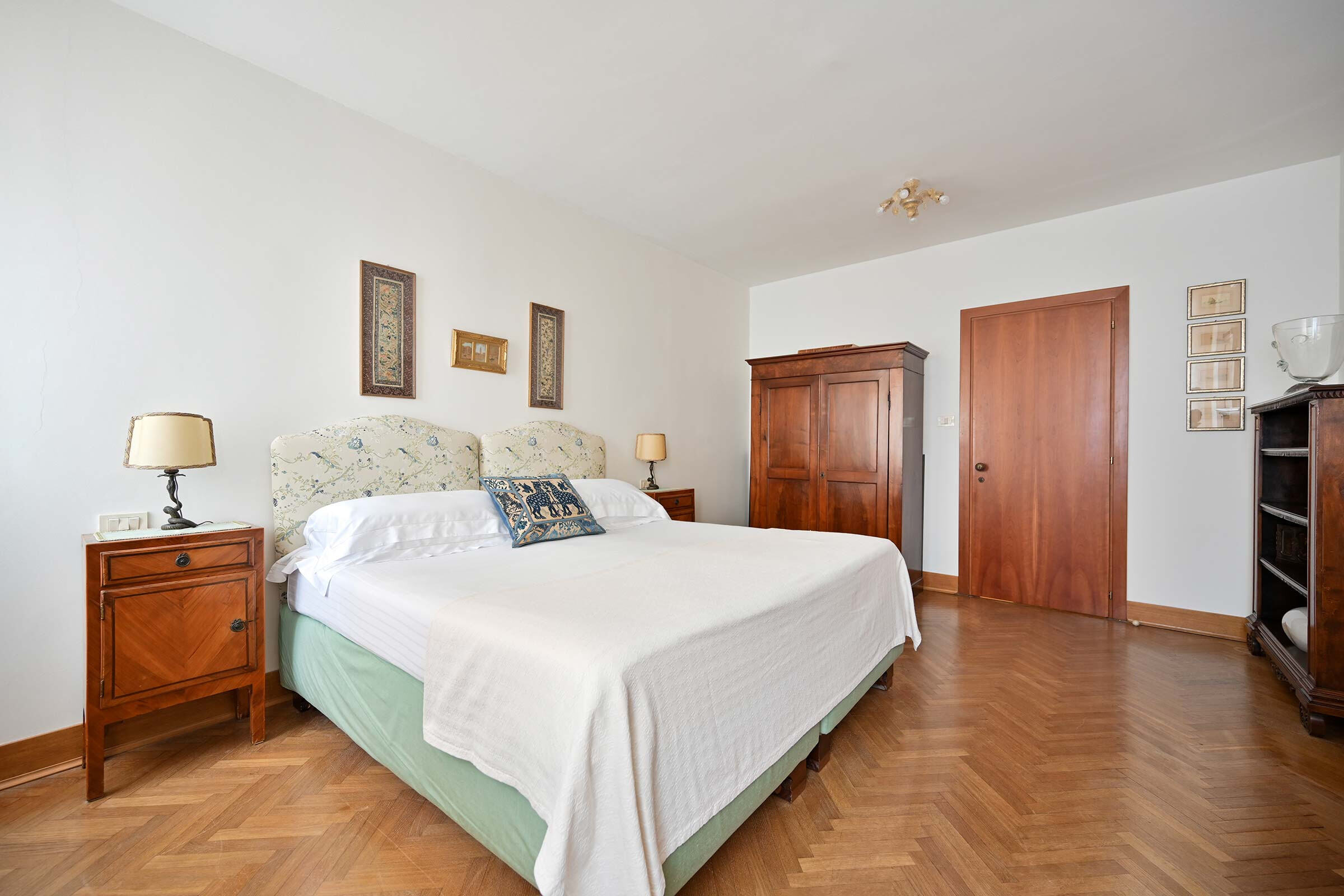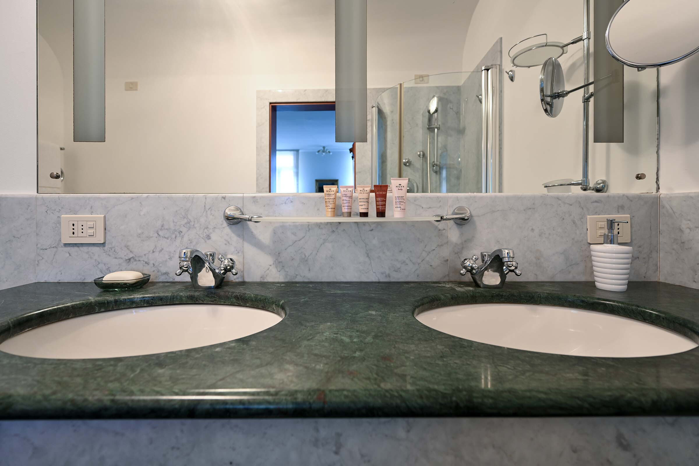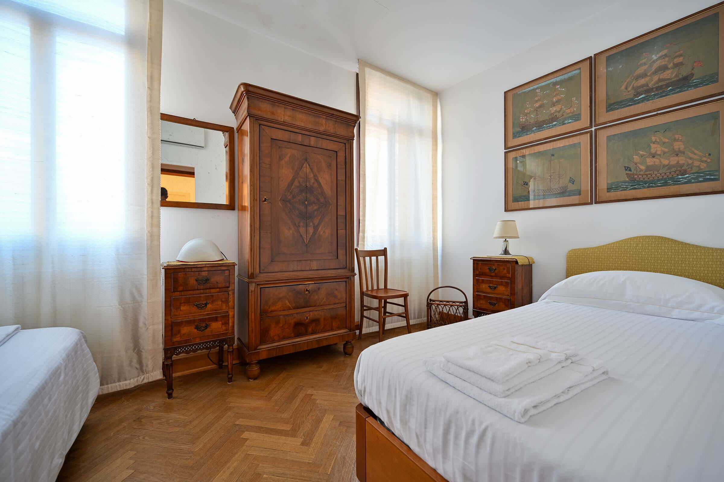 The master bedroom is also very spacious and bright, furnished with nice antique wardrobe and chest of drawers, with direct access to a remarkable white and green marble en-suite bathroom, fitted with both bathtub and large shower cabin. The second bedroom in much smaller and is furnished with two single beds and a small wardrobe. A second smaller bathroom with shower, fitted also with washer and dryer, completes the picture.