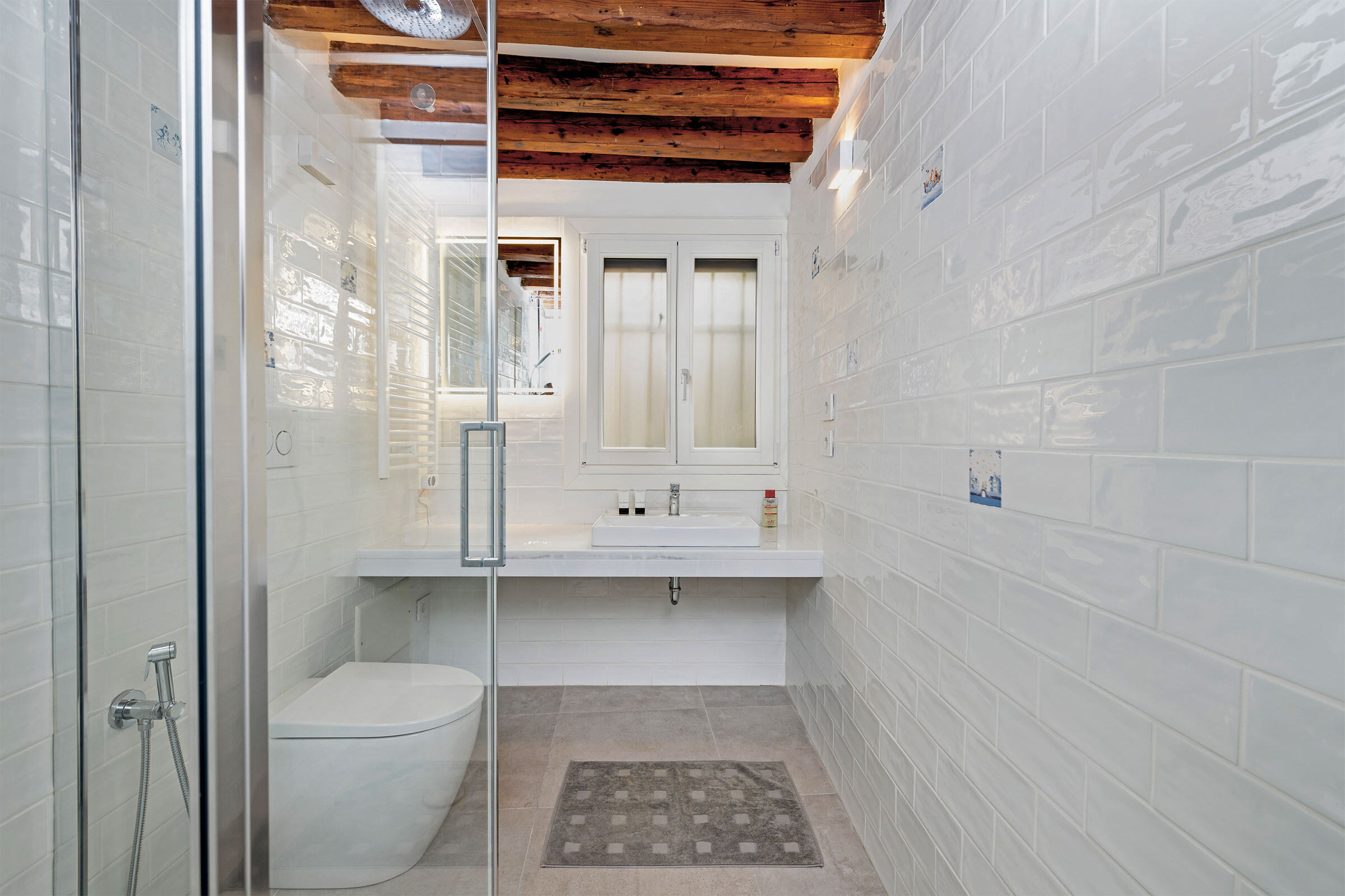 Design lovers will appreciate the carefully curated contemporary style interior design blended with some old-school charm, such as antique wooden beams, terrazzo Veneziano flooring and stone old stone portals.