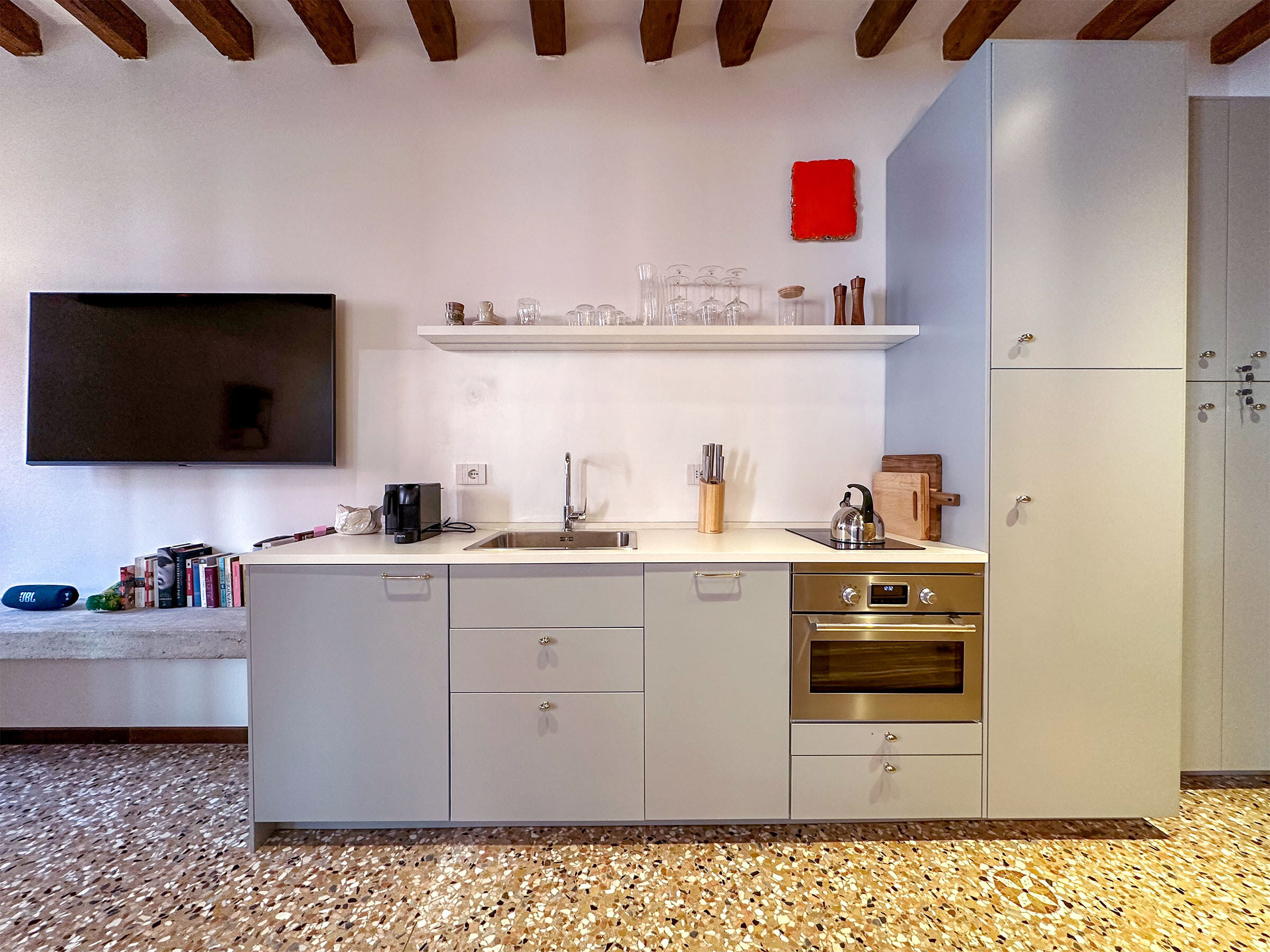 There is a bright and spacious bedroom with king size mattress, plenty of closets, Smart TV, and a beautiful bathroom with shower cabin. The apartment is equipped with Wi-Fi, A/C in every room and independent heating system. The Tiziano hosts 2 people, but the sofa-bed can be arranged on request.