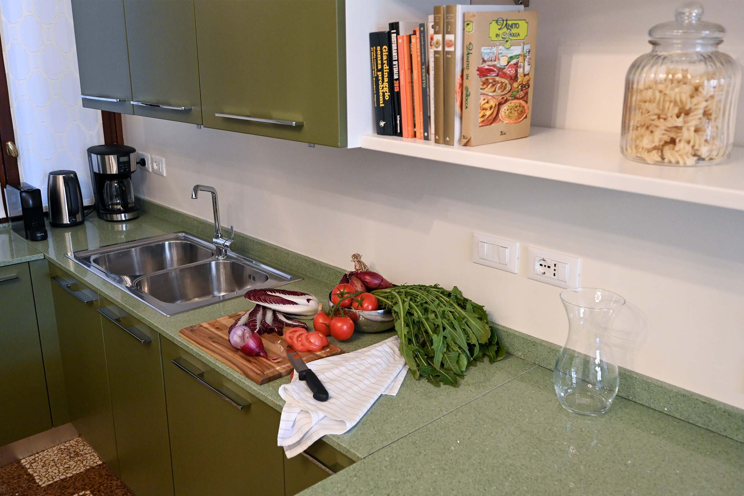 The apartment is laid out on about 120 square meters and is composed of a large living and dining room (the so called “salone”) furnished with a big and very comfortable double sofa-bed, an antique library full of interesting books, and an antique wooden table that can seat up to 6 people. Next to it, a spacious and fully functional kitchen equipped with a set of professional cooking pots, pans, utensils, tableware and porcelains, large fridge with freezer, 4 gas stoves, dishwasher, oven, microwave, kettle, toaster, Nespresso machine and American coffee maker.