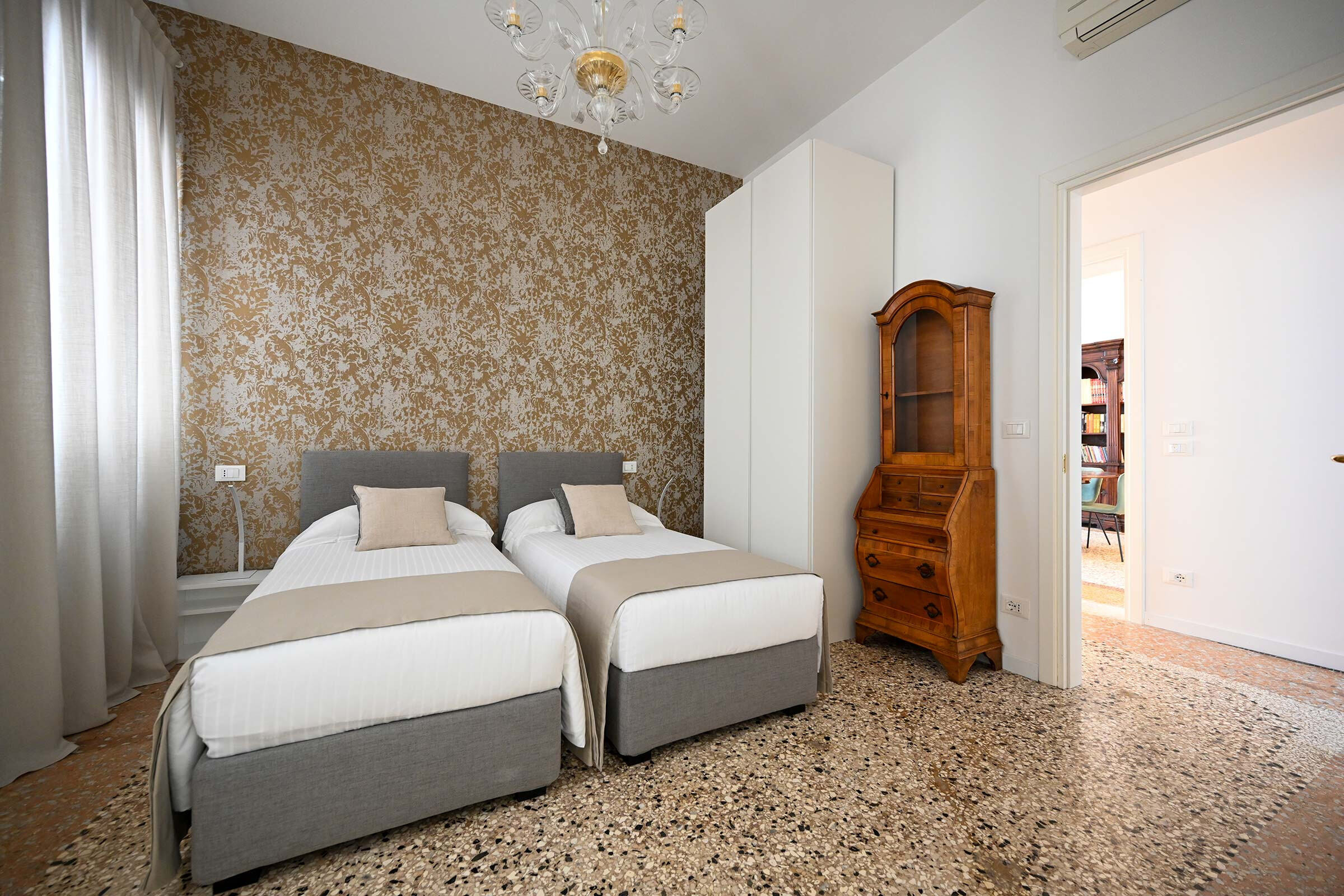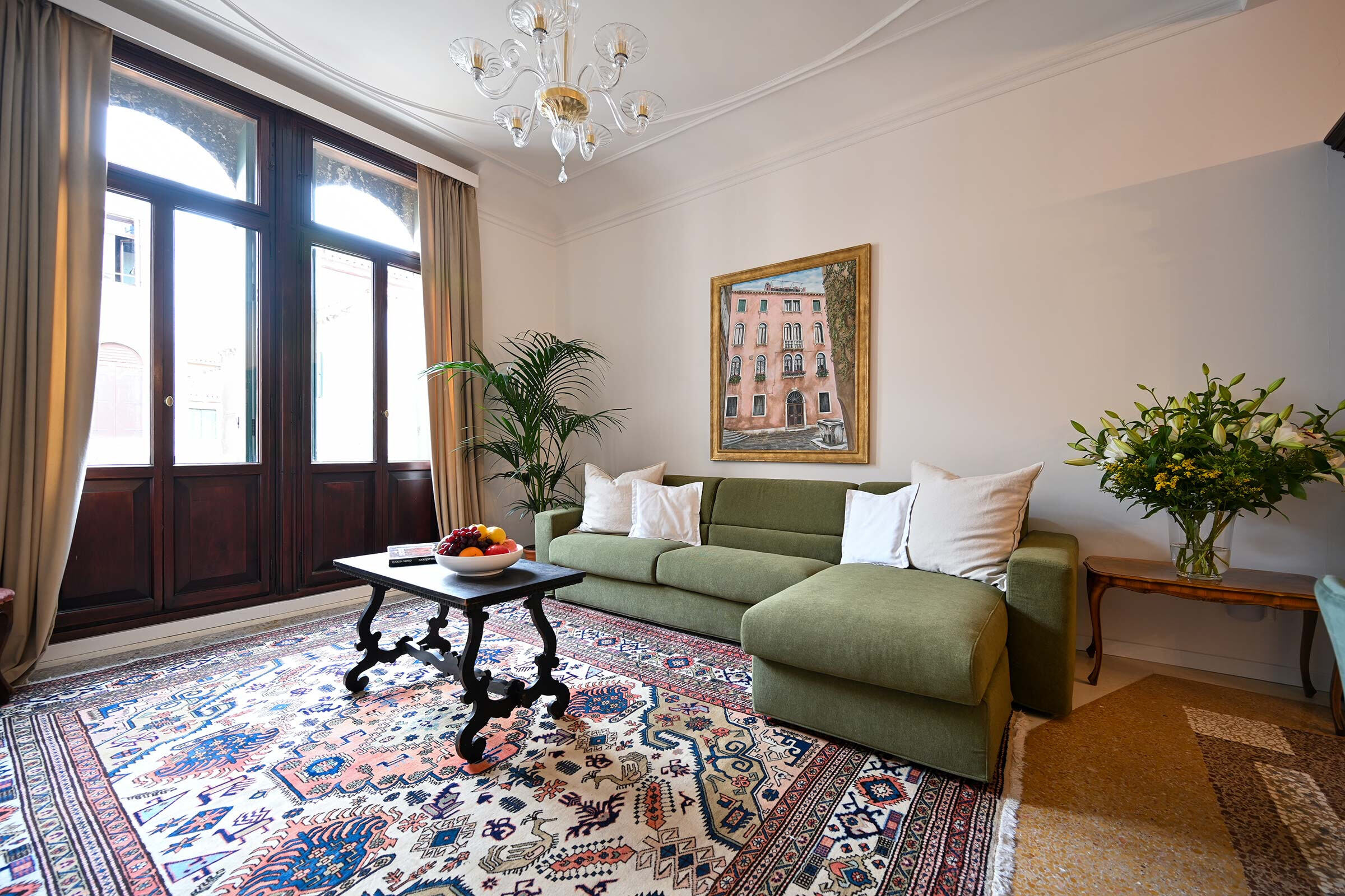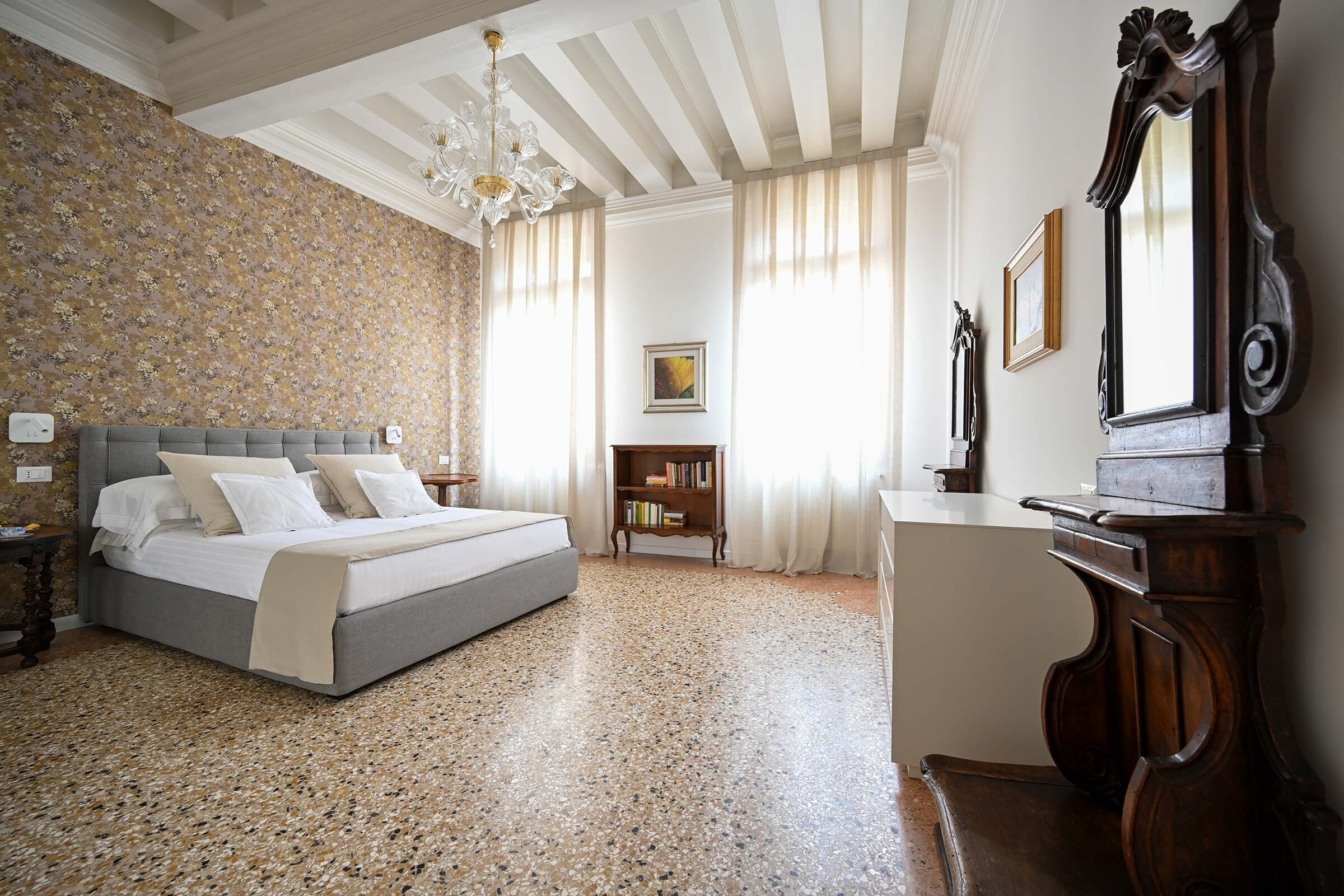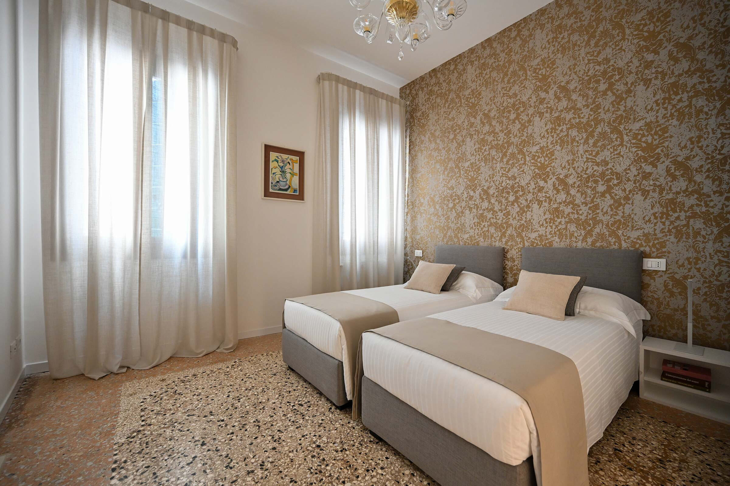 Recently renovated, it is found at the 2nd floor of an historic Palazzo long-time owned by a Venetian family. It is full of natural light and is elegantly furnished with beautiful antiques smartly blended with contemporary pieces. The original XIX century Venetian Terrazzo flooring and the tall ceilings perfectly merge with the original Murano Glass Chandeliers from the Pauly Collection, the paintings decorating the walls and the textured fabrics of curtains, beds and sofa. The result is a classic Venetian and comfortable ambience which accommodates anyone’s taste.