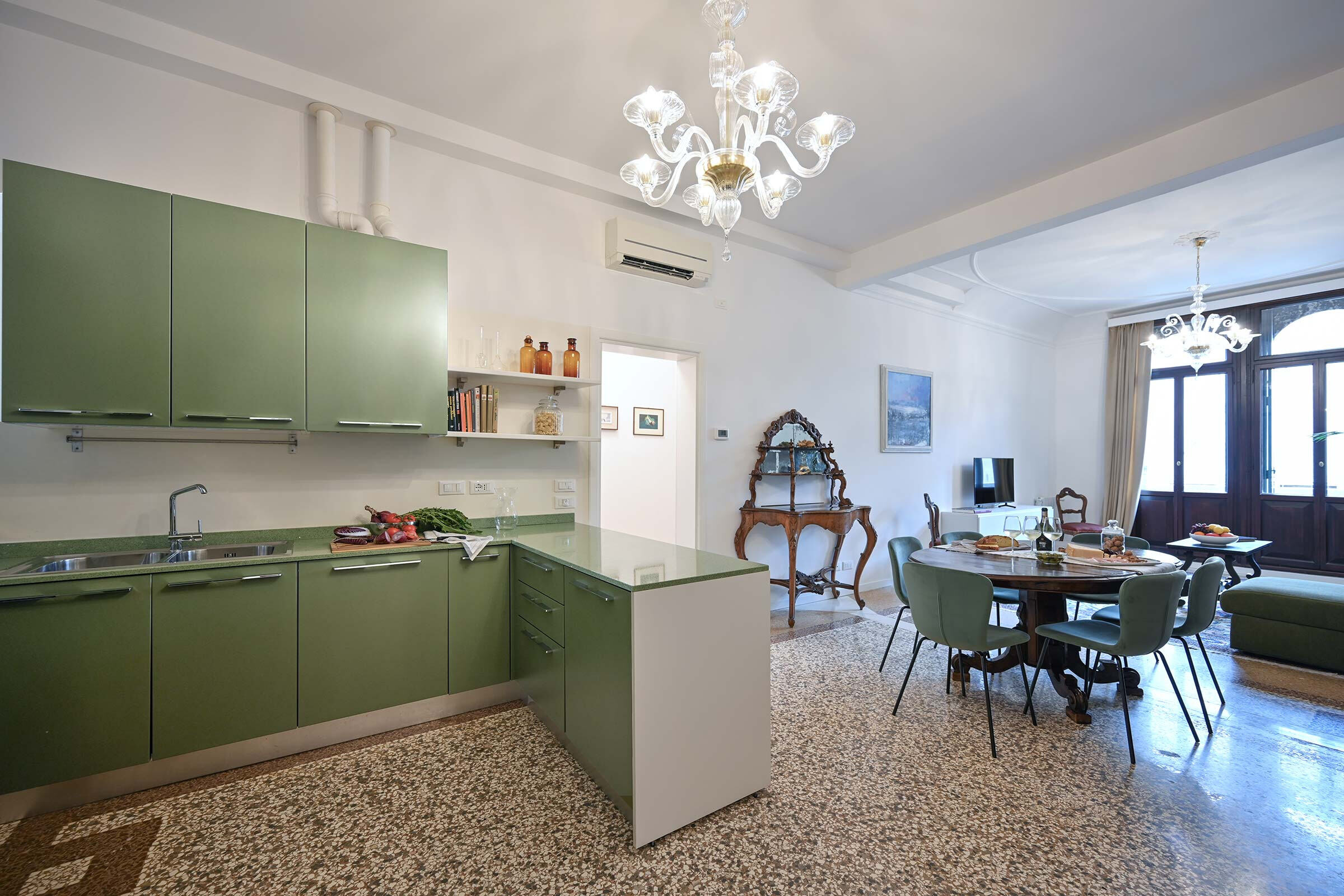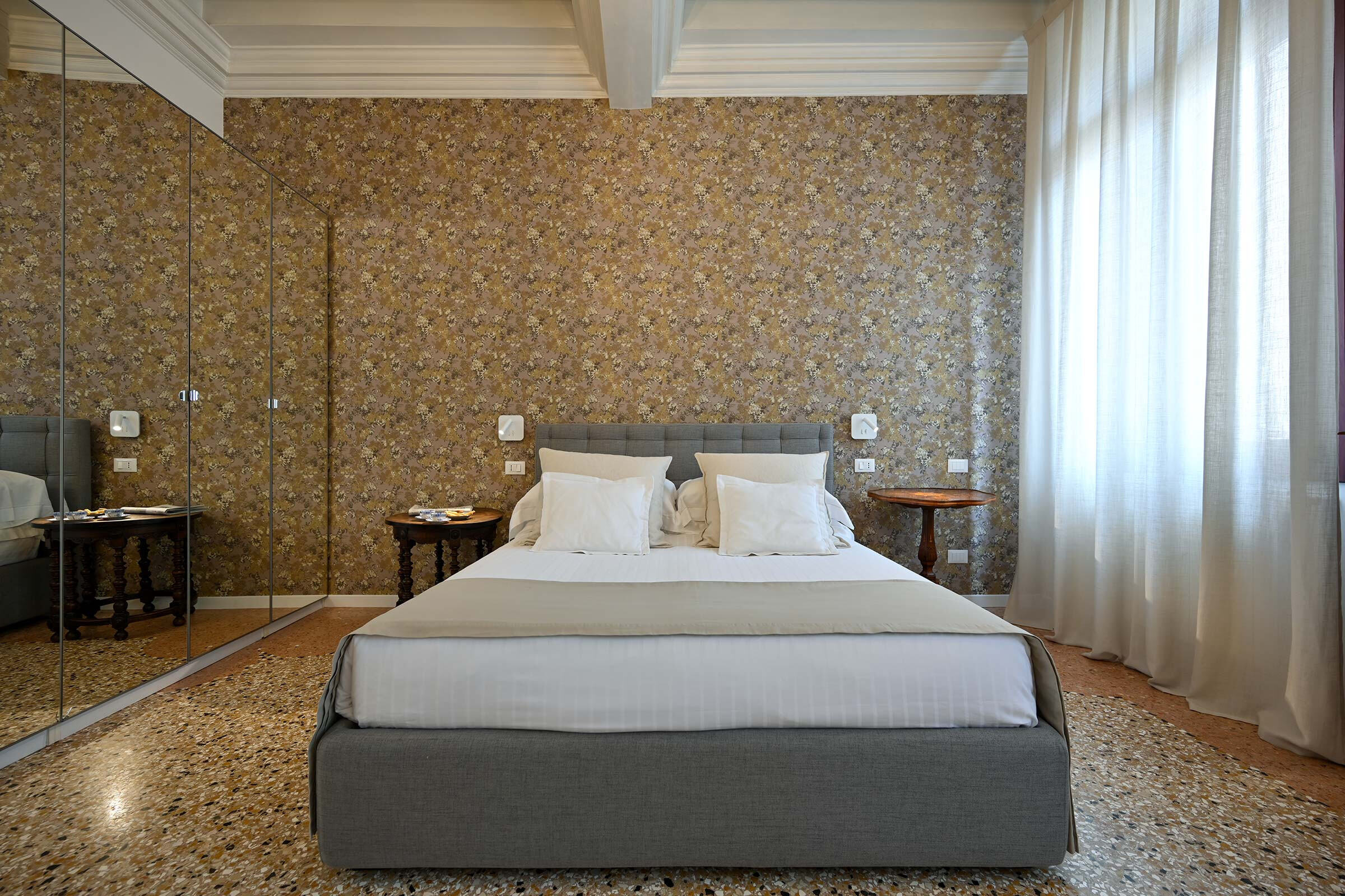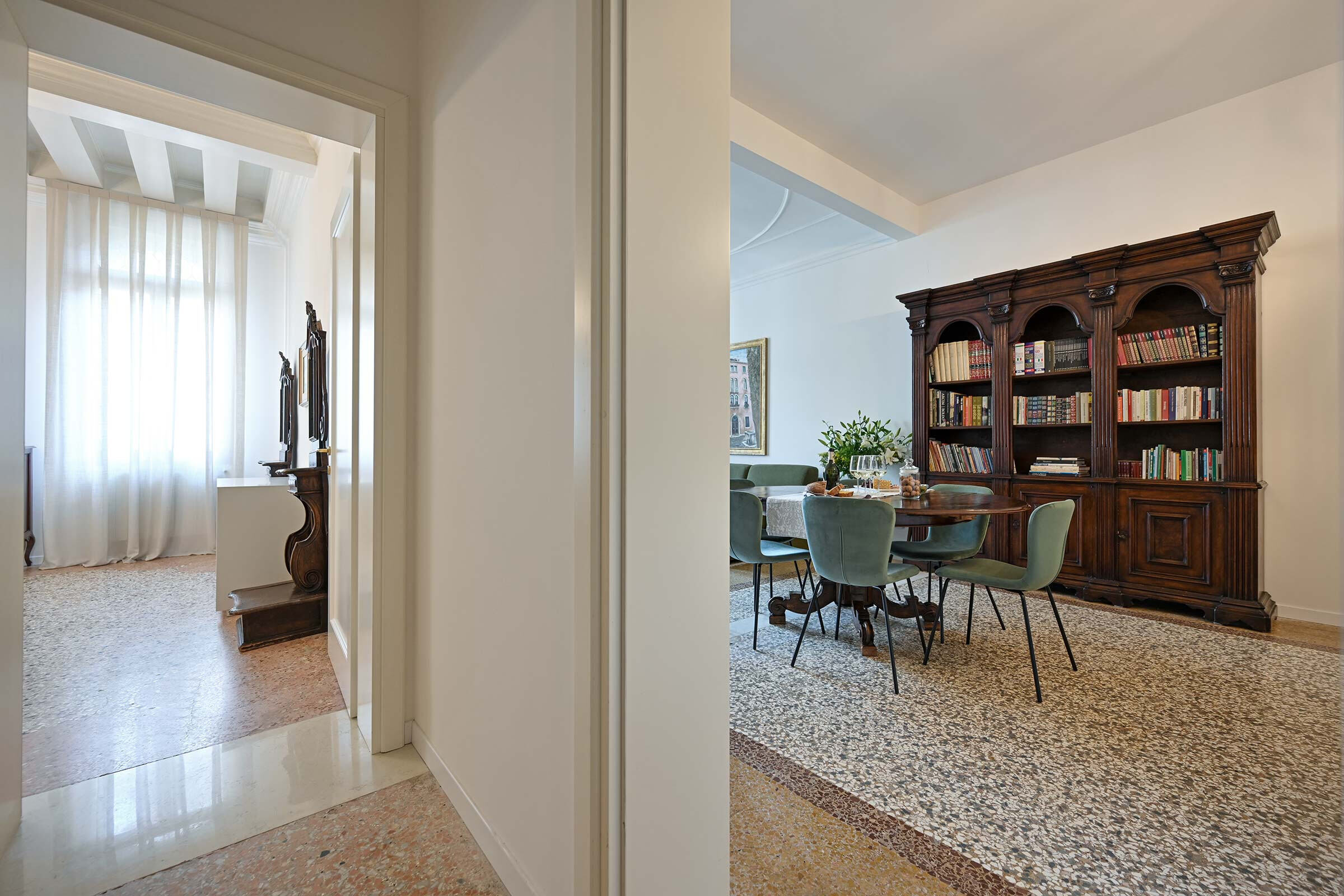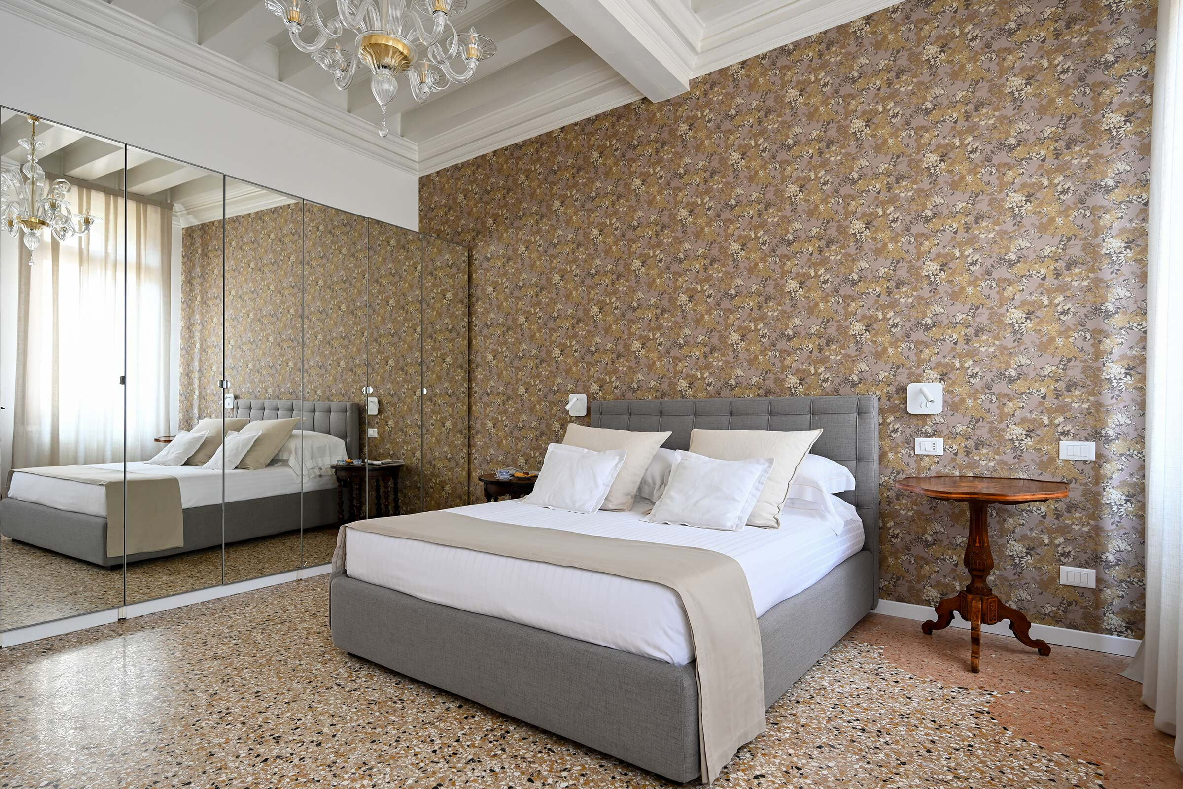 Recently renovated, it is found at the 2nd floor of an historic Palazzo long-time owned by a Venetian family. It is full of natural light and is elegantly furnished with beautiful antiques smartly blended with contemporary pieces. The original XIX century Venetian Terrazzo flooring and the tall ceilings perfectly merge with the original Murano Glass Chandeliers from the Pauly Collection, the paintings decorating the walls and the textured fabrics of curtains, beds and sofa. The result is a classic Venetian and comfortable ambience which accommodates anyone’s taste.