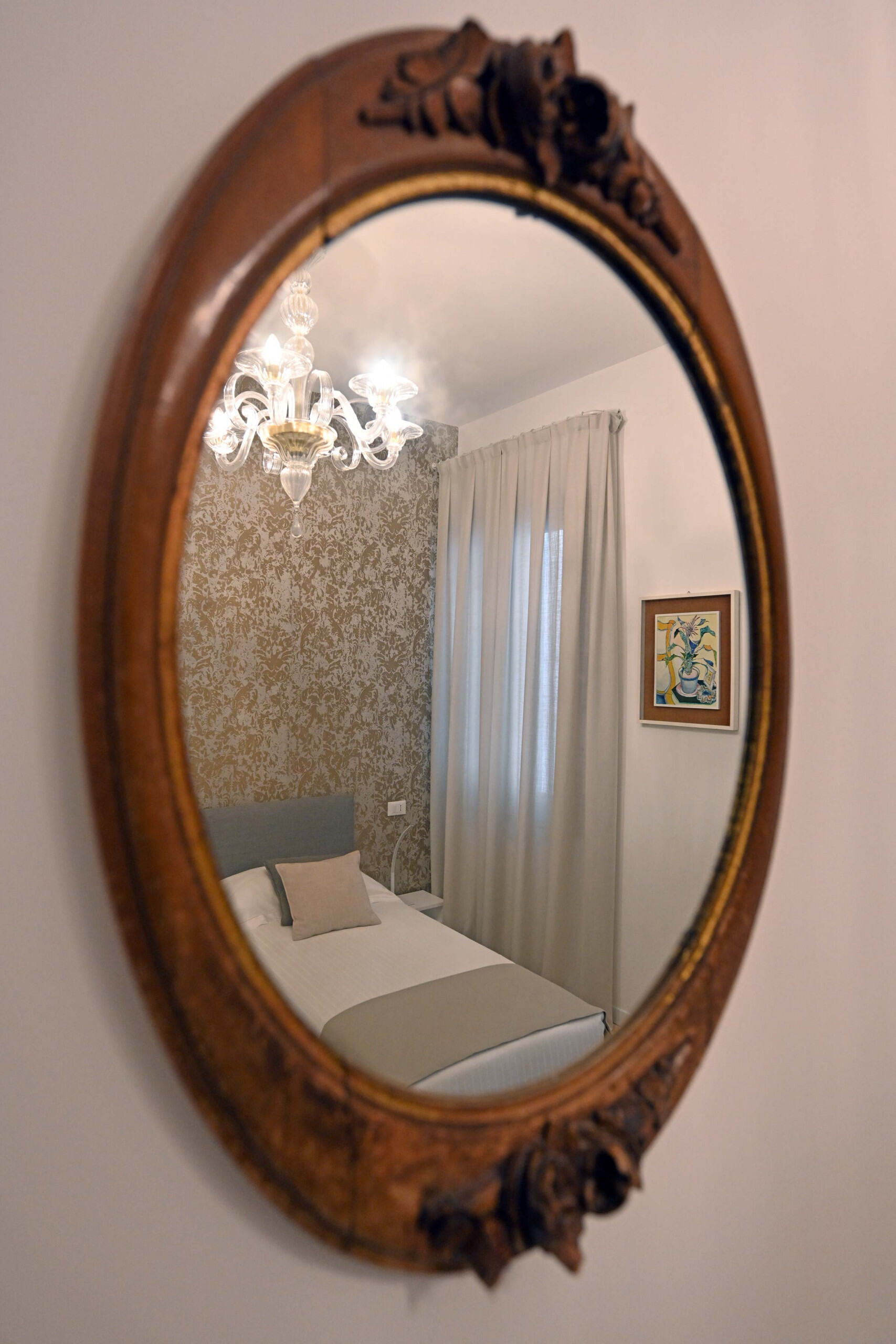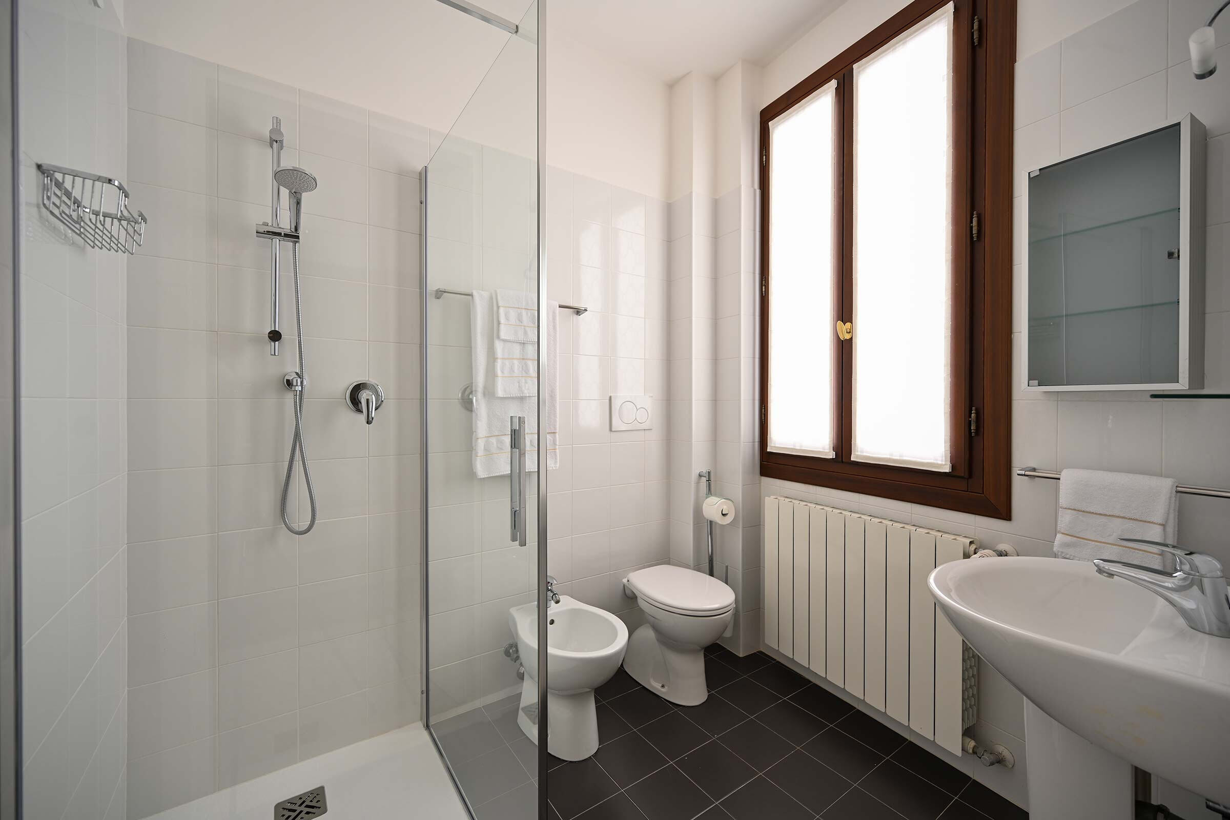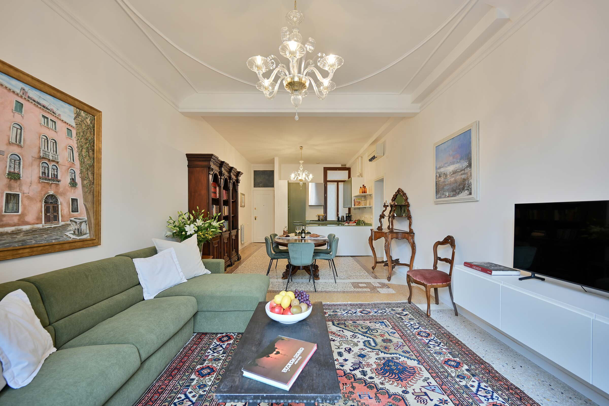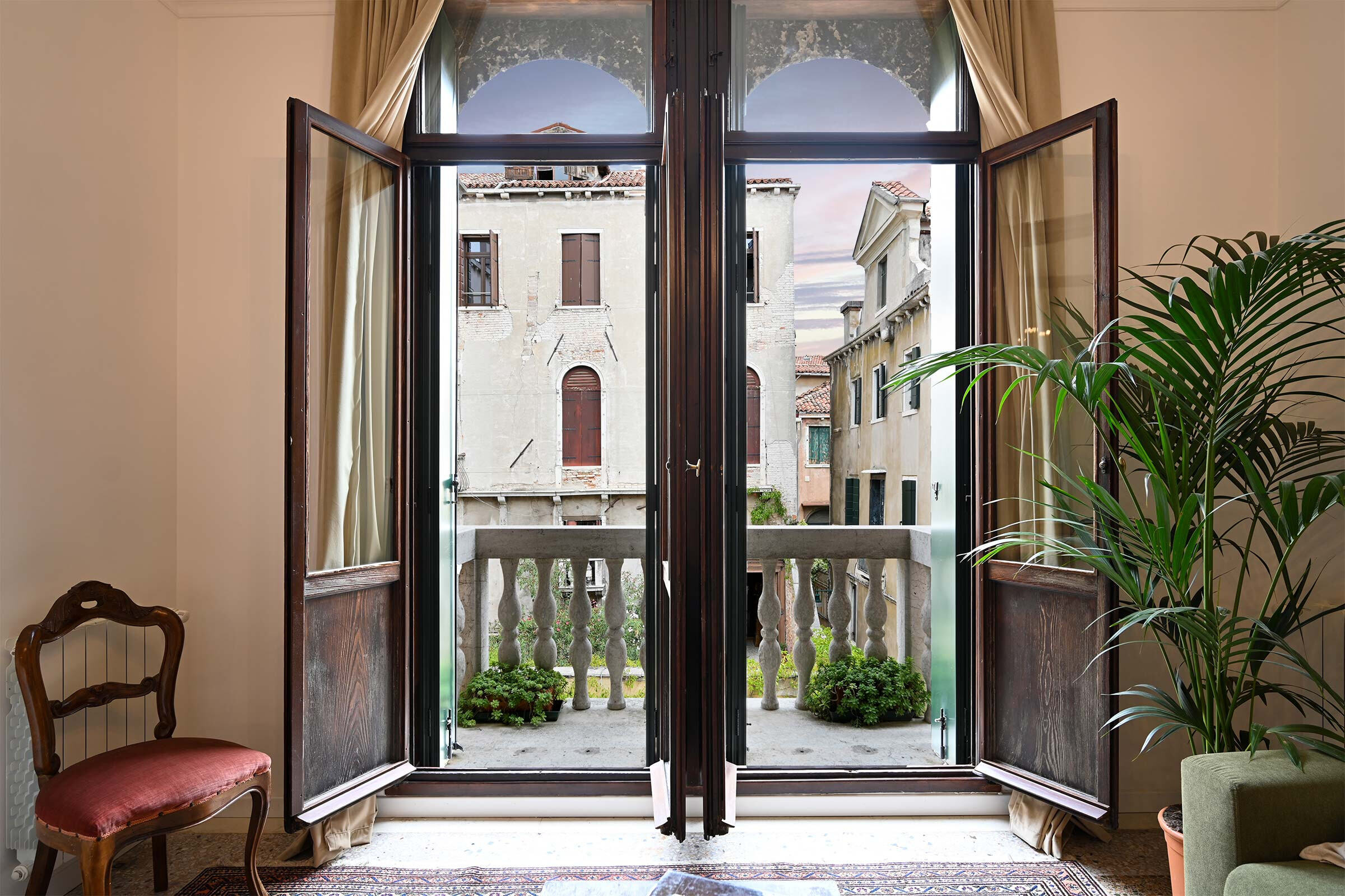Recently renovated, it is found at the 2nd floor of an historic Palazzo long-time owned by a Venetian family. It is full of natural light and is elegantly furnished with beautiful antiques smartly blended with contemporary pieces. The original XIX century Venetian Terrazzo flooring and the tall ceilings perfectly merge with the original Murano Glass Chandeliers from the Pauly Collection, the paintings decorating the walls and the textured fabrics of curtains, beds and sofa. The result is a classic Venetian and comfortable ambience which accommodates anyone’s taste.